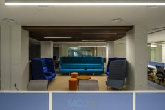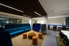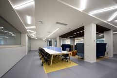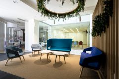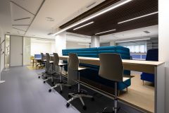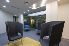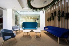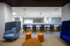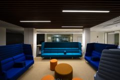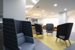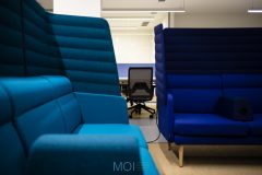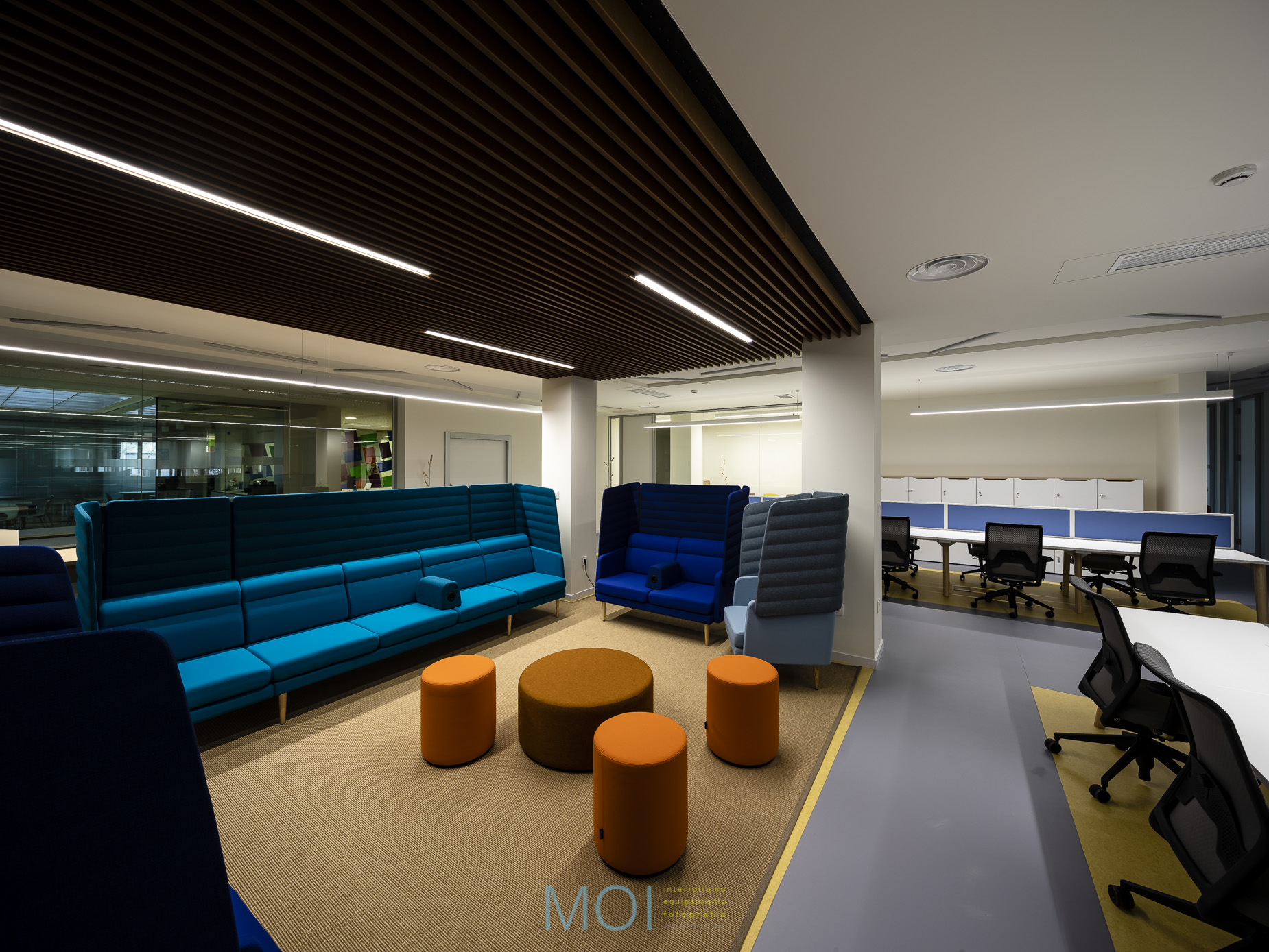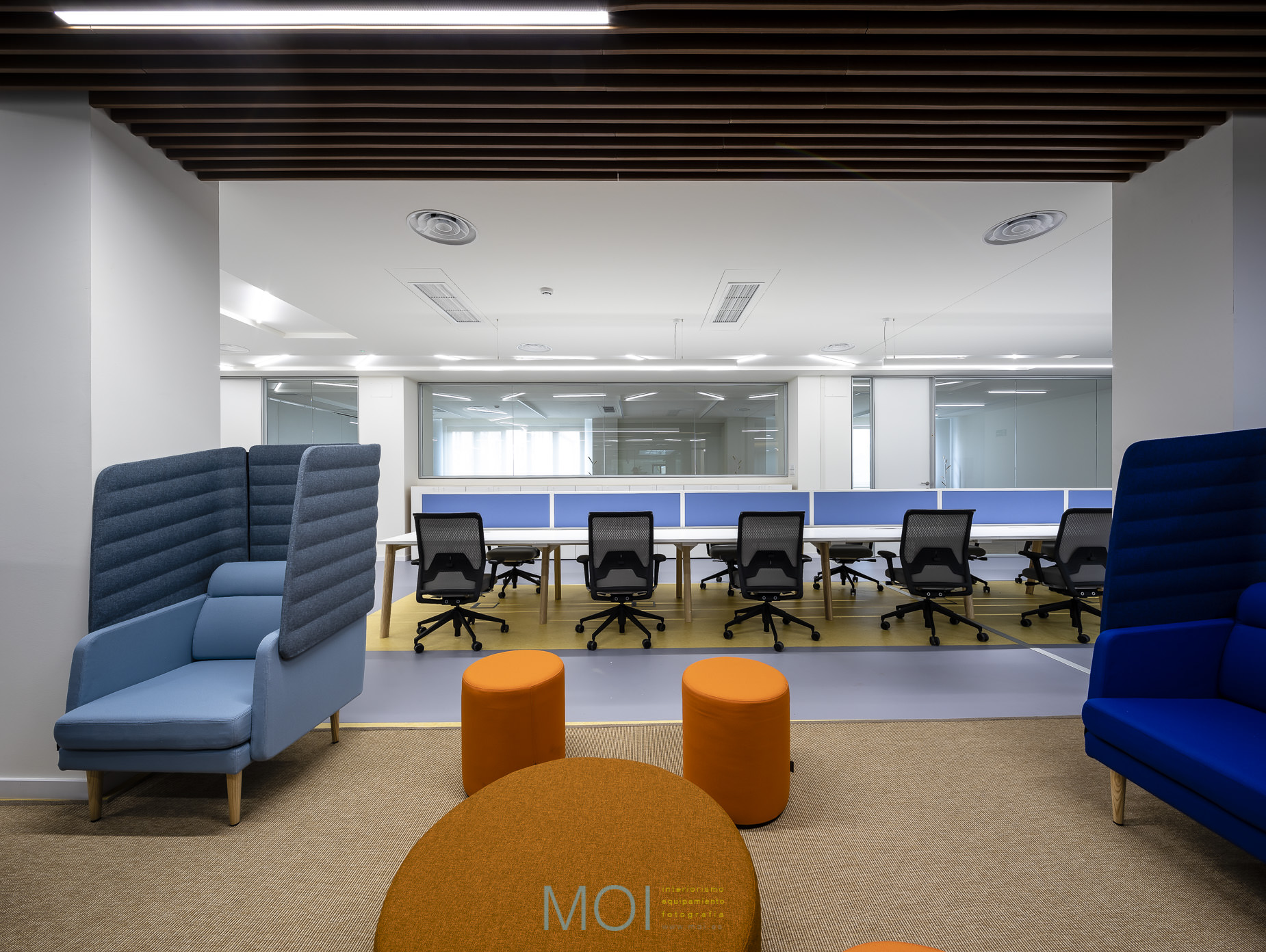 Estas mesas abrazan una tercera zona más relajada en el que unos sofás tipo alcoba generan un espacio tipo lounge en el que se puede trabajar de manera más desenfadada.