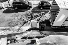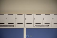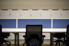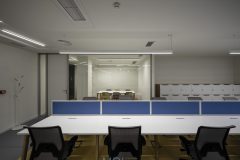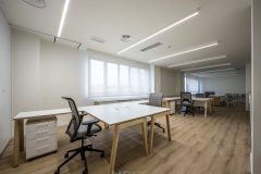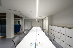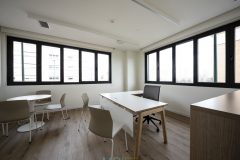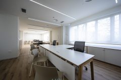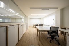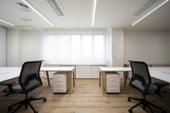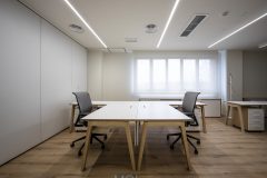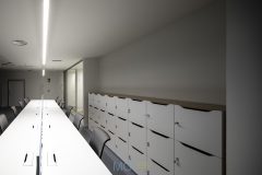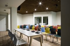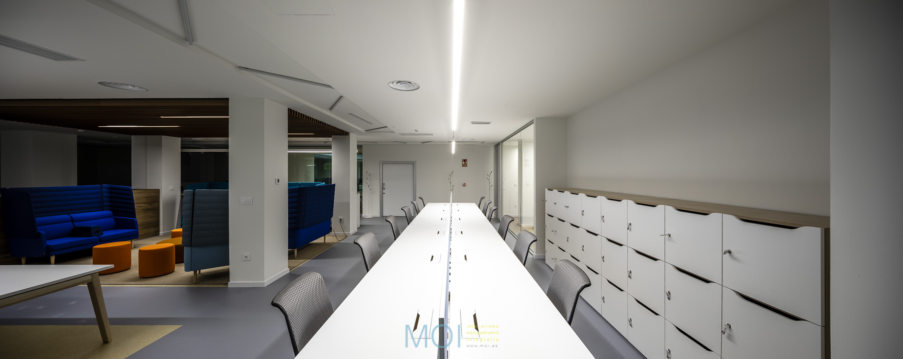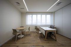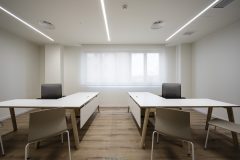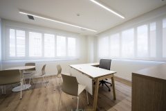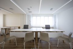 Por otro lado se sitúa el coworking en el que dos grandes mesas tipo bench albergan 24 puestos de trabajo. Empleando la misma estructura de madera que en los despachos y los mismos acabados, se genera una tipología muy distinta en el que los usuarios no tendrán un puesto fijo sino que irán ocupando uno u otro según sus necesidades, guardando sus pertenencias en las taquillas.