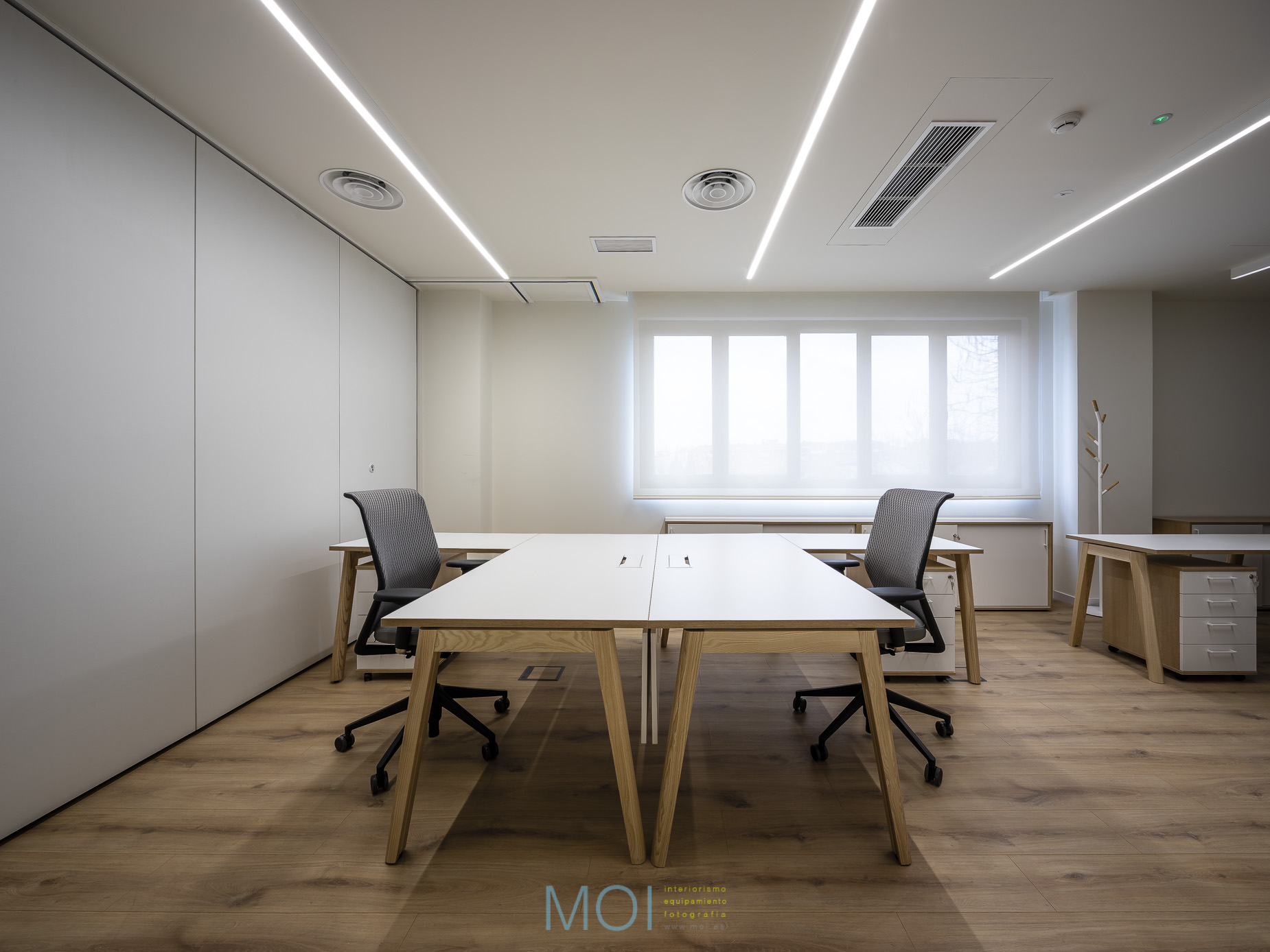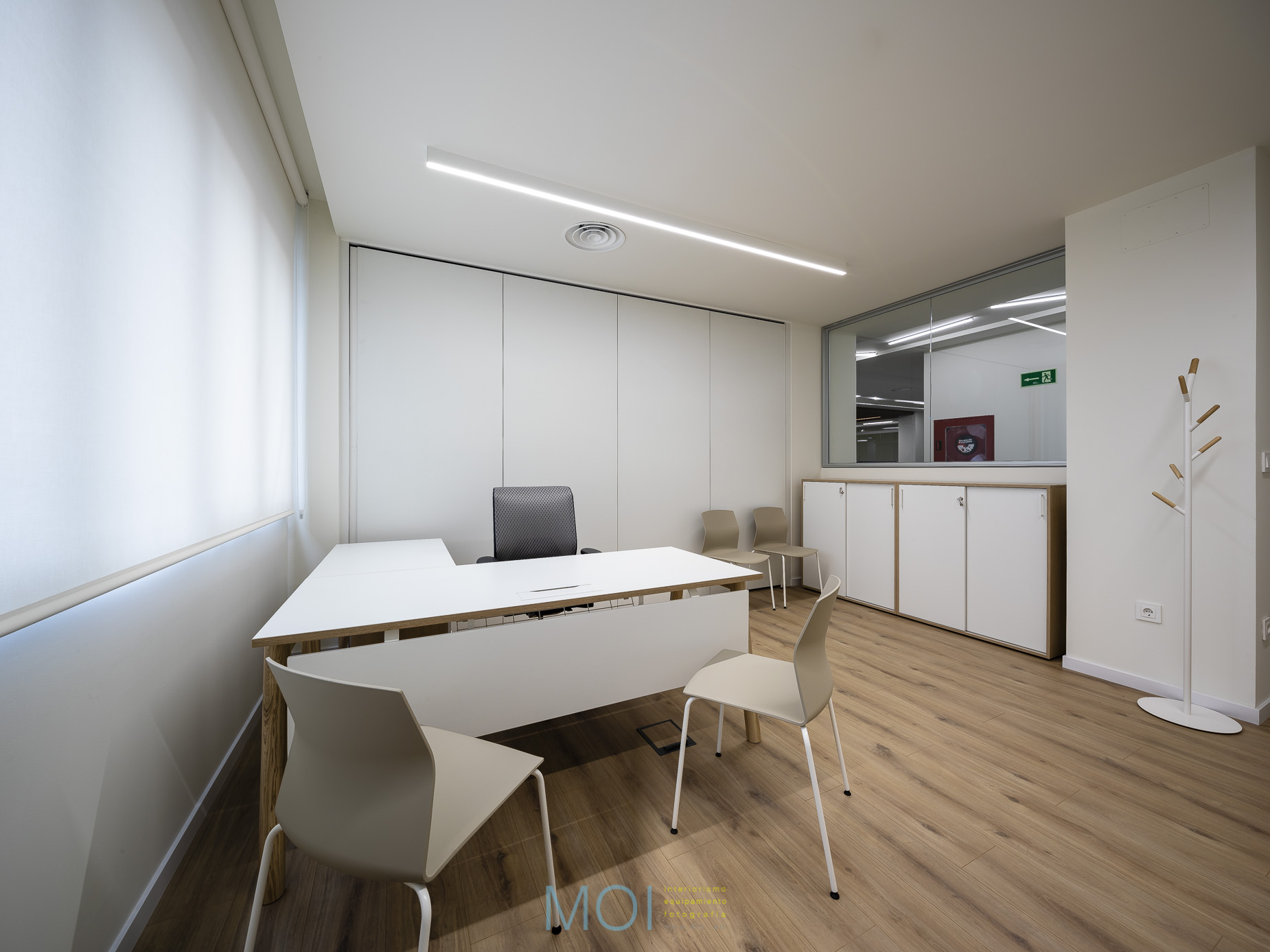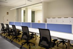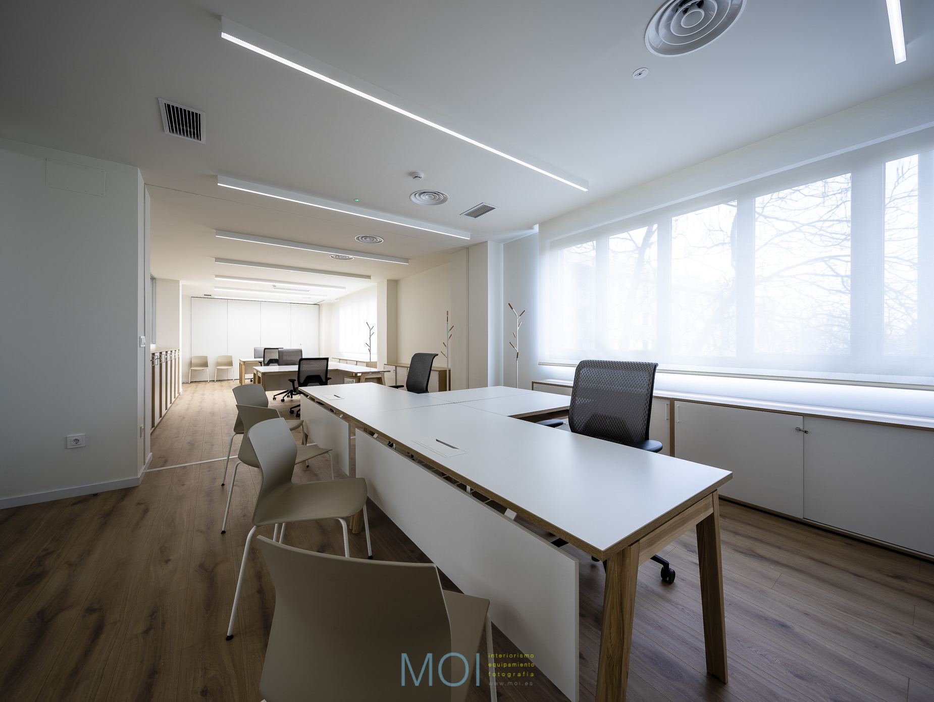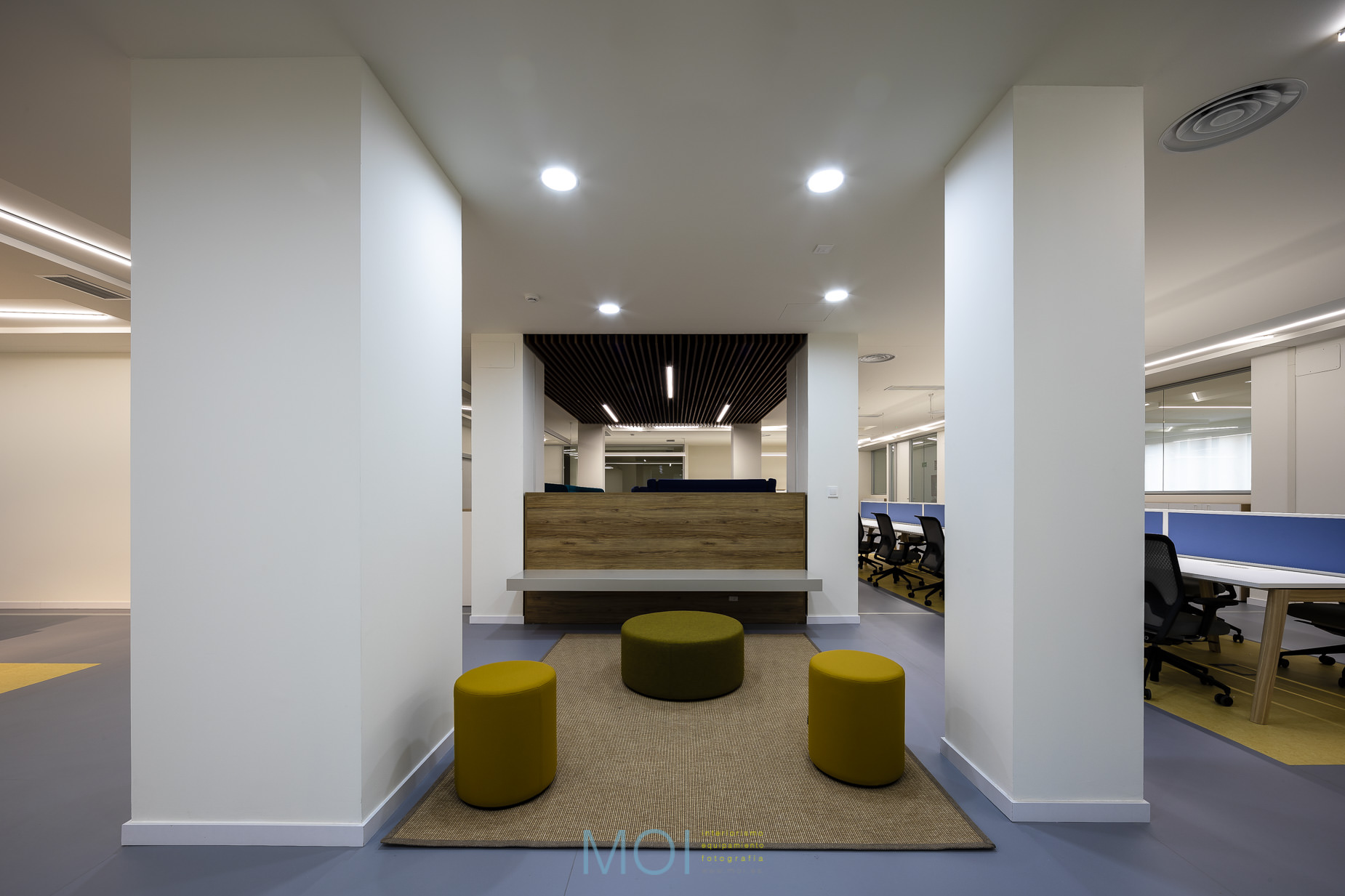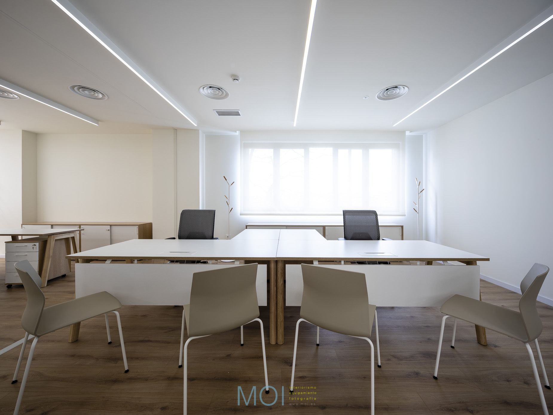 En la primera planta se sitúan los espacios de trabajo con varias tipologías claramente diferenciadas. Por un lado están los despachos destinados a alojar el trabajo de los funcionarios del Ayuntamiento destinados al área de innovación. Se trata de despachos más o menos tradicionales con puestos de trabajo que se resuelven con mobiliario con patas de madera maciza y una combinación entre roble y blanco que siempre da buen resultado.