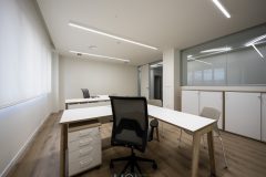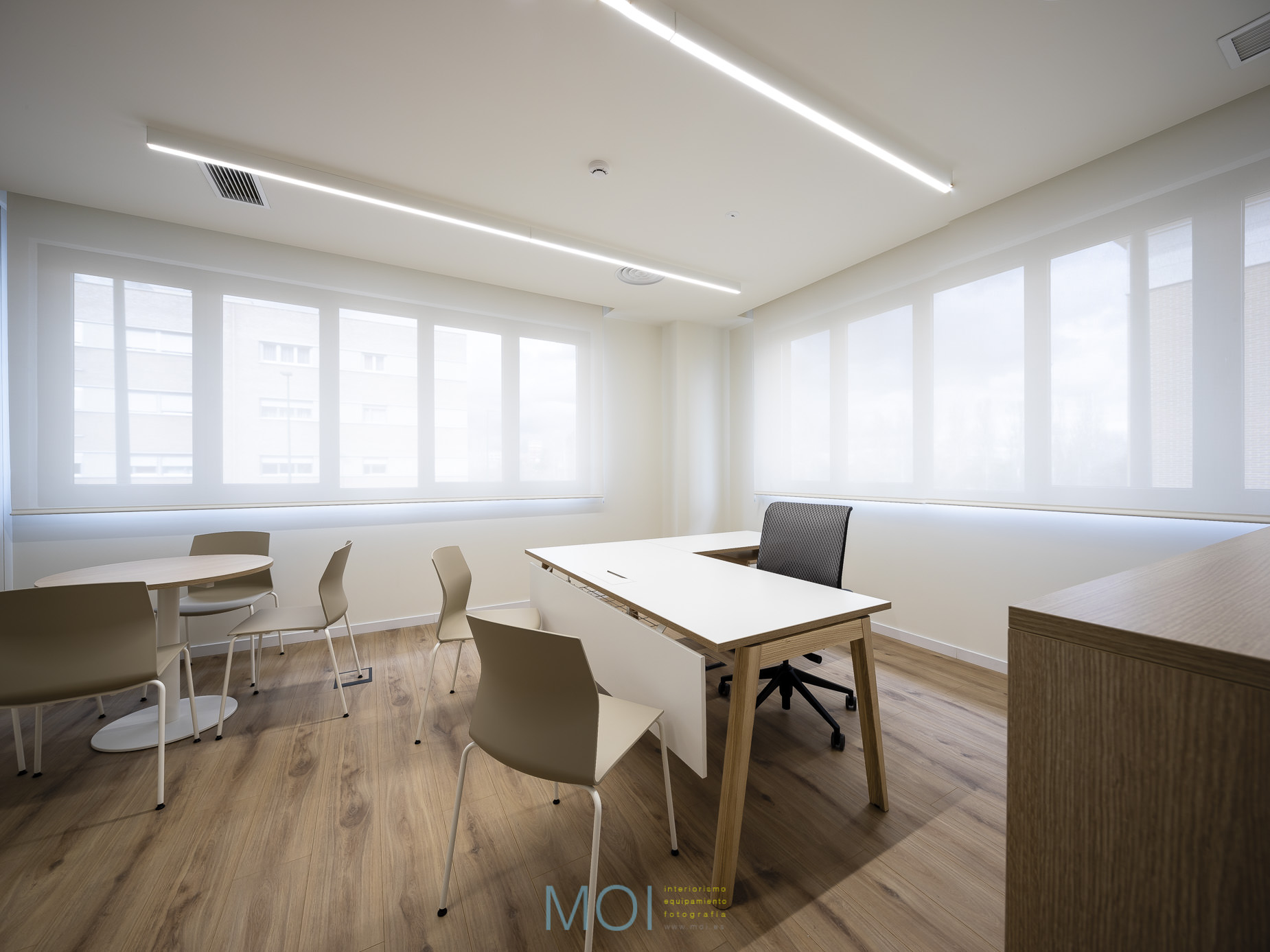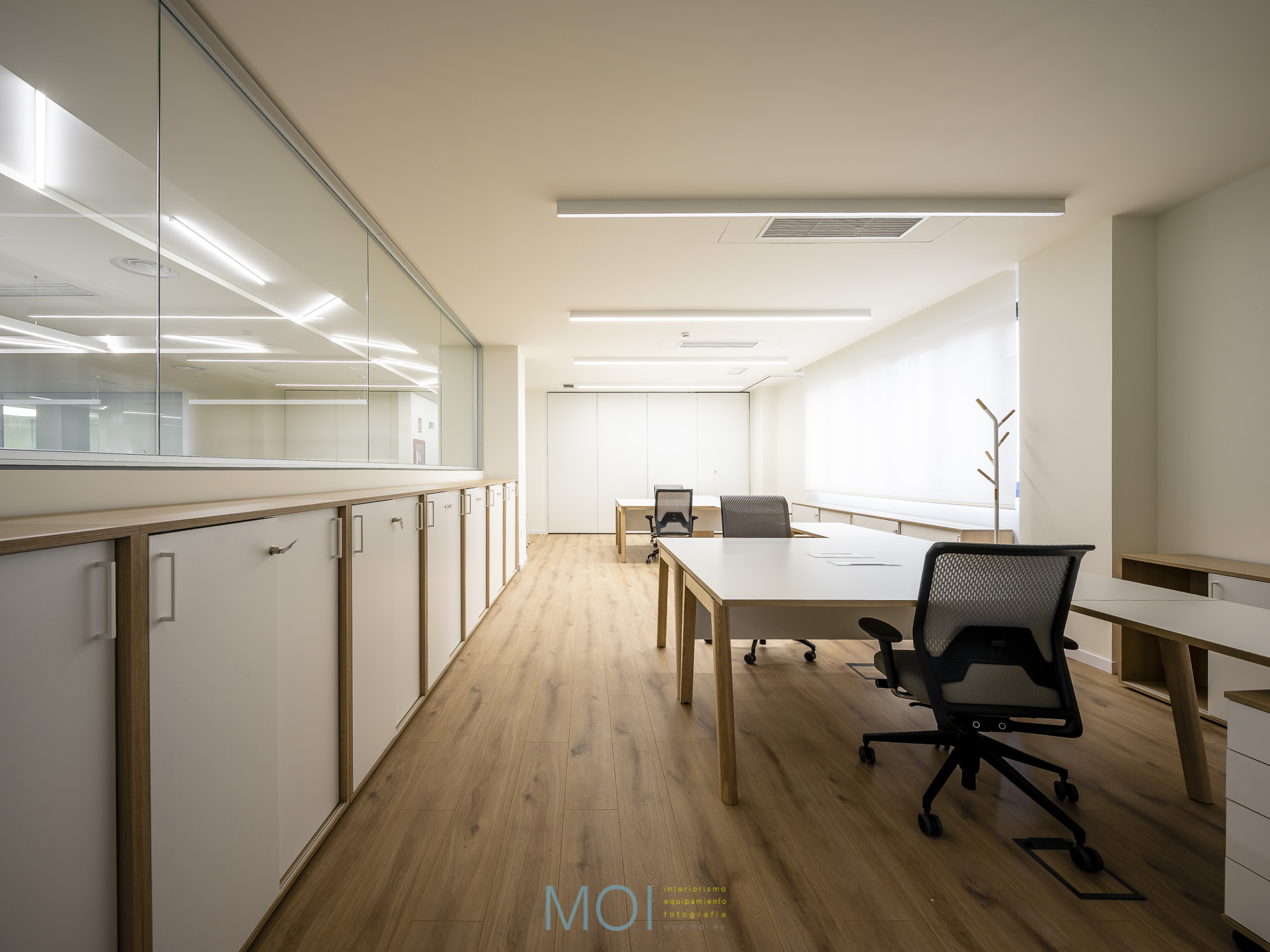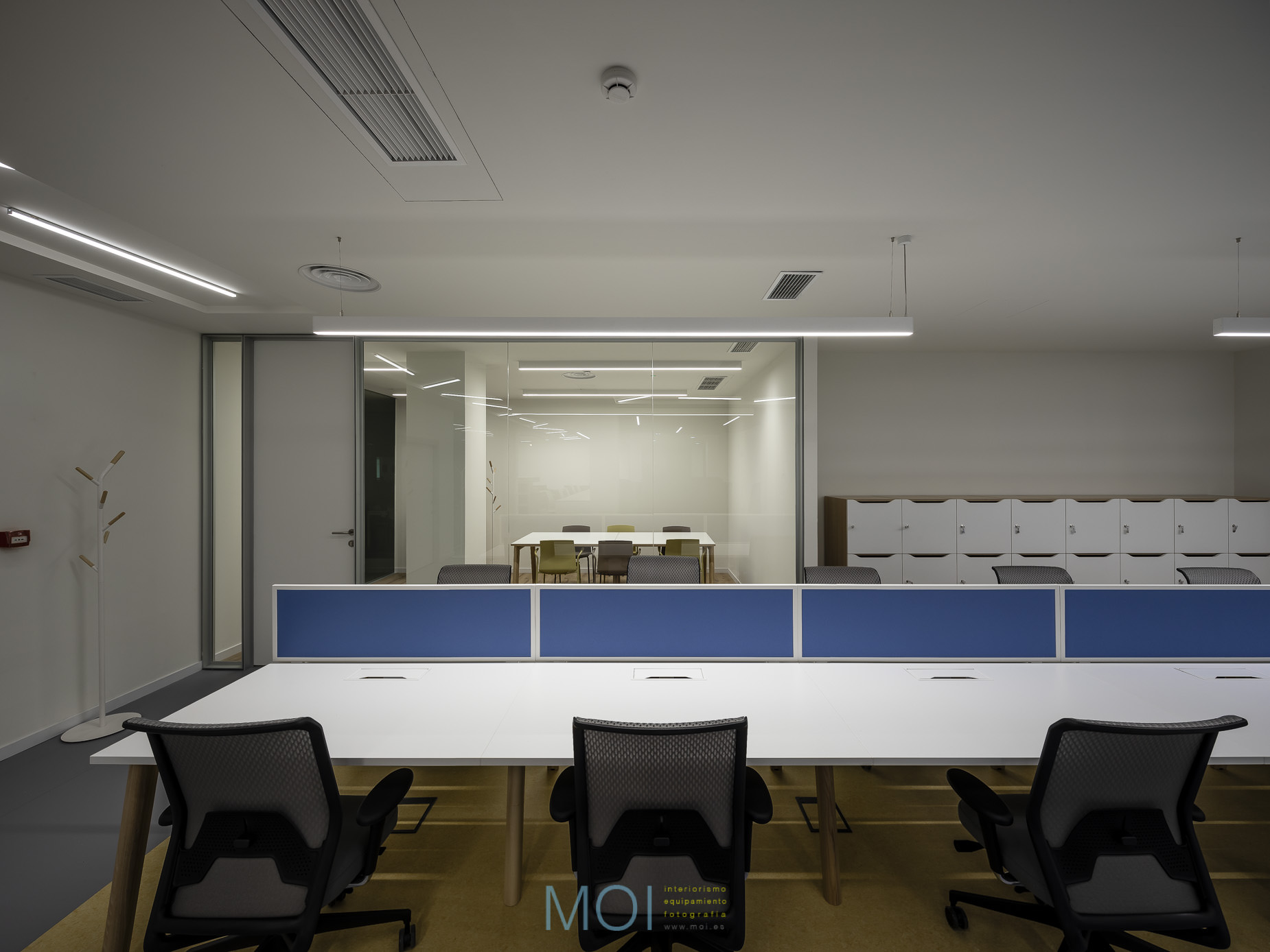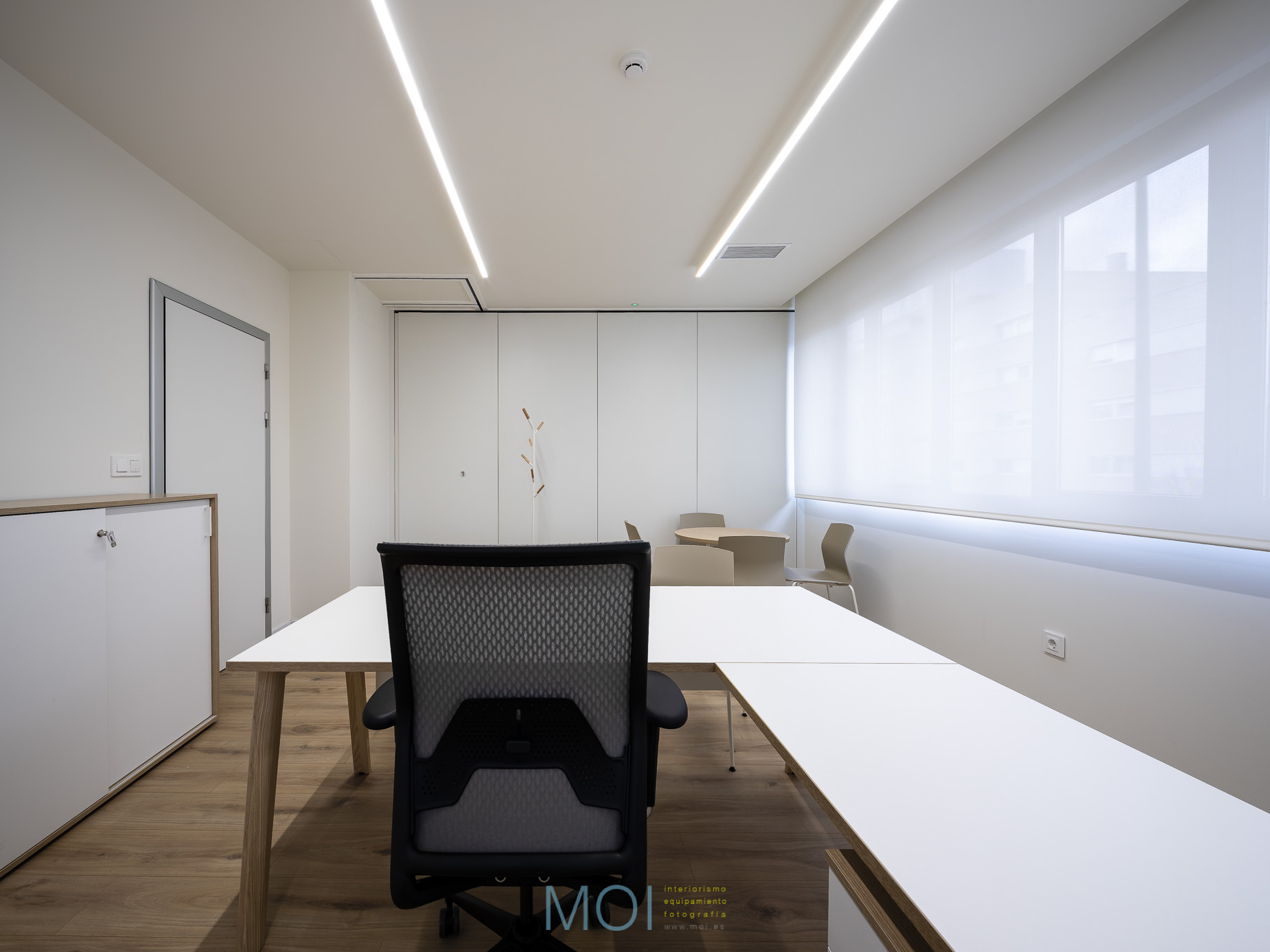 En la primera planta se sitúan los espacios de trabajo con varias tipologías claramente diferenciadas. Por un lado están los despachos destinados a alojar el trabajo de los funcionarios del Ayuntamiento destinados al área de innovación. Se trata de despachos más o menos tradicionales con puestos de trabajo que se resuelven con mobiliario con patas de madera maciza y una combinación entre roble y blanco que siempre da buen resultado.