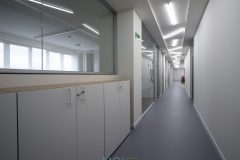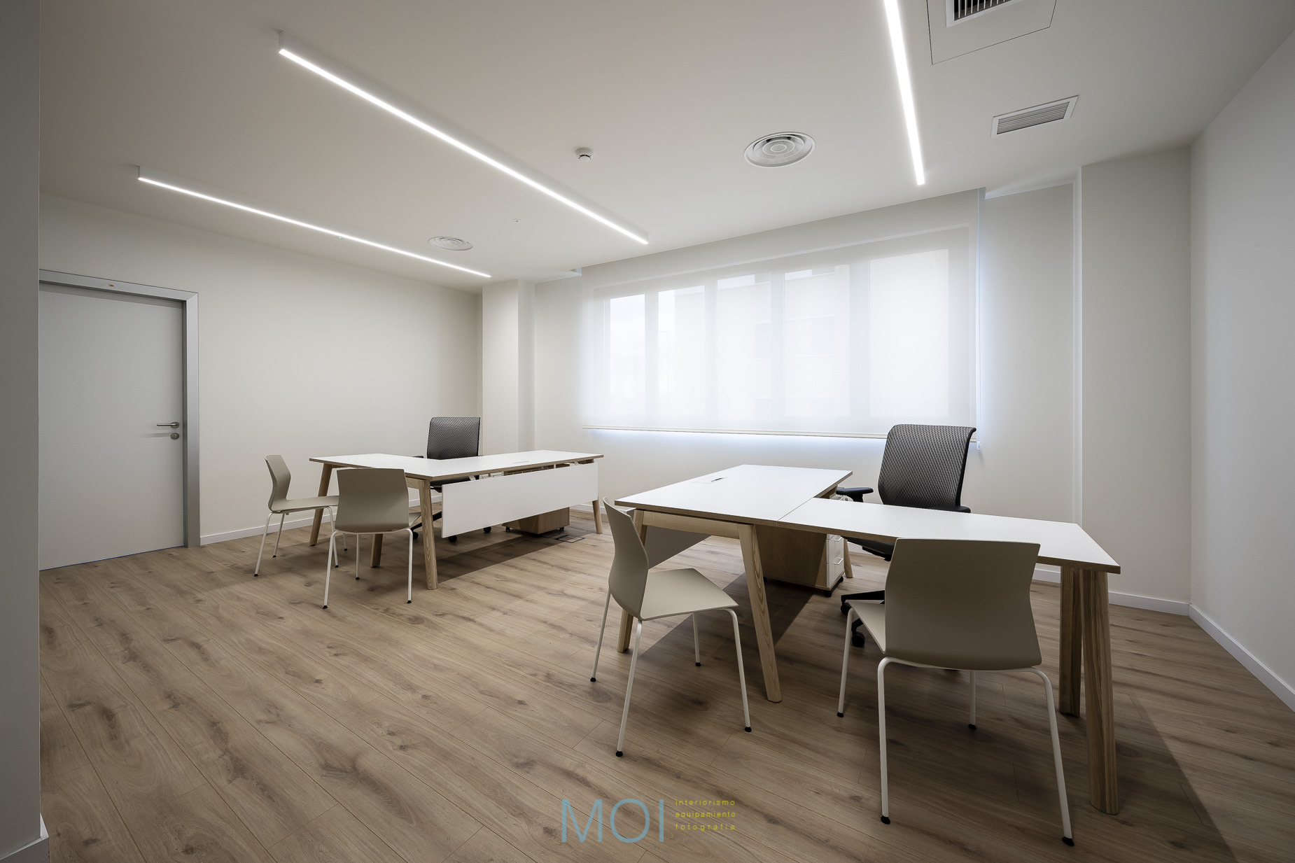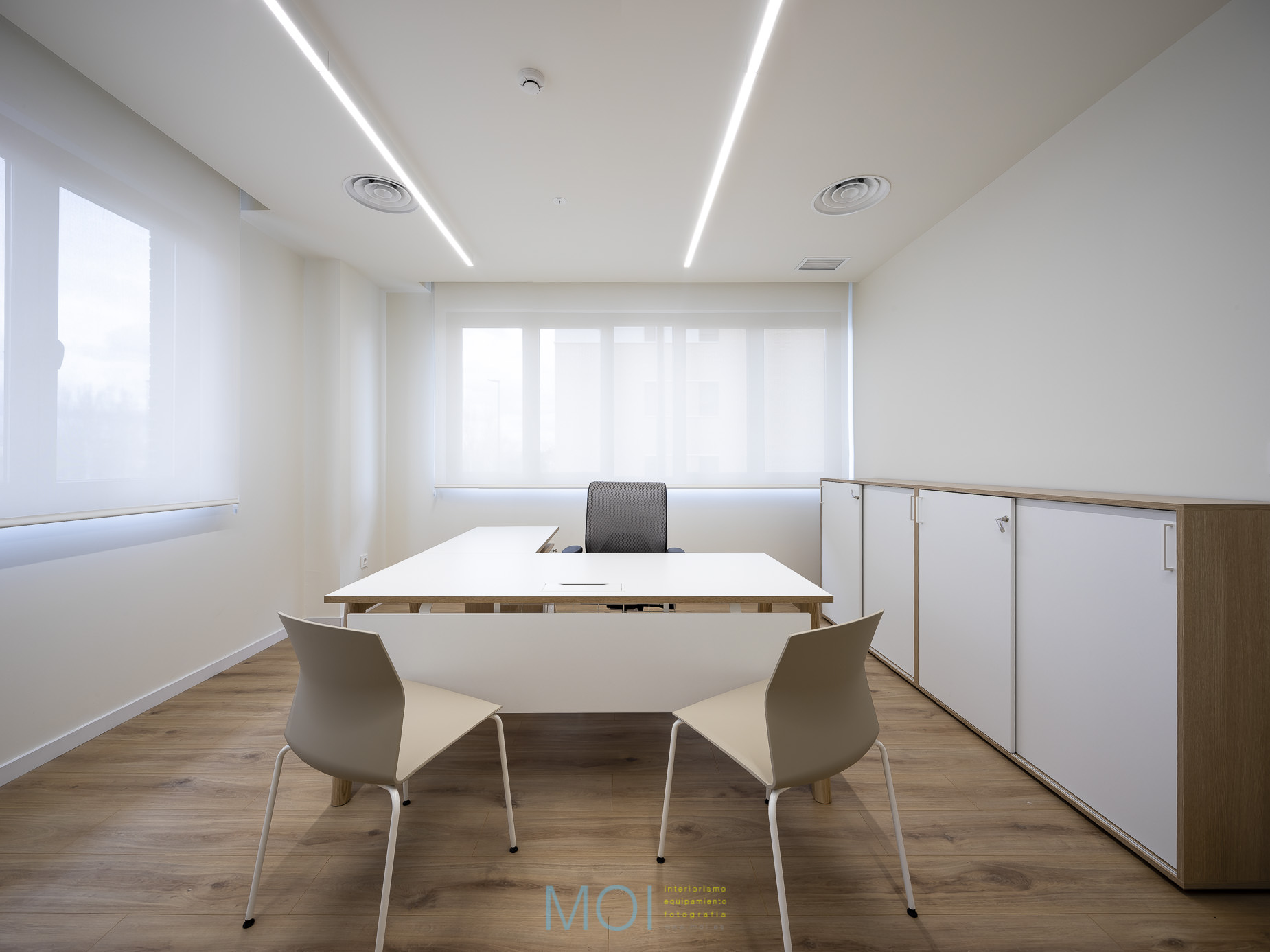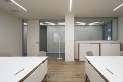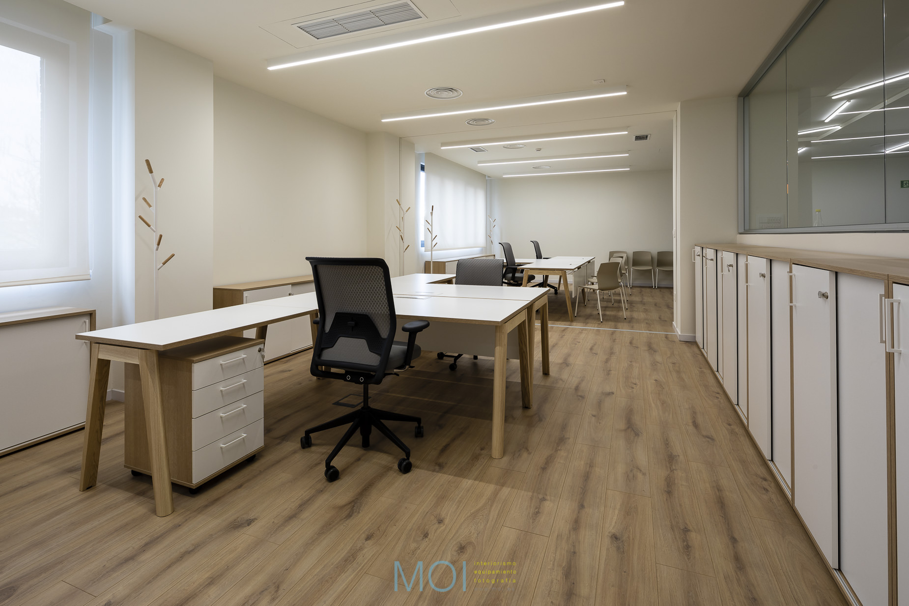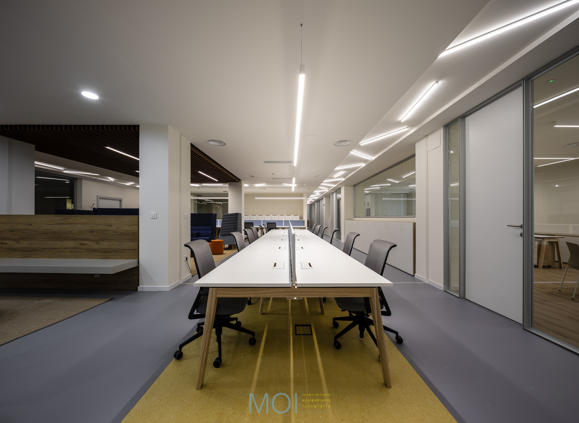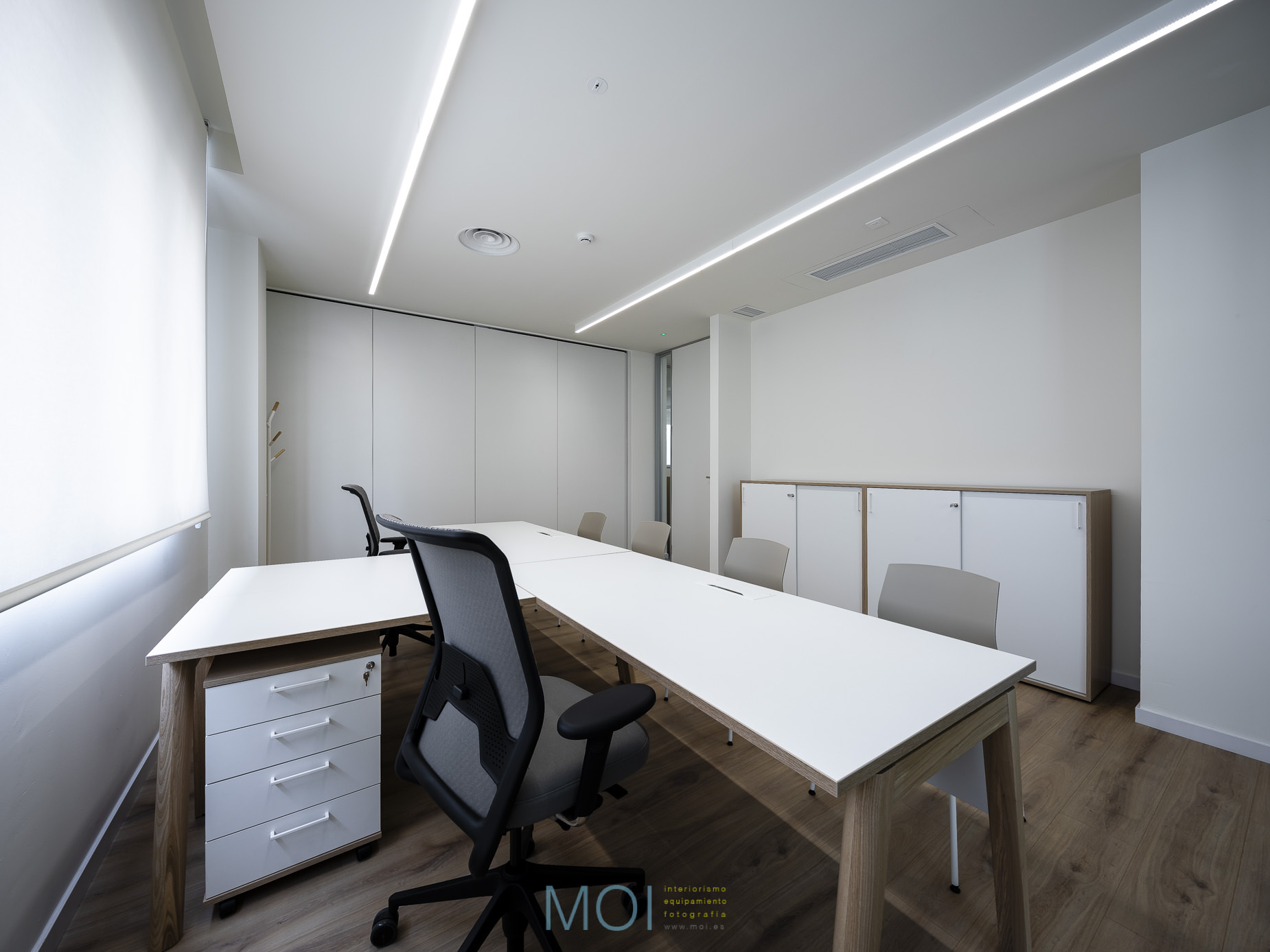 En la primera planta se sitúan los espacios de trabajo con varias tipologías claramente diferenciadas. Por un lado están los despachos destinados a alojar el trabajo de los funcionarios del Ayuntamiento destinados al área de innovación. Se trata de despachos más o menos tradicionales con puestos de trabajo que se resuelven con mobiliario con patas de madera maciza y una combinación entre roble y blanco que siempre da buen resultado.