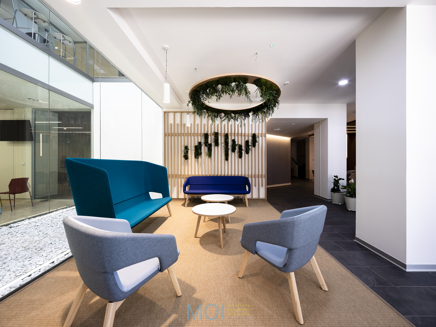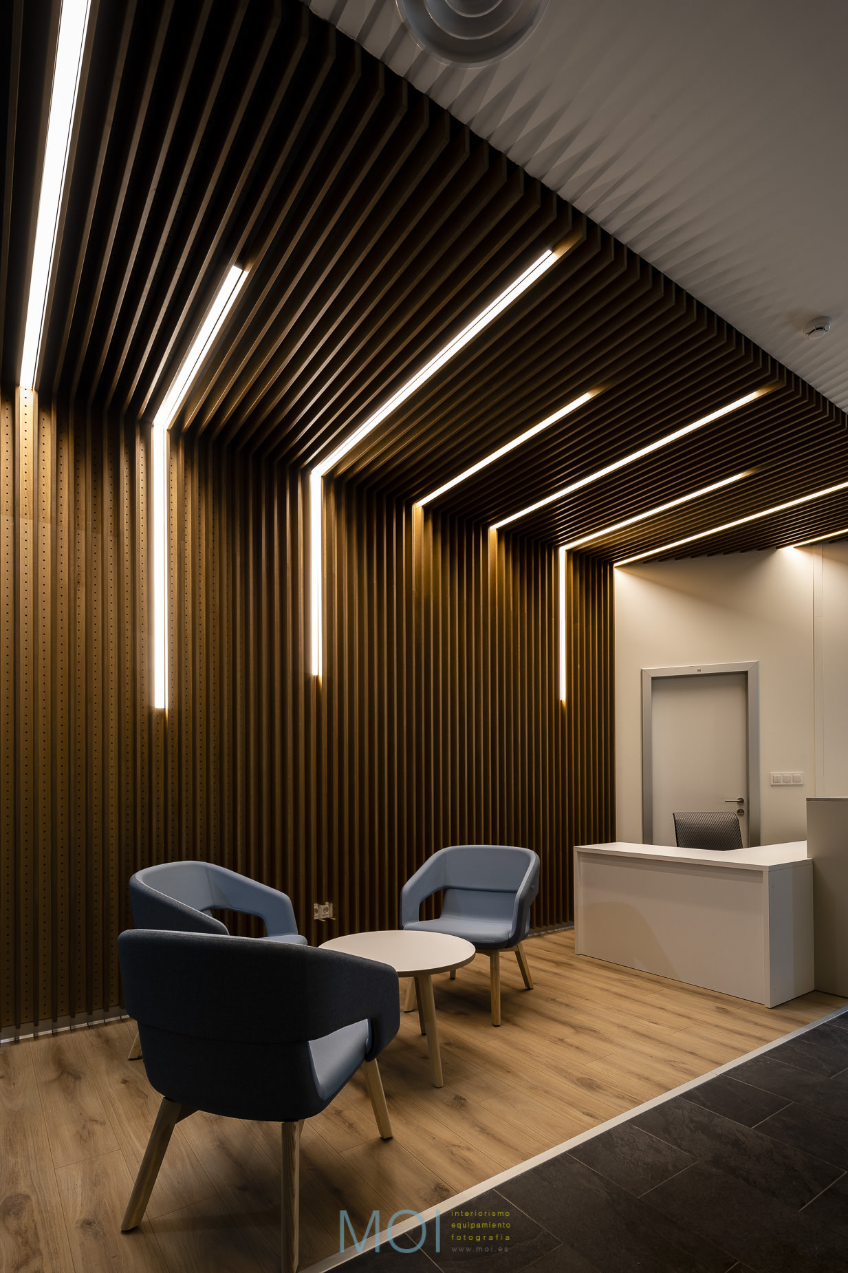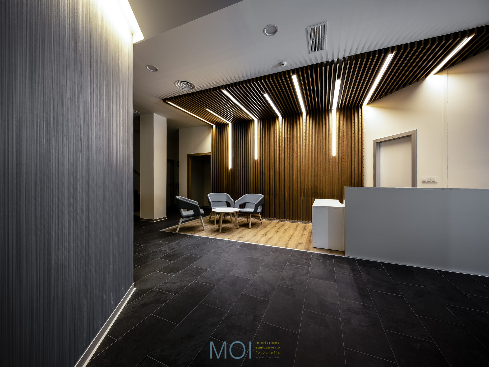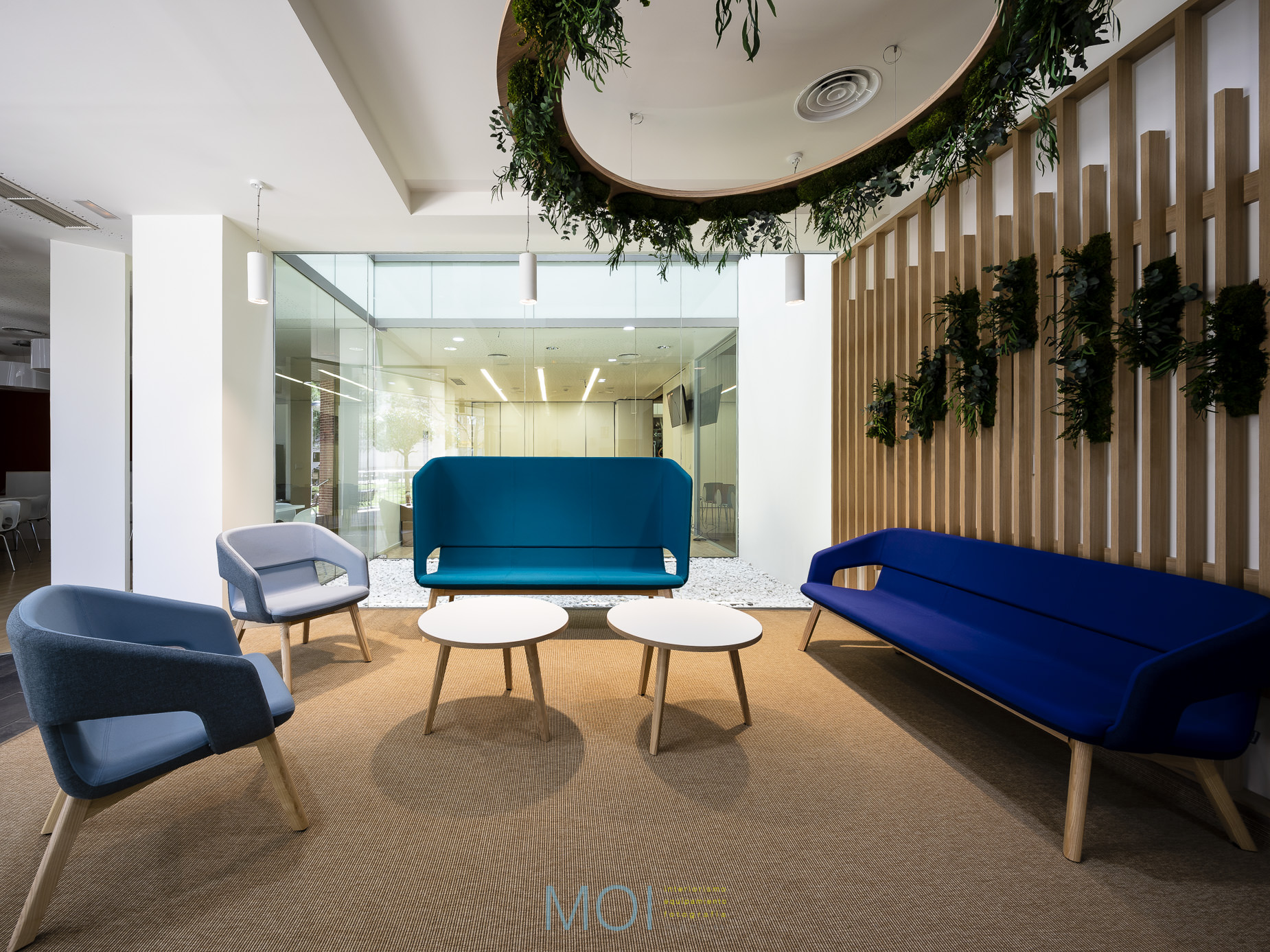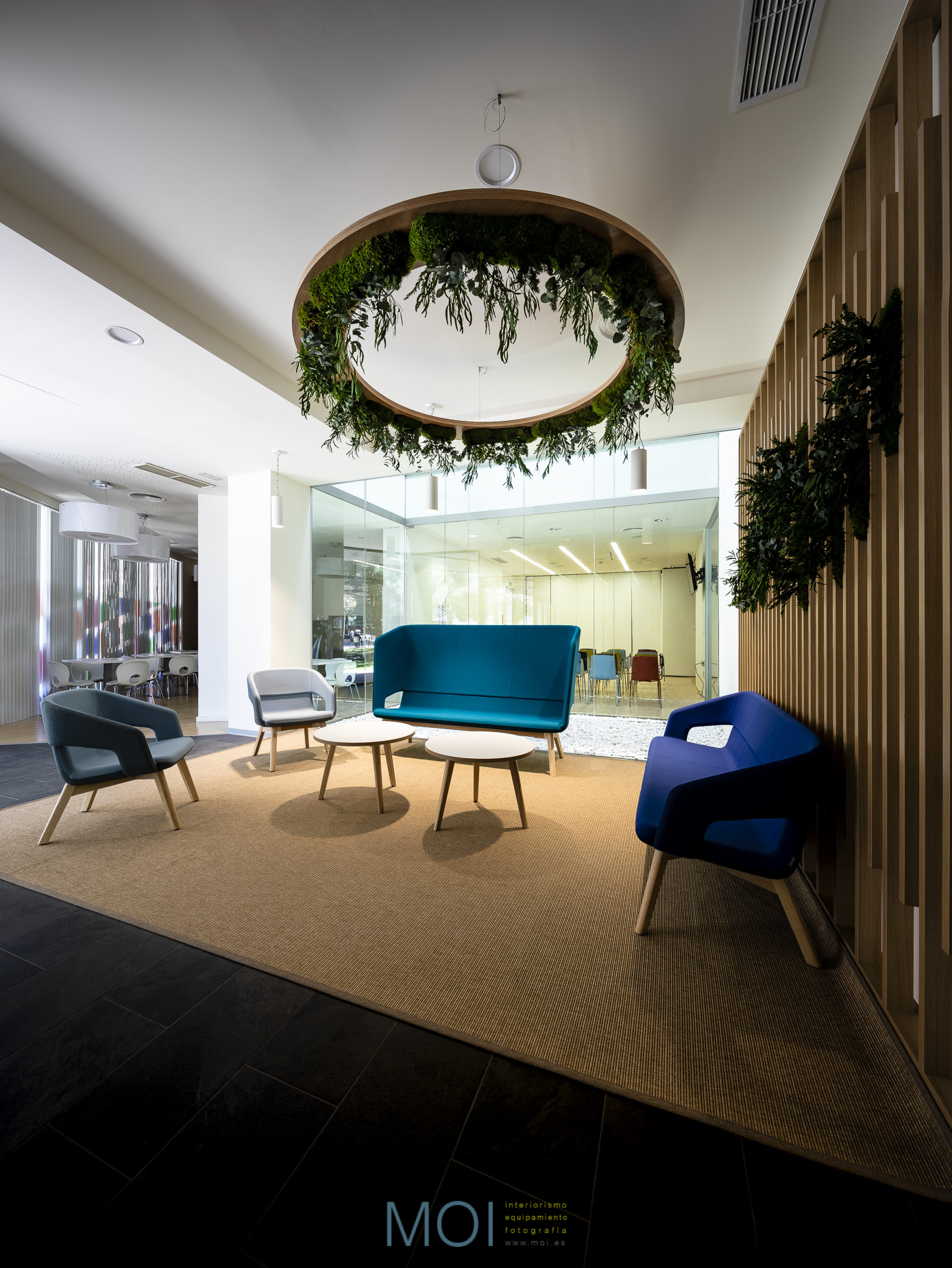El acceso es el primer contacto que el usuario tiene con estas nuevas instalaciones. Se emplean muebles de alta calidad y diseño nórdico con estructura de madera natural y cálidos tapizados. Las alfombras son en un tejido técnico apto para alto tránsito pero que recuerda las fibras naturales y la inclusión de jardín vertical y plantas preservadas además de plantas naturales ofrece un ambiente agradable y acogedor.