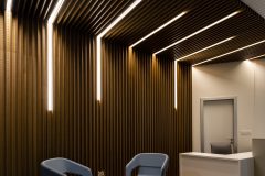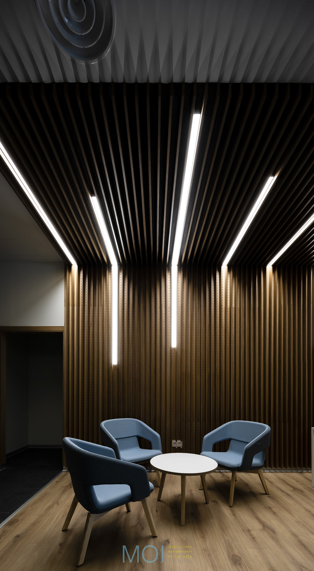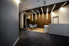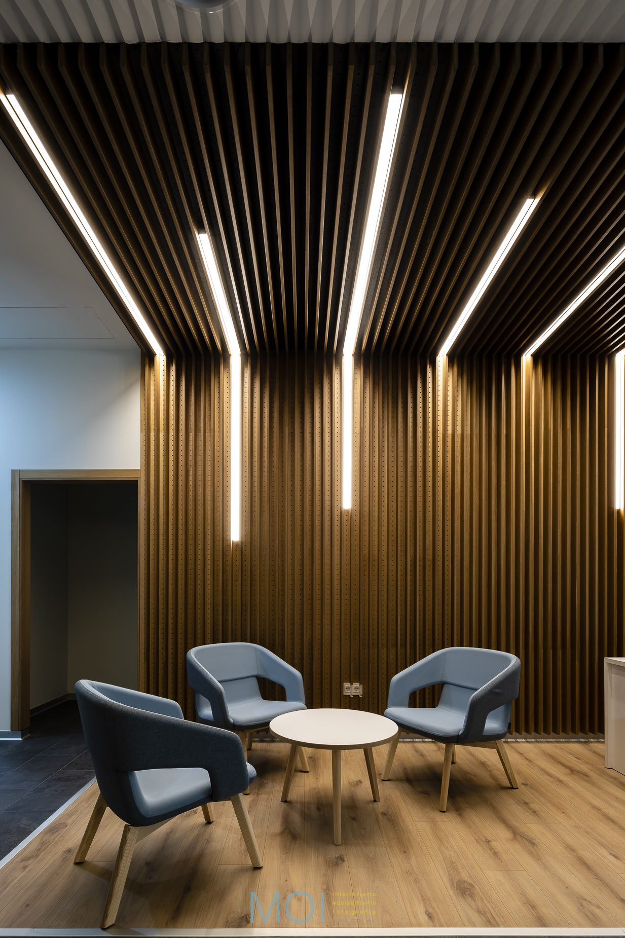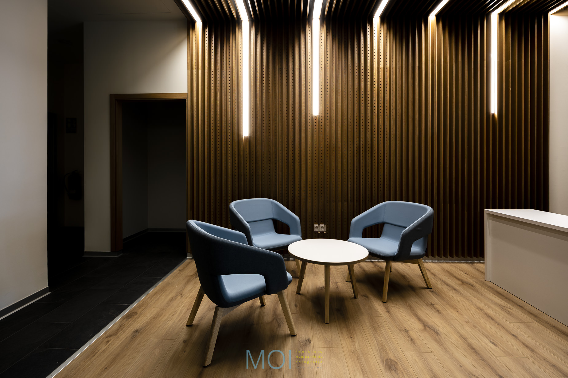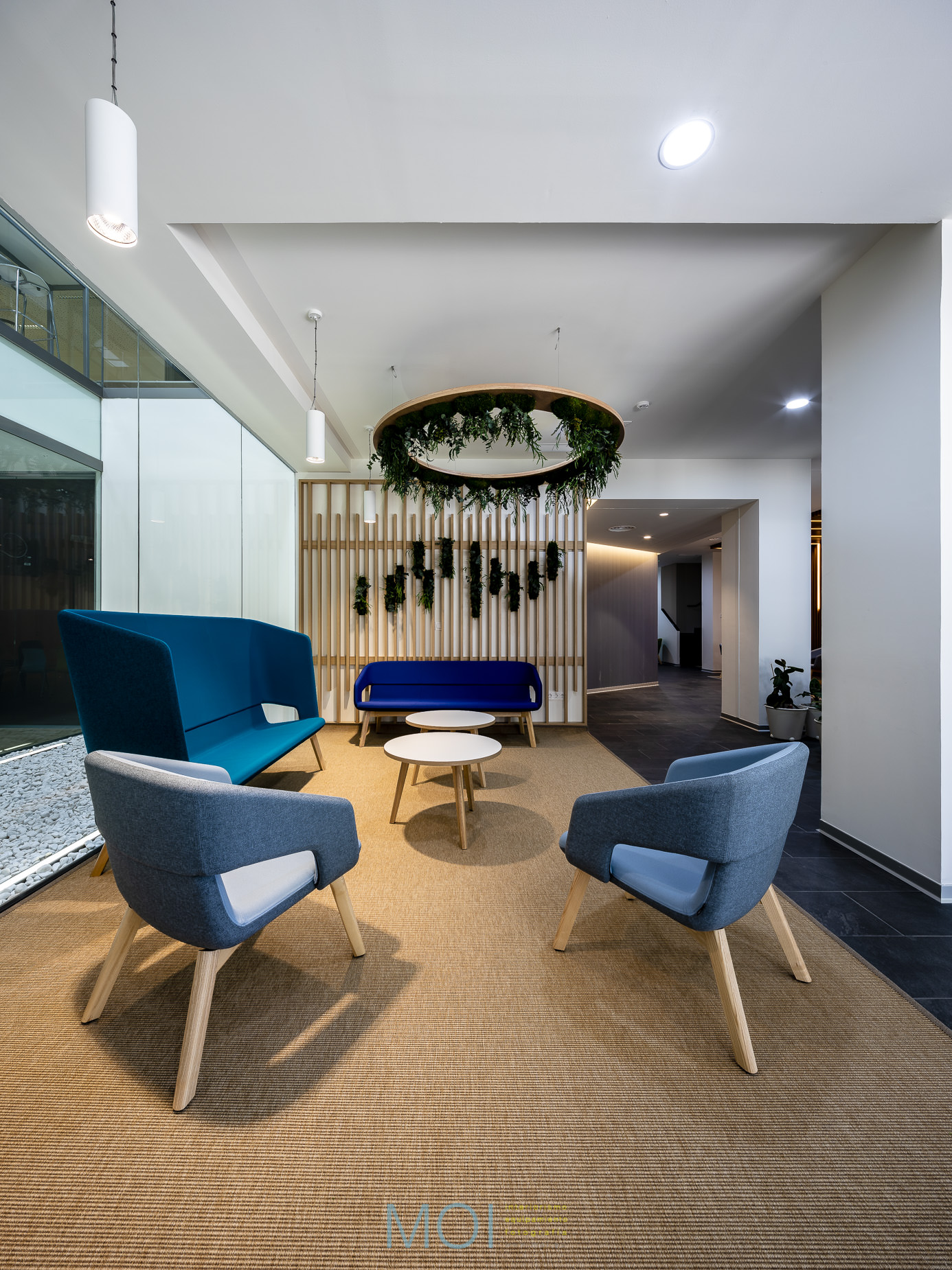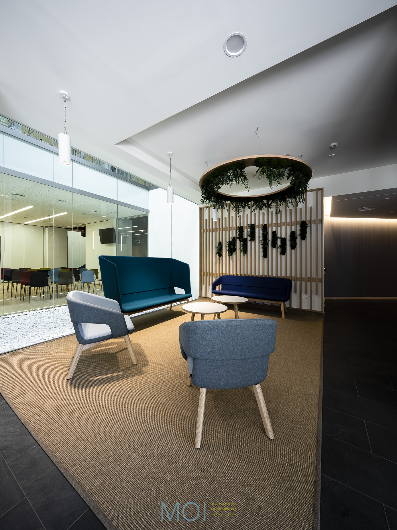 El acceso es el primer contacto que el usuario tiene con estas nuevas instalaciones. Se emplean muebles de alta calidad y diseño nórdico con estructura de madera natural y cálidos tapizados. Las alfombras son en un tejido técnico apto para alto tránsito pero que recuerda las fibras naturales y la inclusión de jardín vertical y plantas preservadas además de plantas naturales ofrece un ambiente agradable y acogedor.