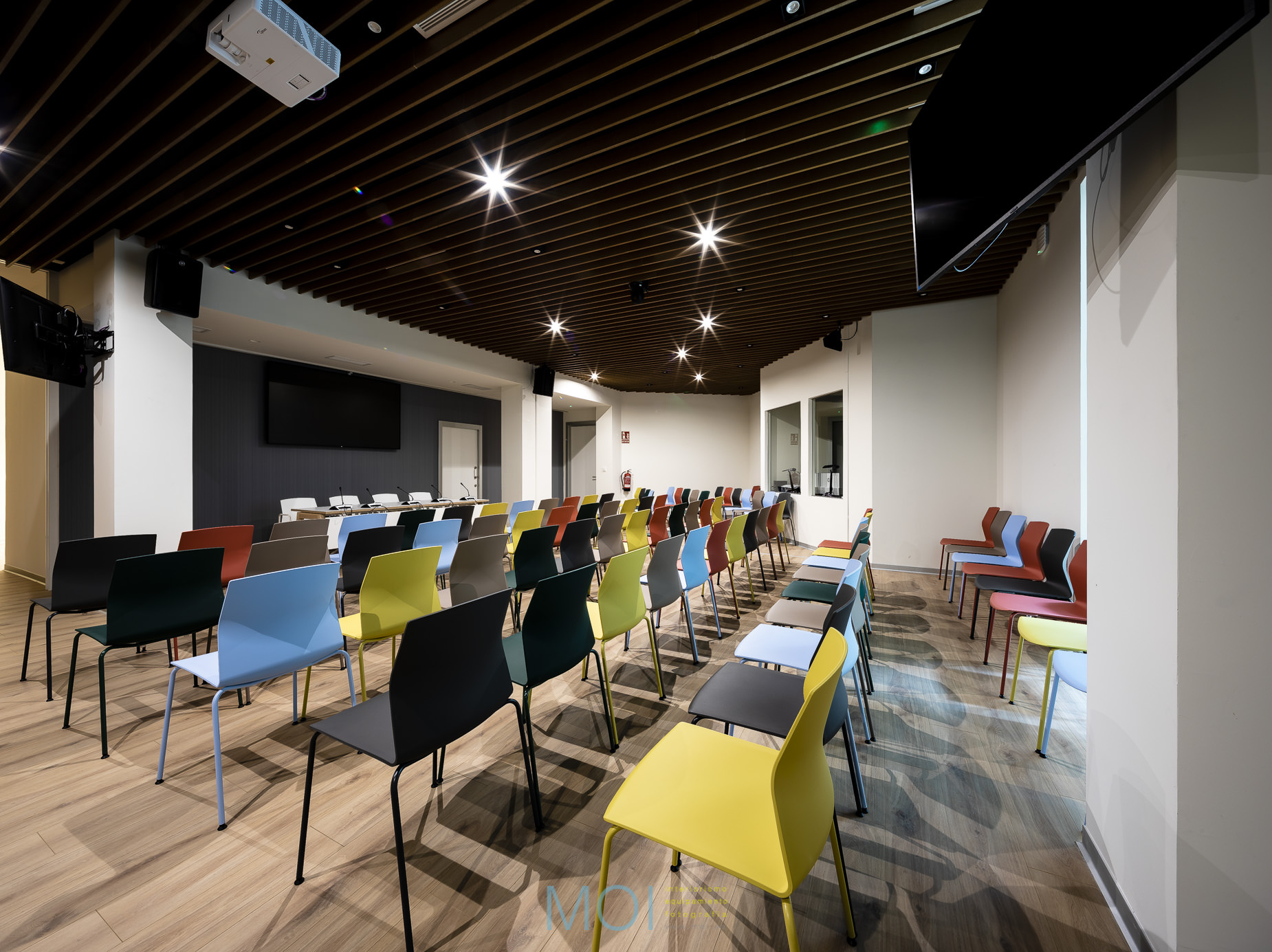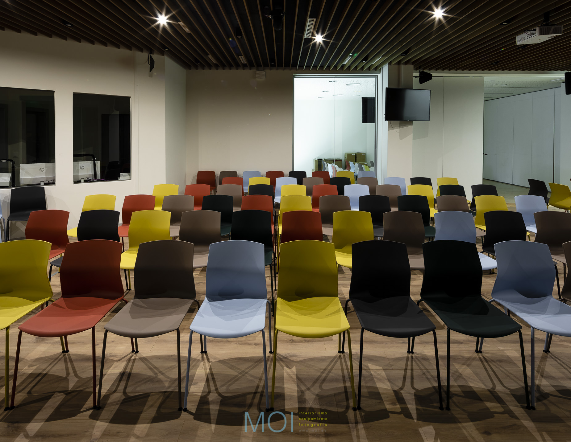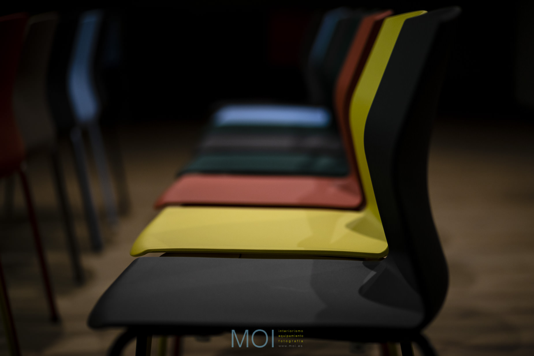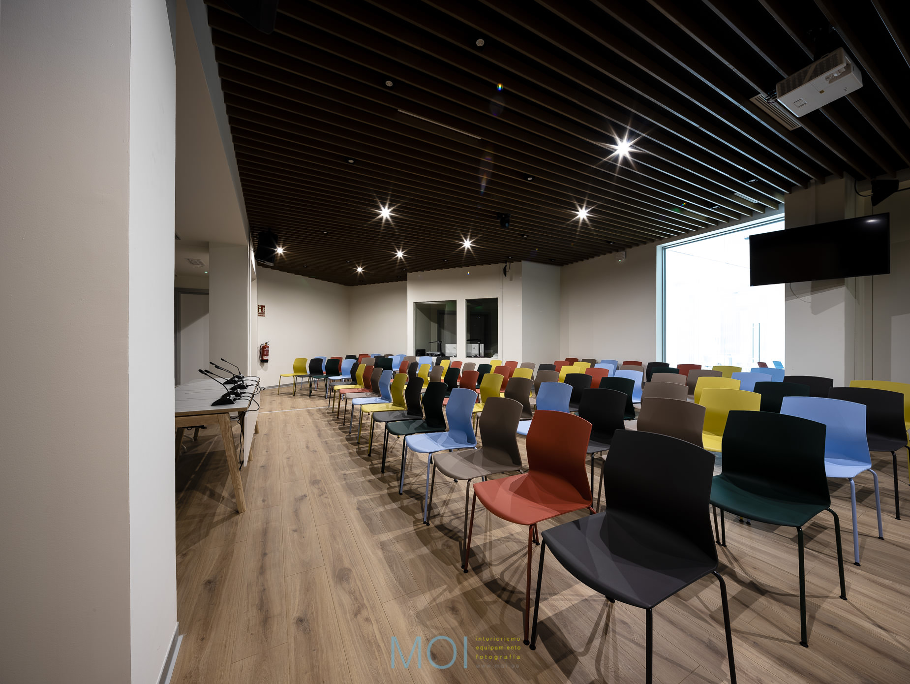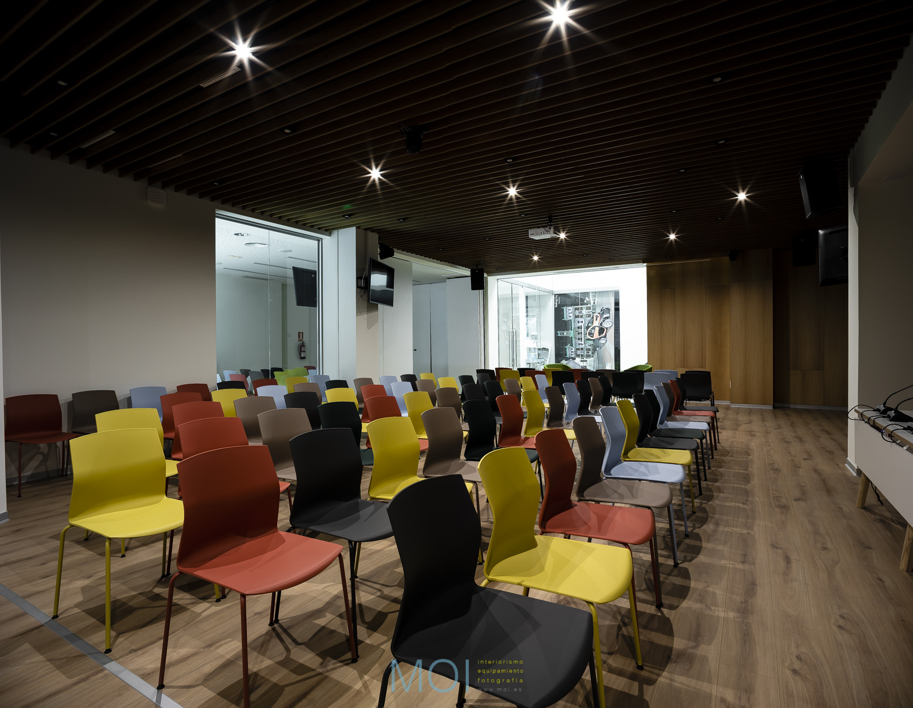 Todo el espacio en el edificio trata de ser versátil y adaptable a diversos usos y situaciones empleando tabiques móviles como elemento de compartimentación y división entre muchos espacios. El mobiliario planteado pretende dar una respuesta coherente a este planteamiento por lo que la sillería empleada es fácilmente apilable, muy resistente y el uso de un cromatismo variado permitía fácilmente usar las sillas en unos espacios u otras indistintamente.