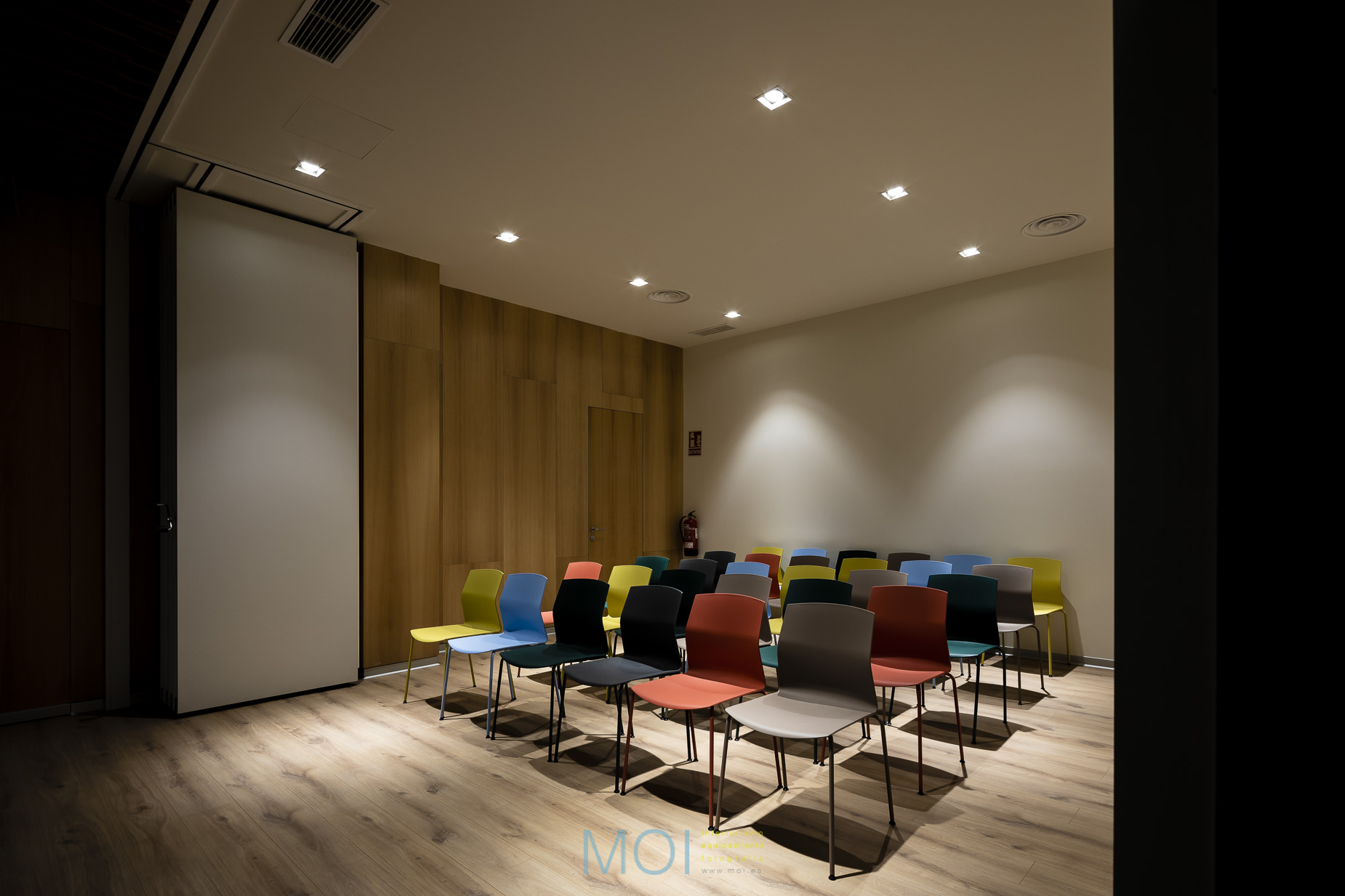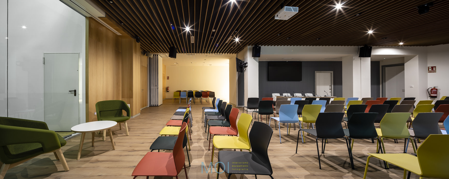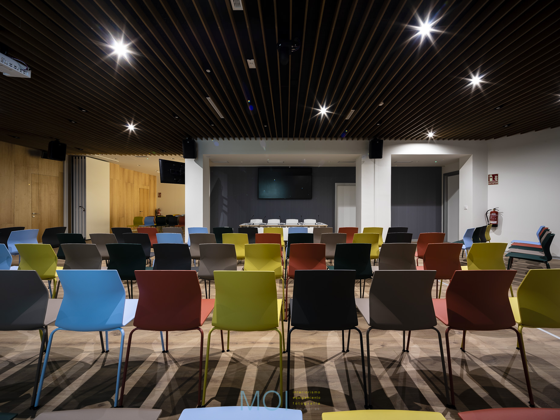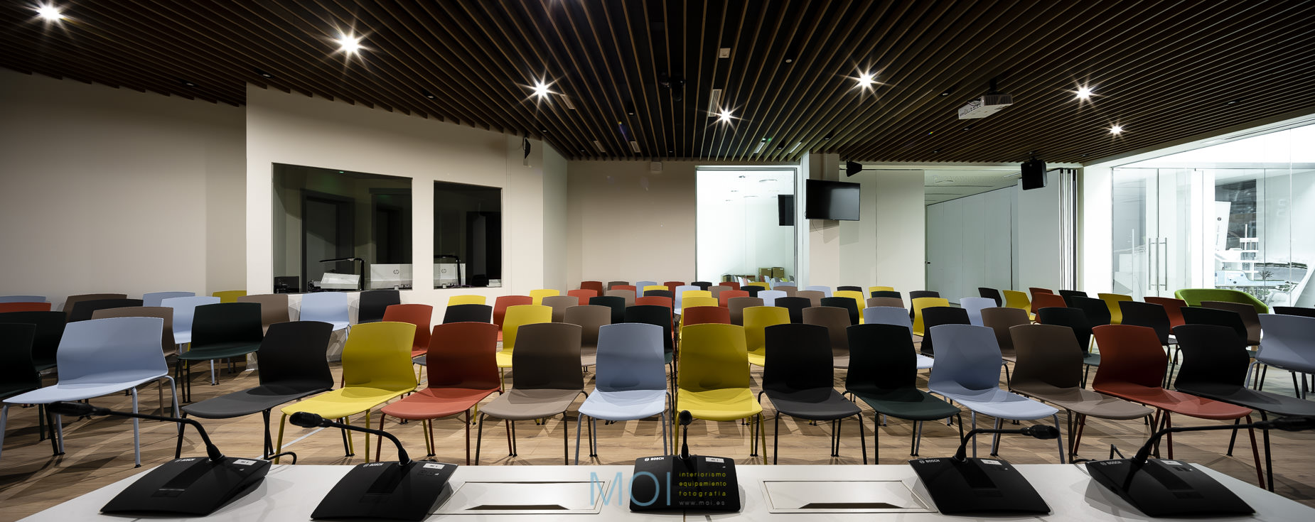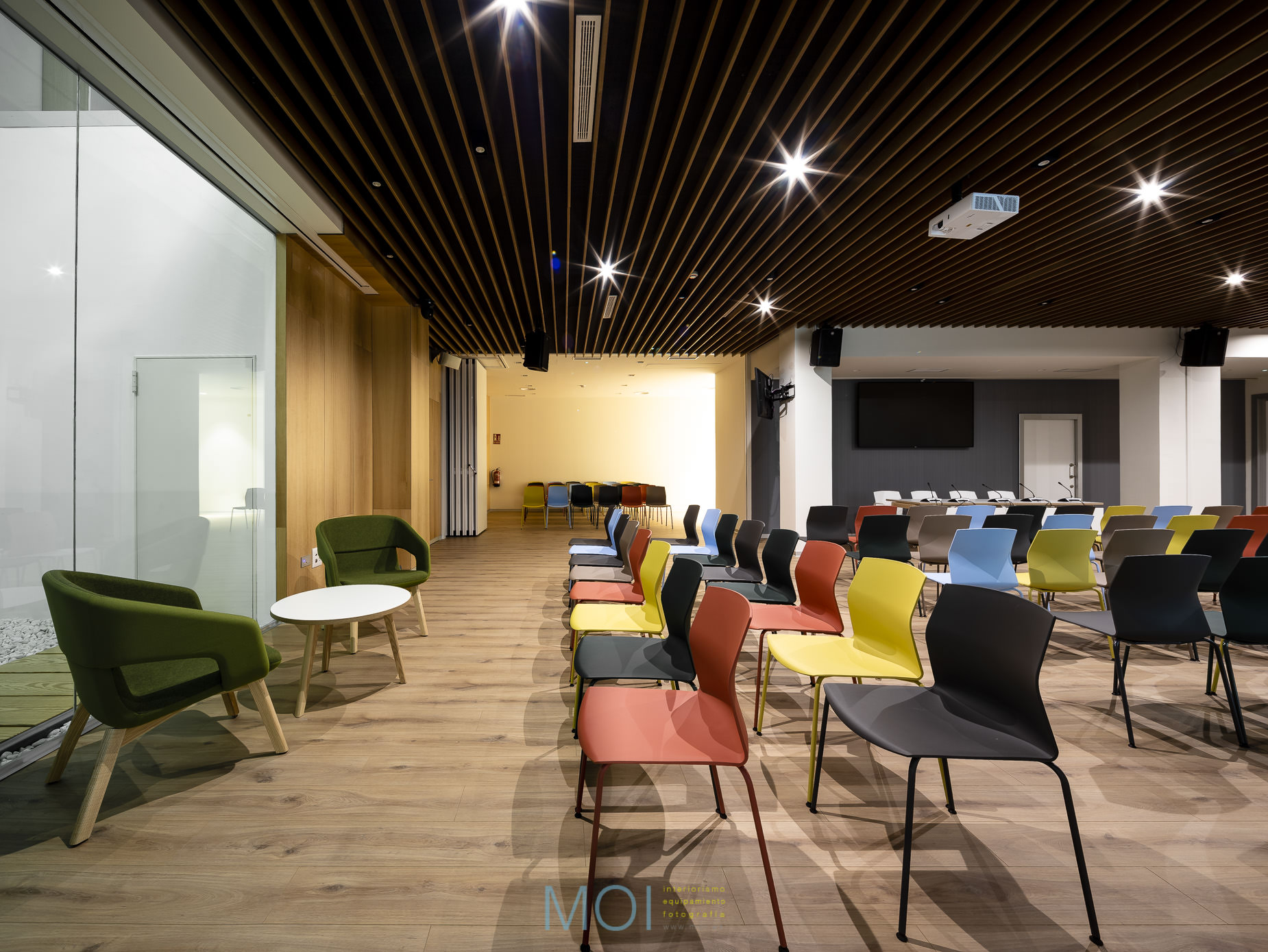 Todo el espacio en el edificio trata de ser versátil y adaptable a diversos usos y situaciones empleando tabiques móviles como elemento de compartimentación y división entre muchos espacios. El mobiliario planteado pretende dar una respuesta coherente a este planteamiento por lo que la sillería empleada es fácilmente apilable, muy resistente y el uso de un cromatismo variado permitía fácilmente usar las sillas en unos espacios u otras indistintamente.