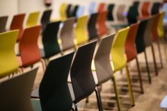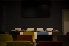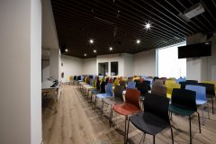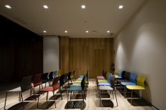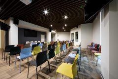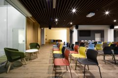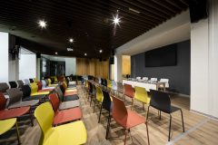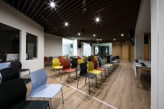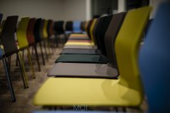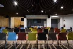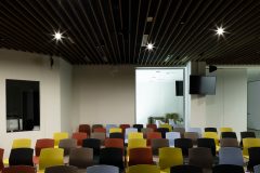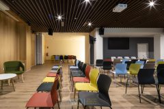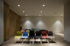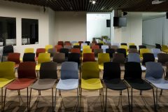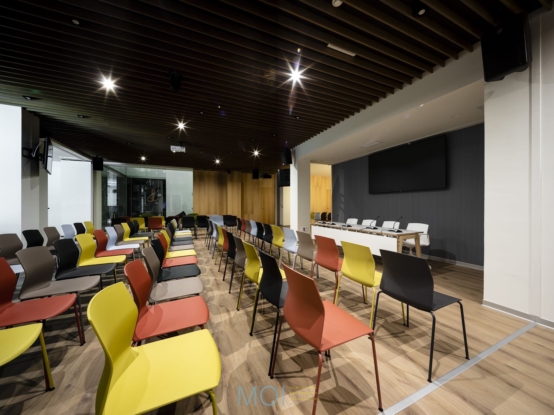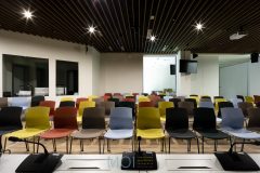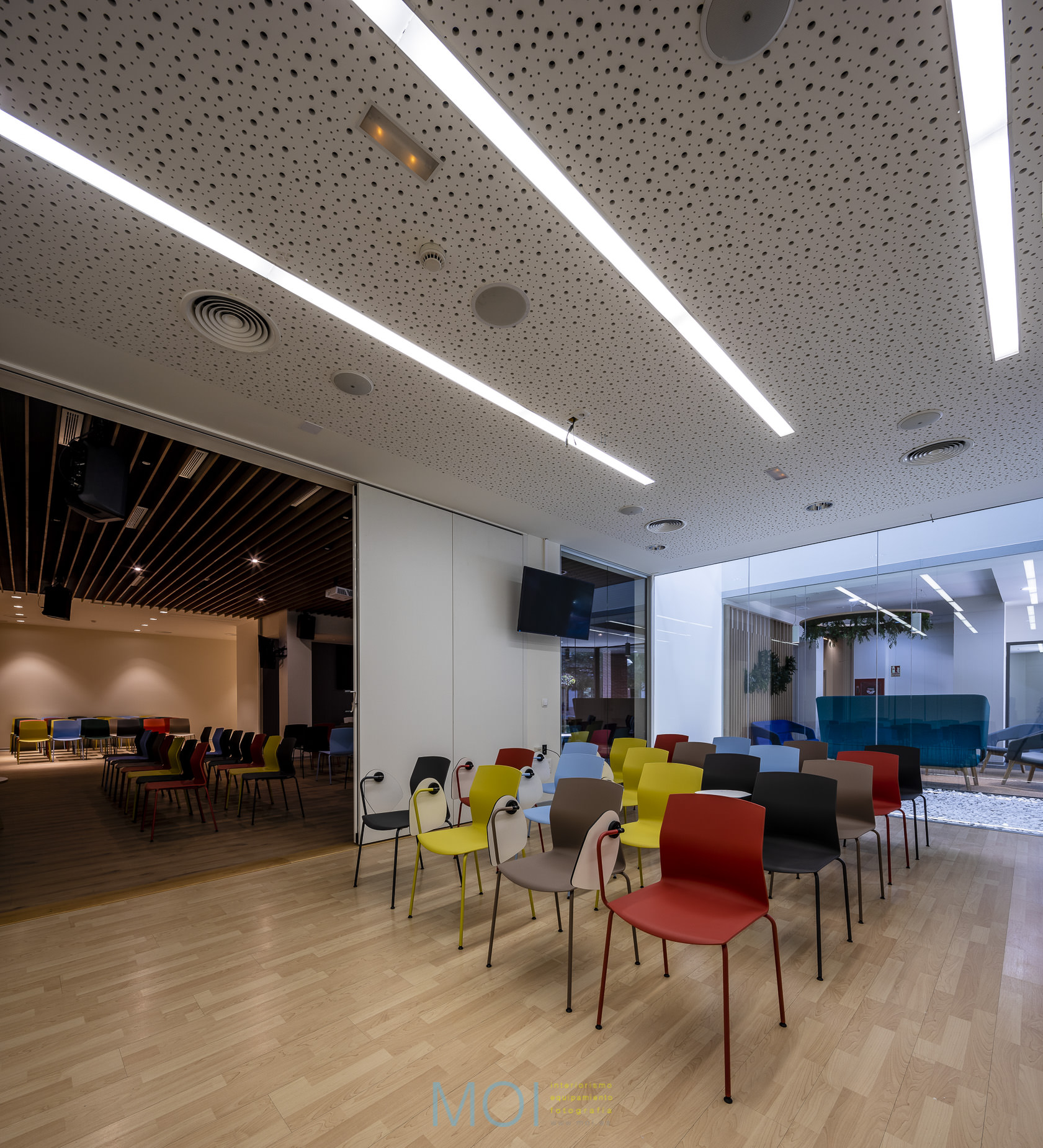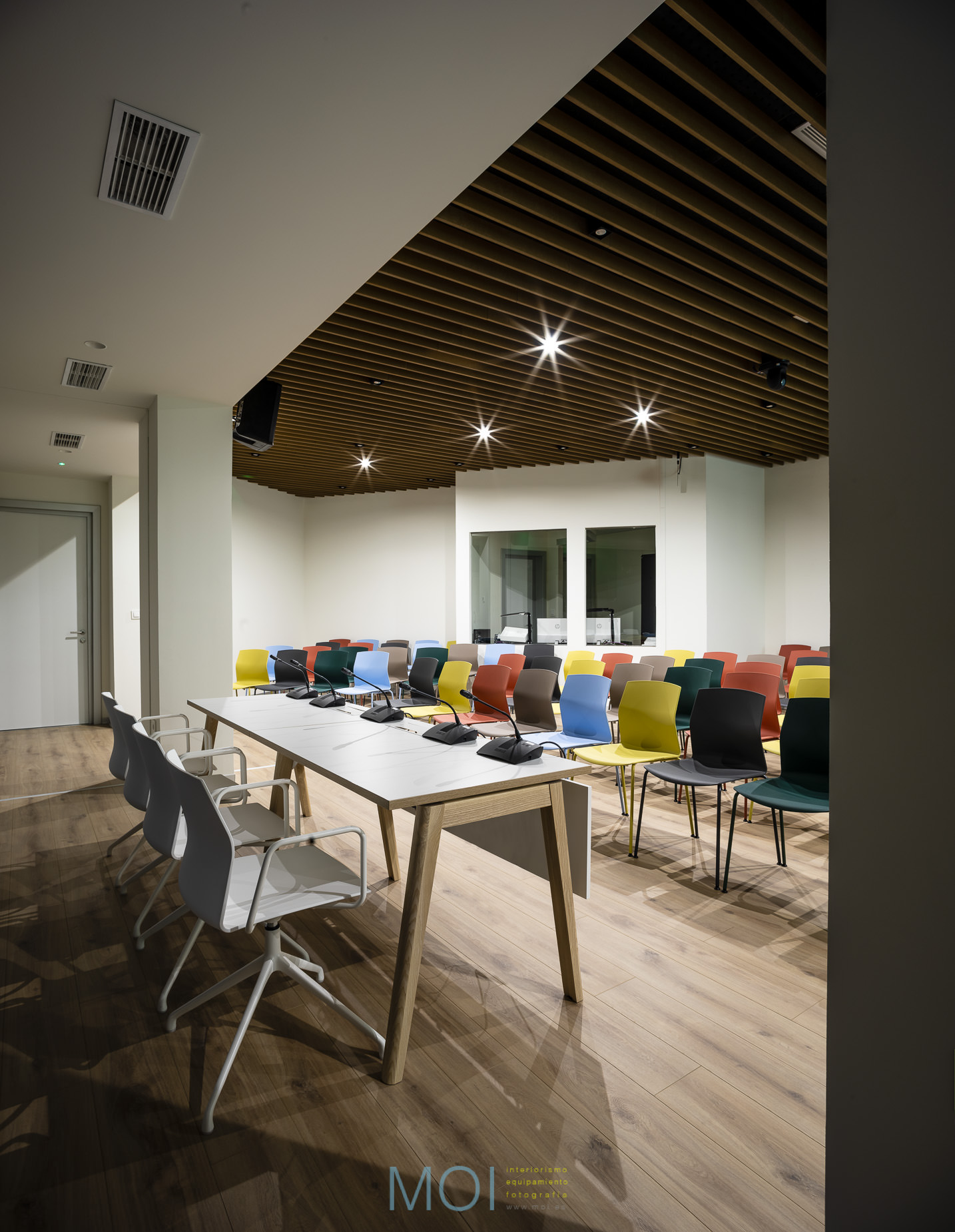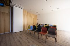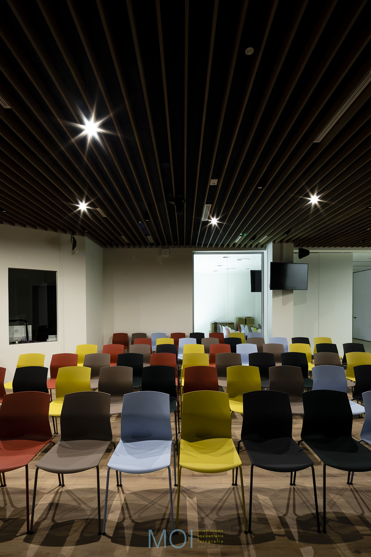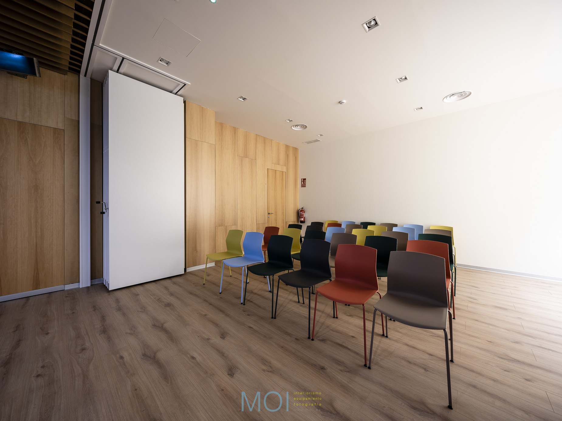 Todo el espacio en el edificio trata de ser versátil y adaptable a diversos usos y situaciones empleando tabiques móviles como elemento de compartimentación y división entre muchos espacios. El mobiliario planteado pretende dar una respuesta coherente a este planteamiento por lo que la sillería empleada es fácilmente apilable, muy resistente y el uso de un cromatismo variado permitía fácilmente usar las sillas en unos espacios u otras indistintamente.