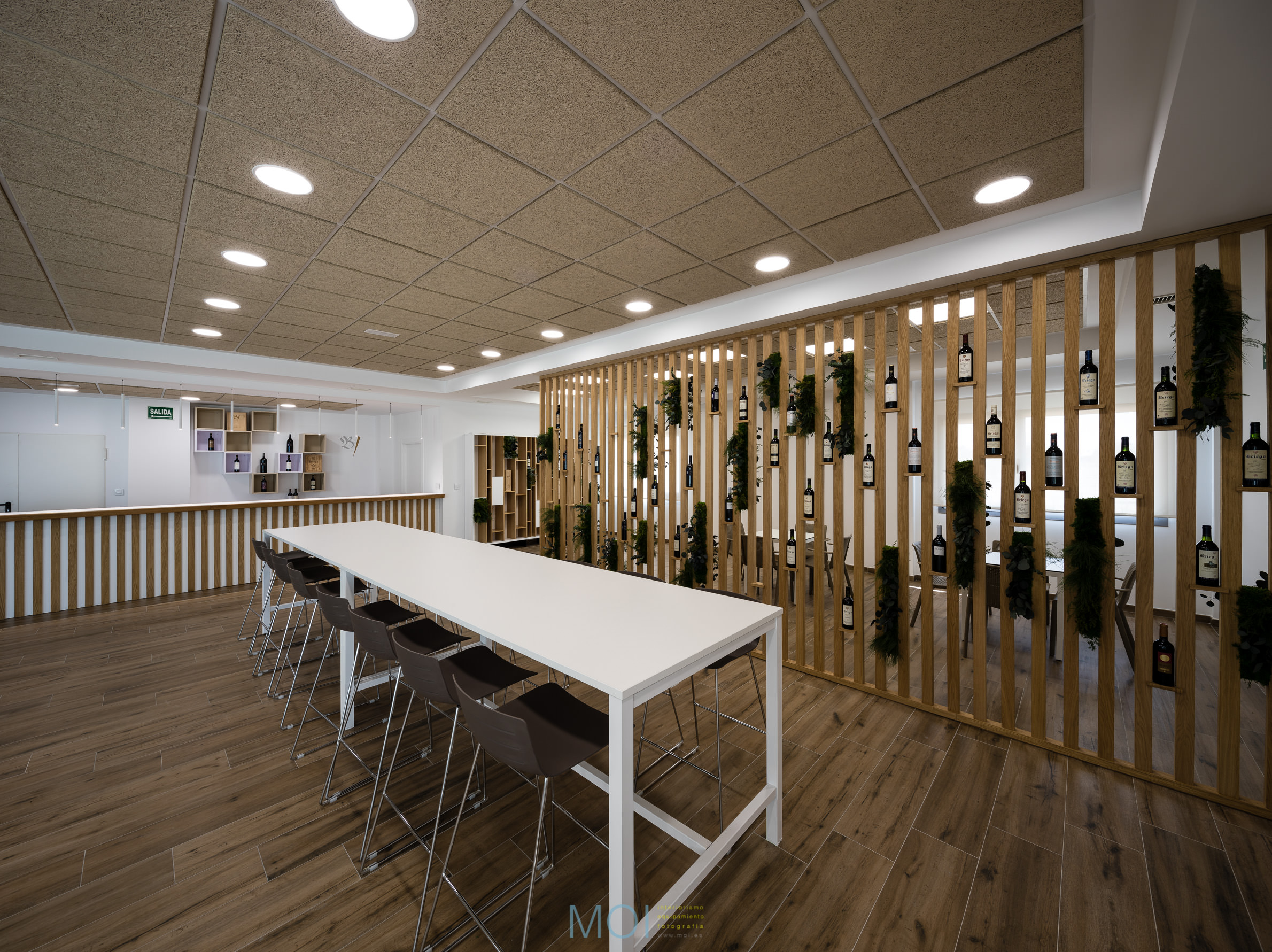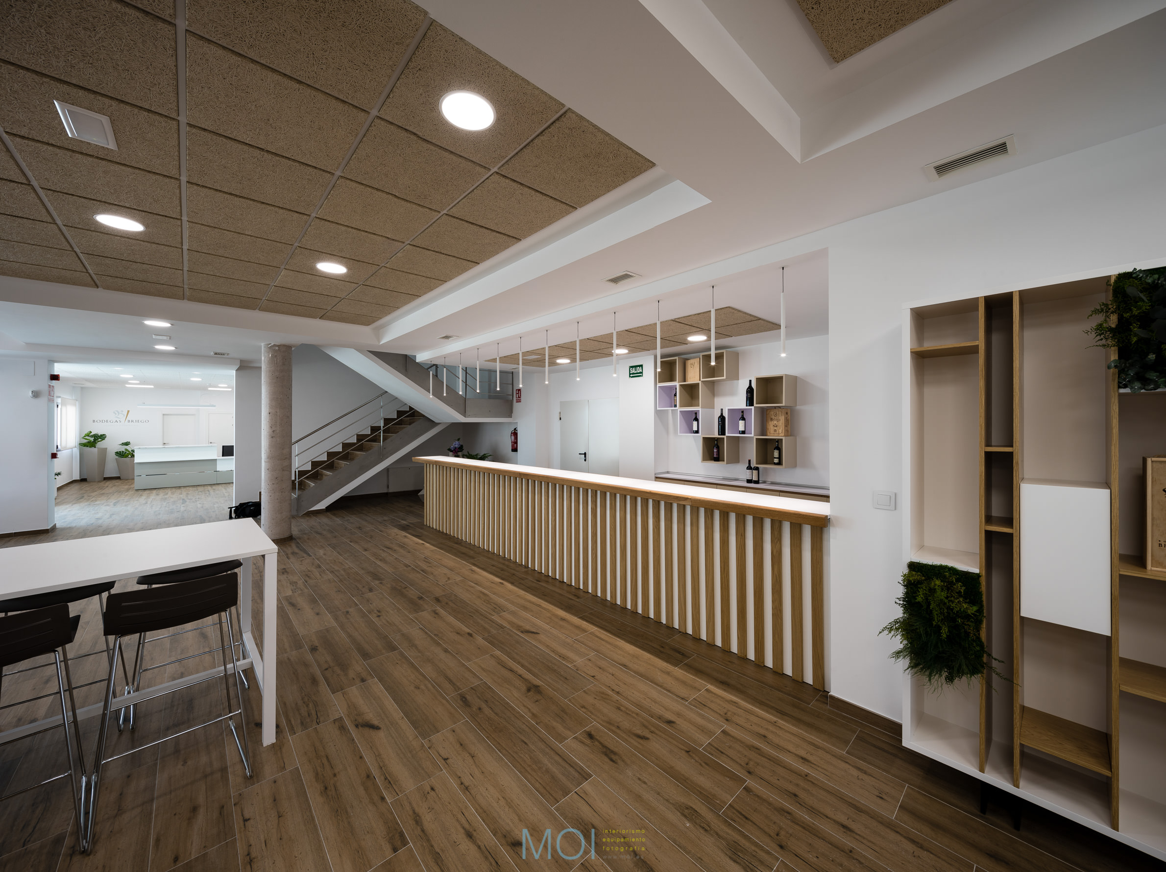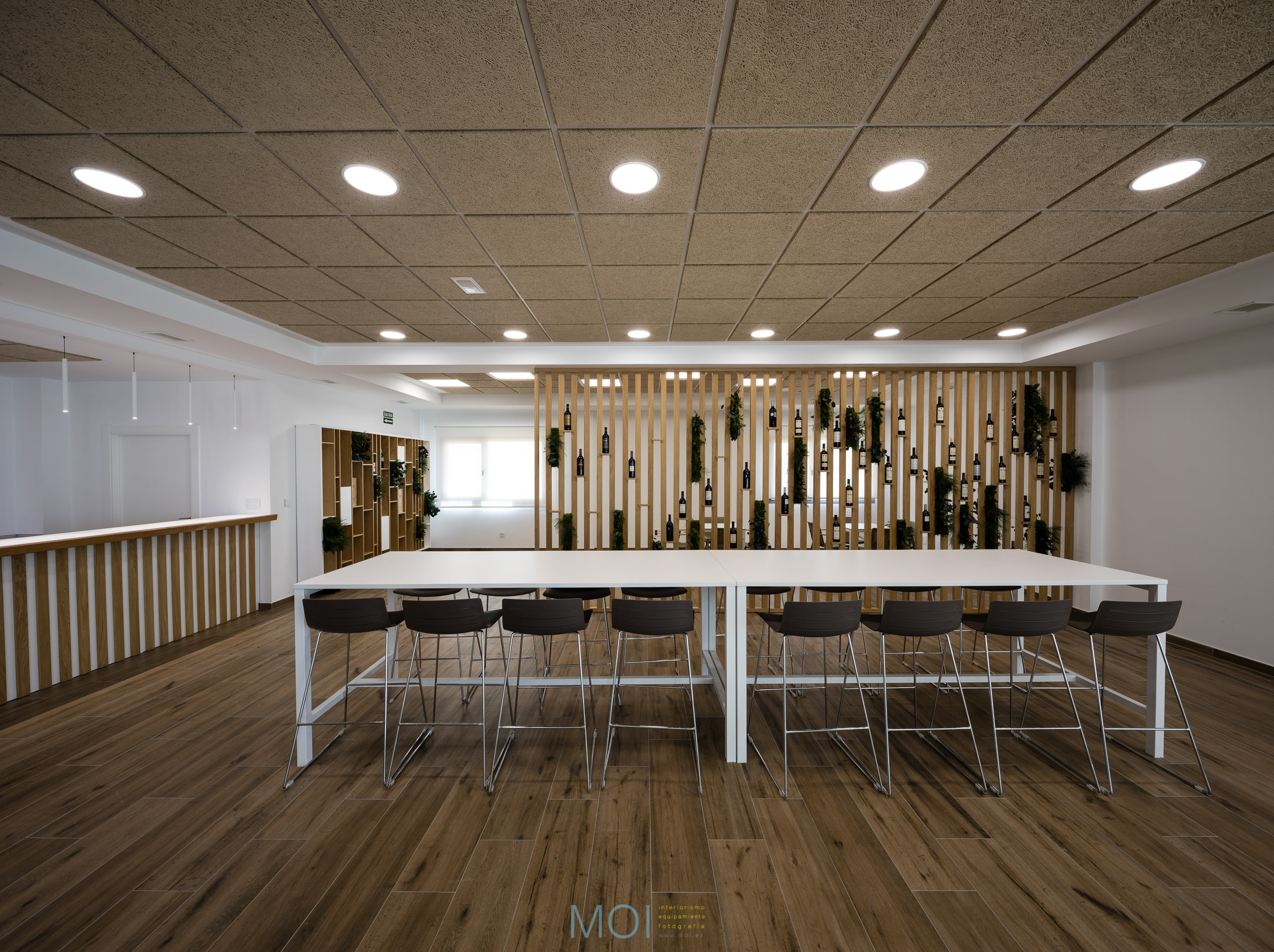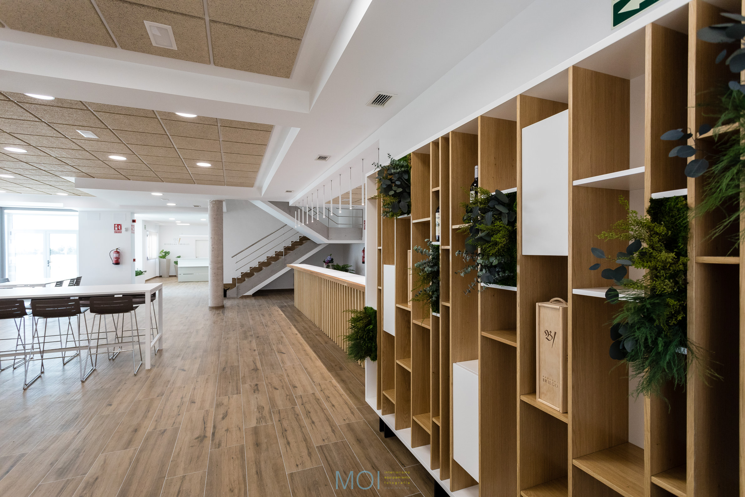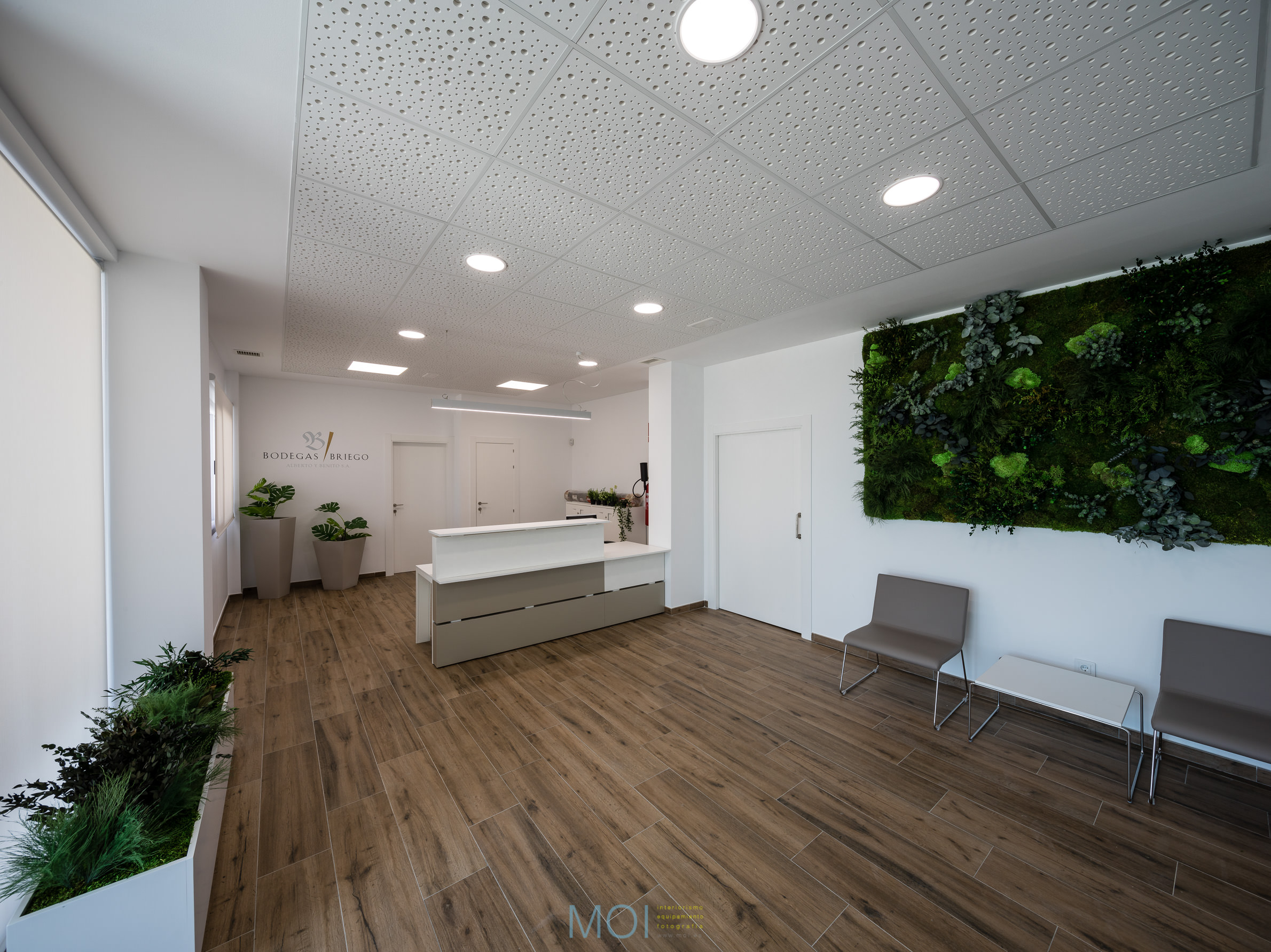 En Briego, MOI se ha ocupado del equipamiento integral del edificio: Mobiliario de oficina, mostradores, salas de catas, zonas de descanso, laboratorio, cocinas, comedores, mobiliario a medida, iluminación decorativa, complementos, jardines verticales, ebanistería, sistemas de oscurecimiento y control solar, alfombras… hasta los vinilos y el imponente logo de 20 metros de fachada.