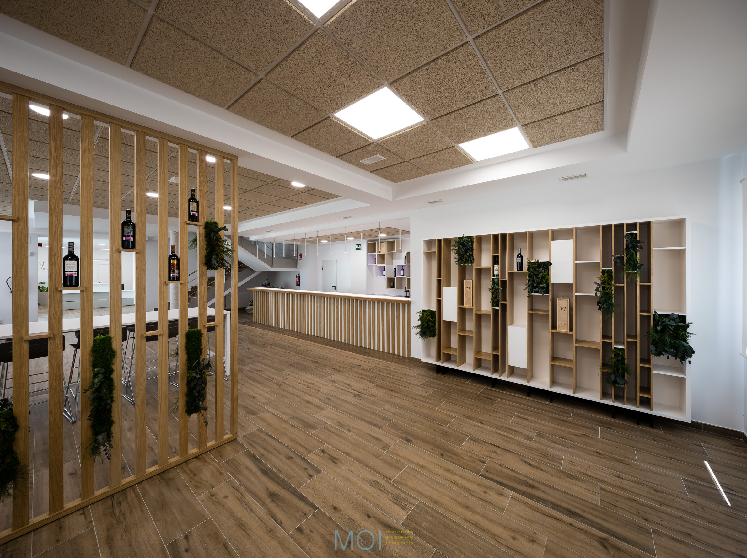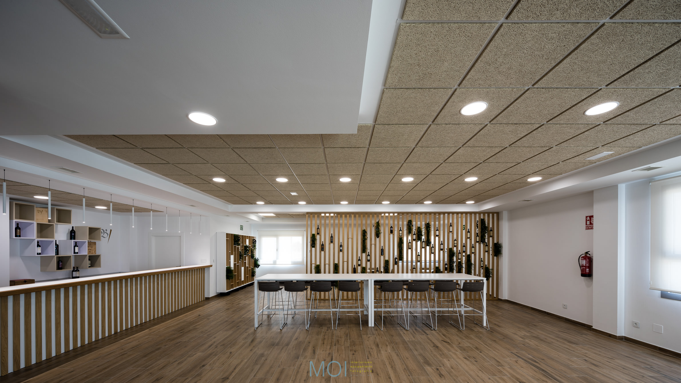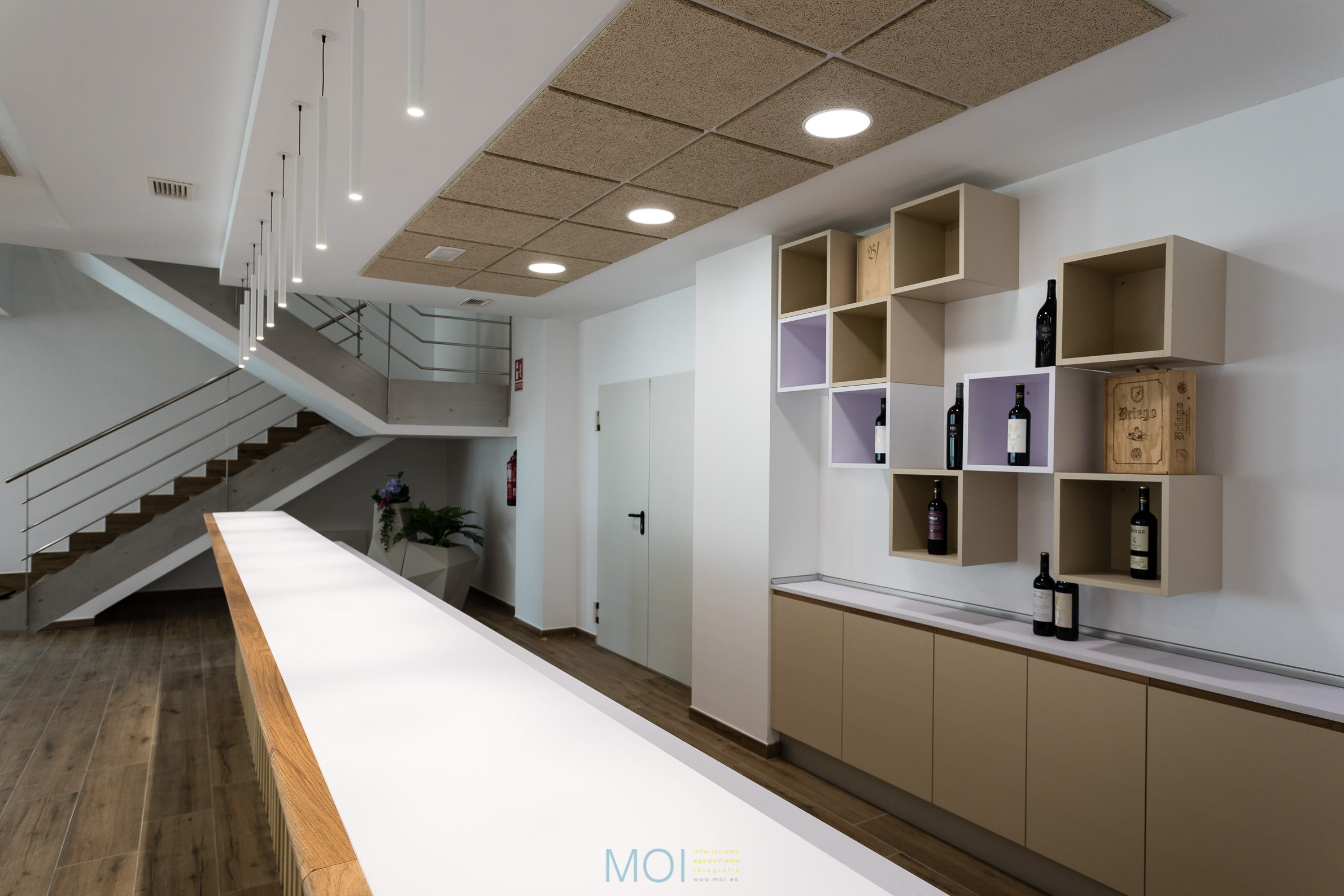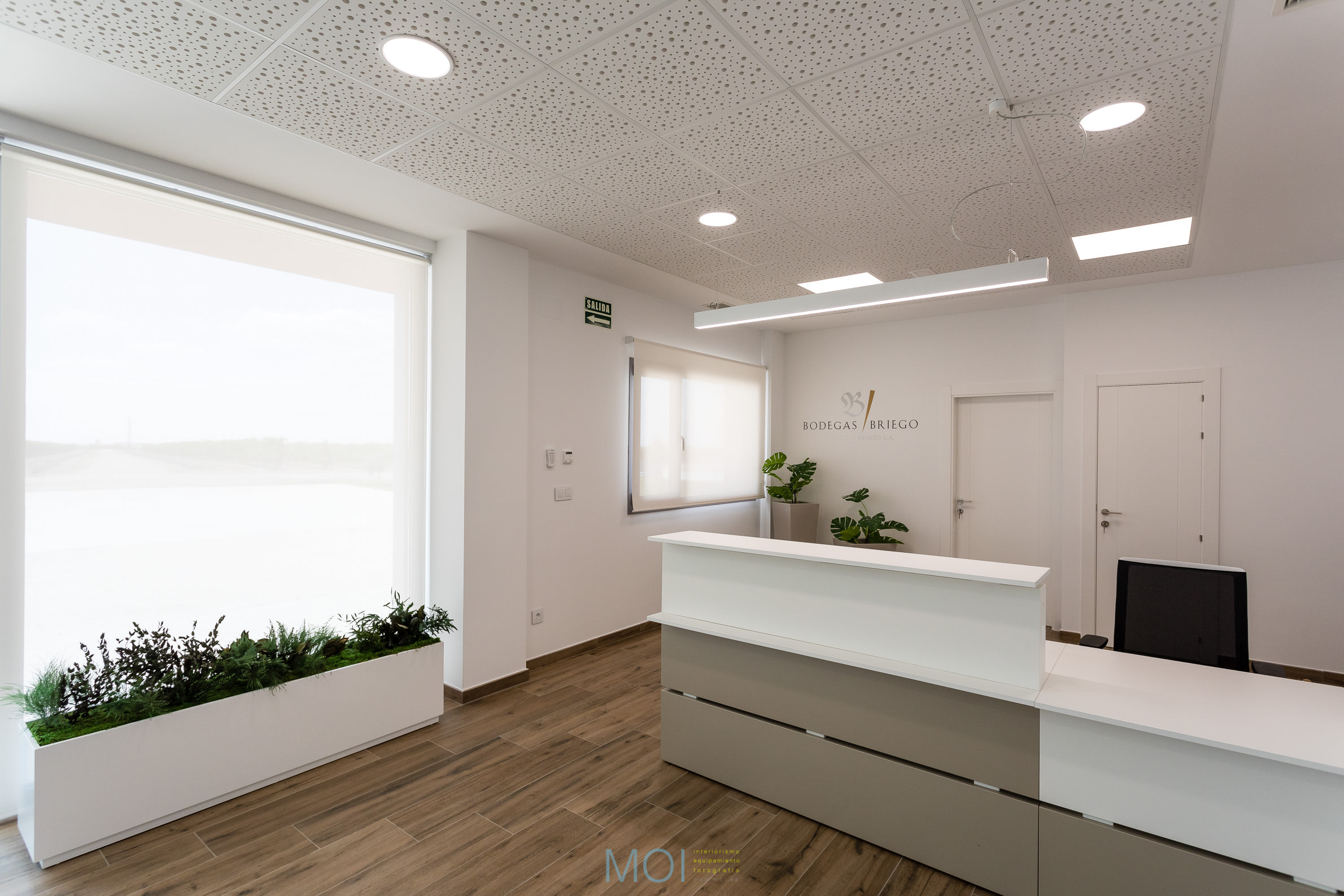 En Briego, MOI se ha ocupado del equipamiento integral del edificio: Mobiliario de oficina, mostradores, salas de catas, zonas de descanso, laboratorio, cocinas, comedores, mobiliario a medida, iluminación decorativa, complementos, jardines verticales, ebanistería, sistemas de oscurecimiento y control solar, alfombras… hasta los vinilos y el imponente logo de 20 metros de fachada.