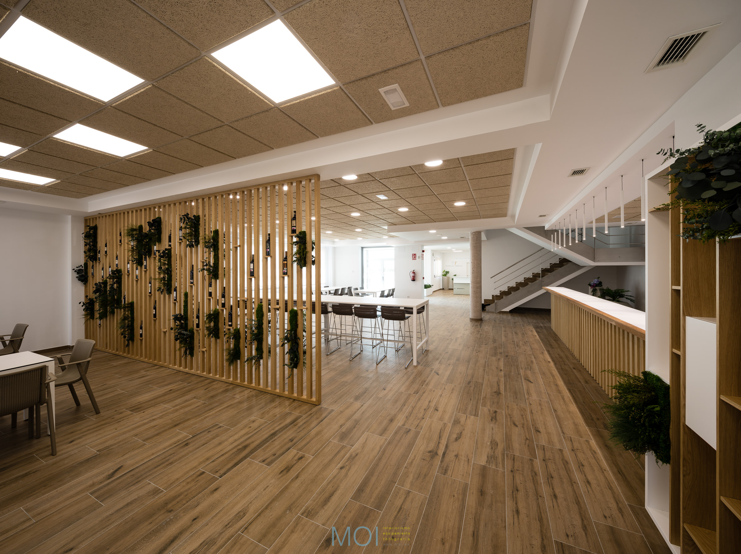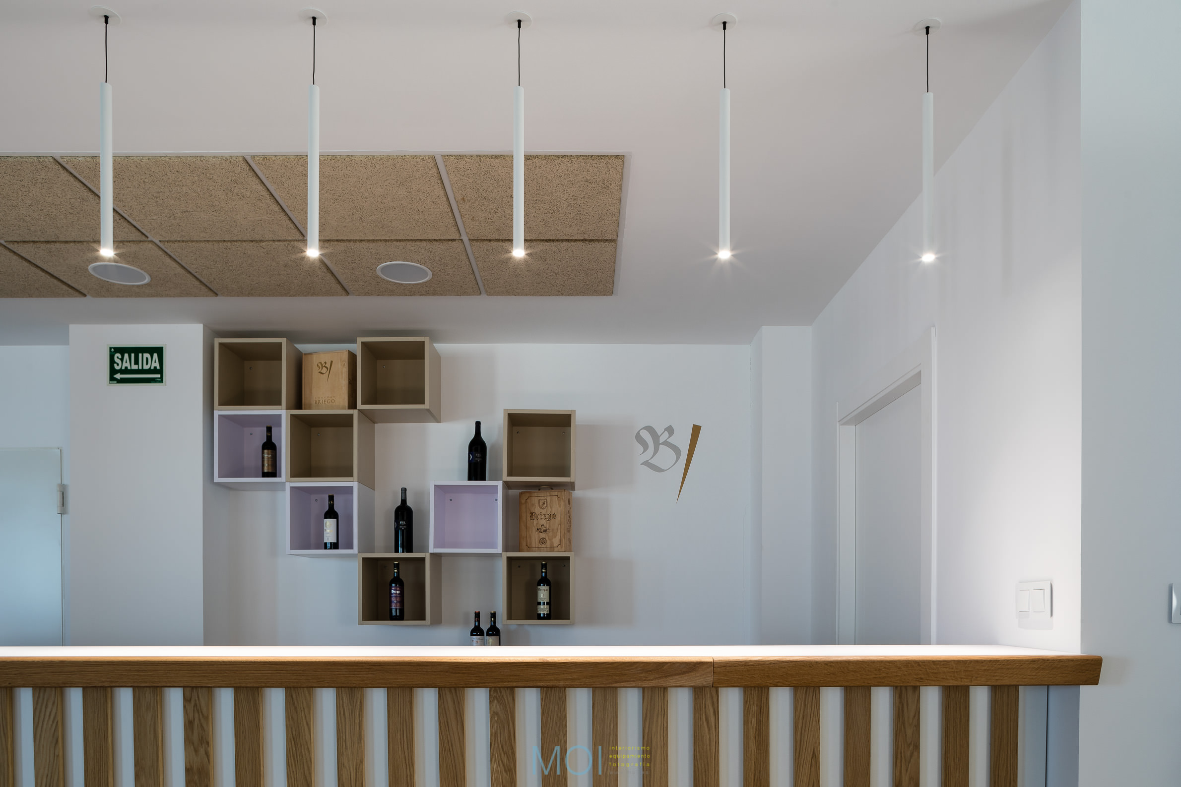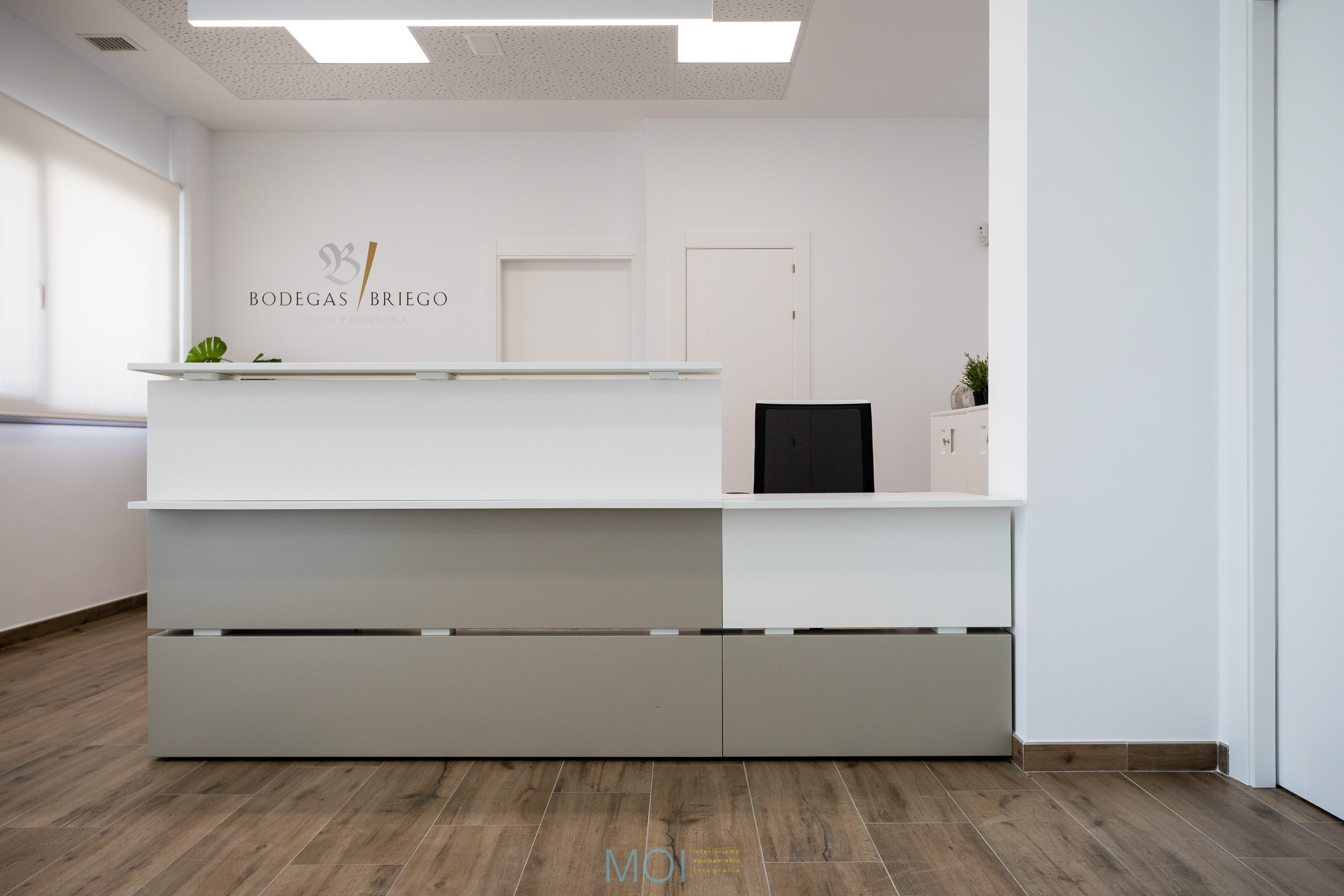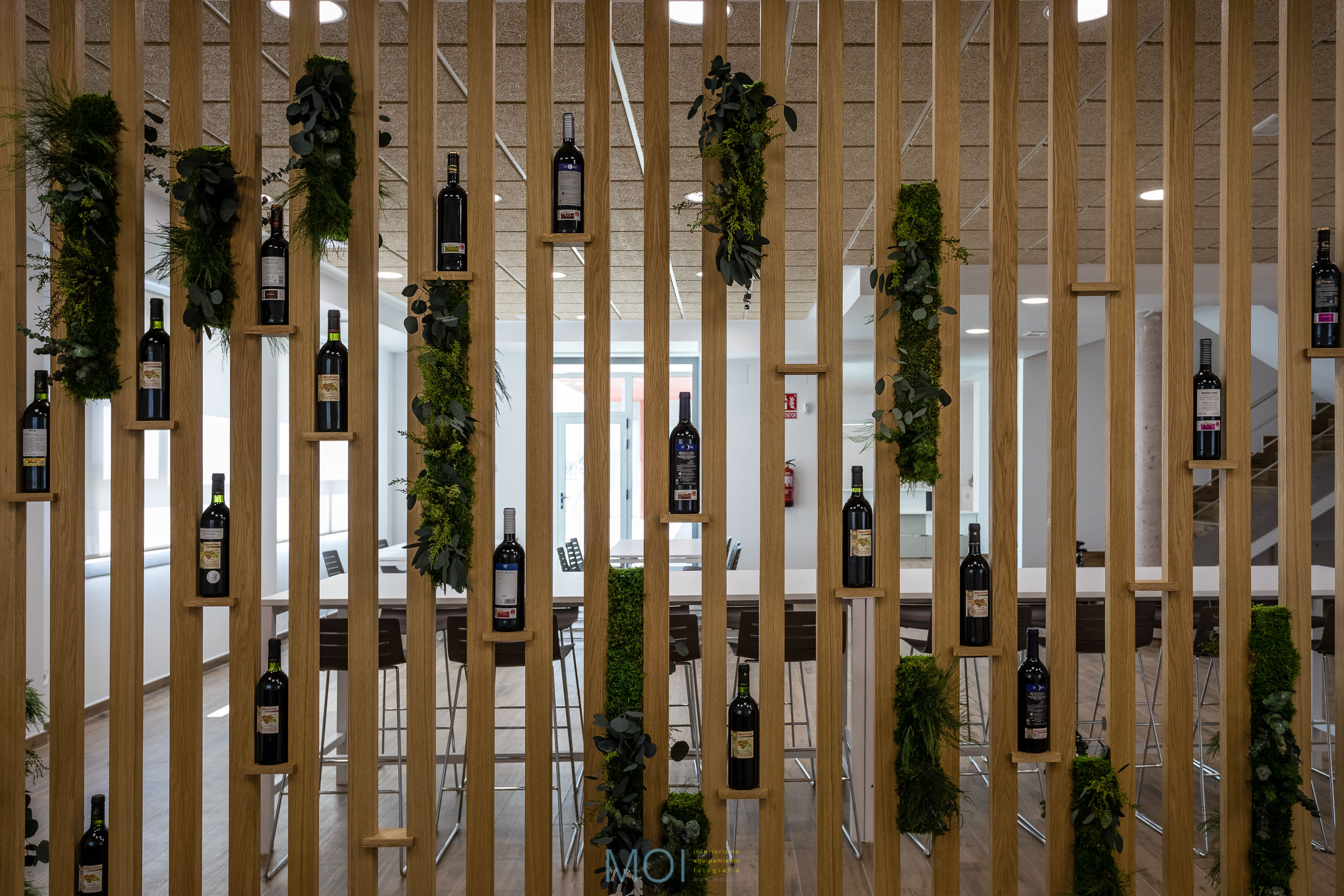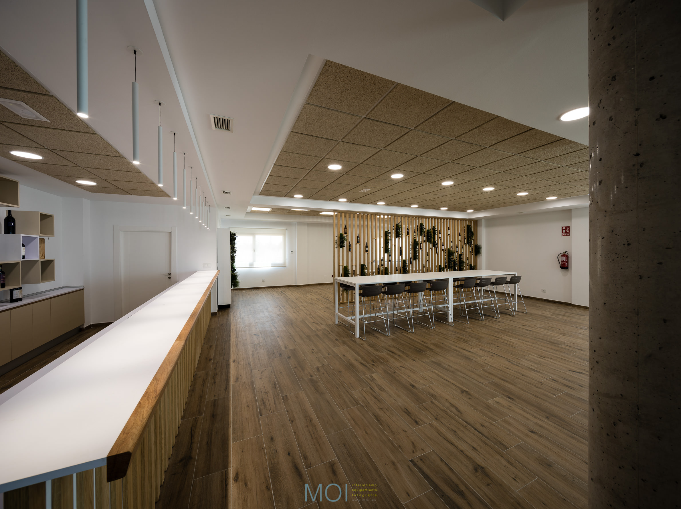 En Briego, MOI se ha ocupado del equipamiento integral del edificio: Mobiliario de oficina, mostradores, salas de catas, zonas de descanso, laboratorio, cocinas, comedores, mobiliario a medida, iluminación decorativa, complementos, jardines verticales, ebanistería, sistemas de oscurecimiento y control solar, alfombras… hasta los vinilos y el imponente logo de 20 metros de fachada.