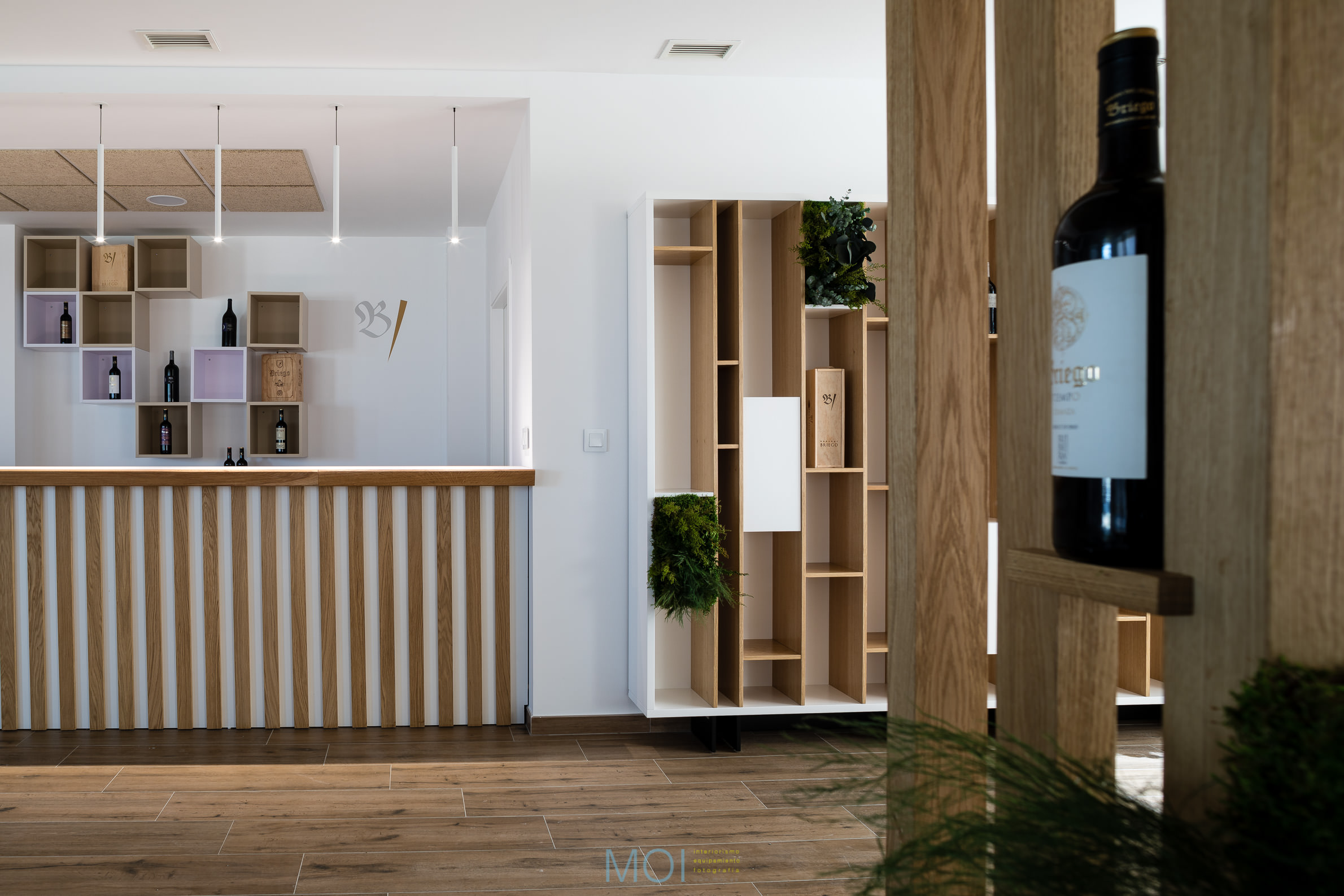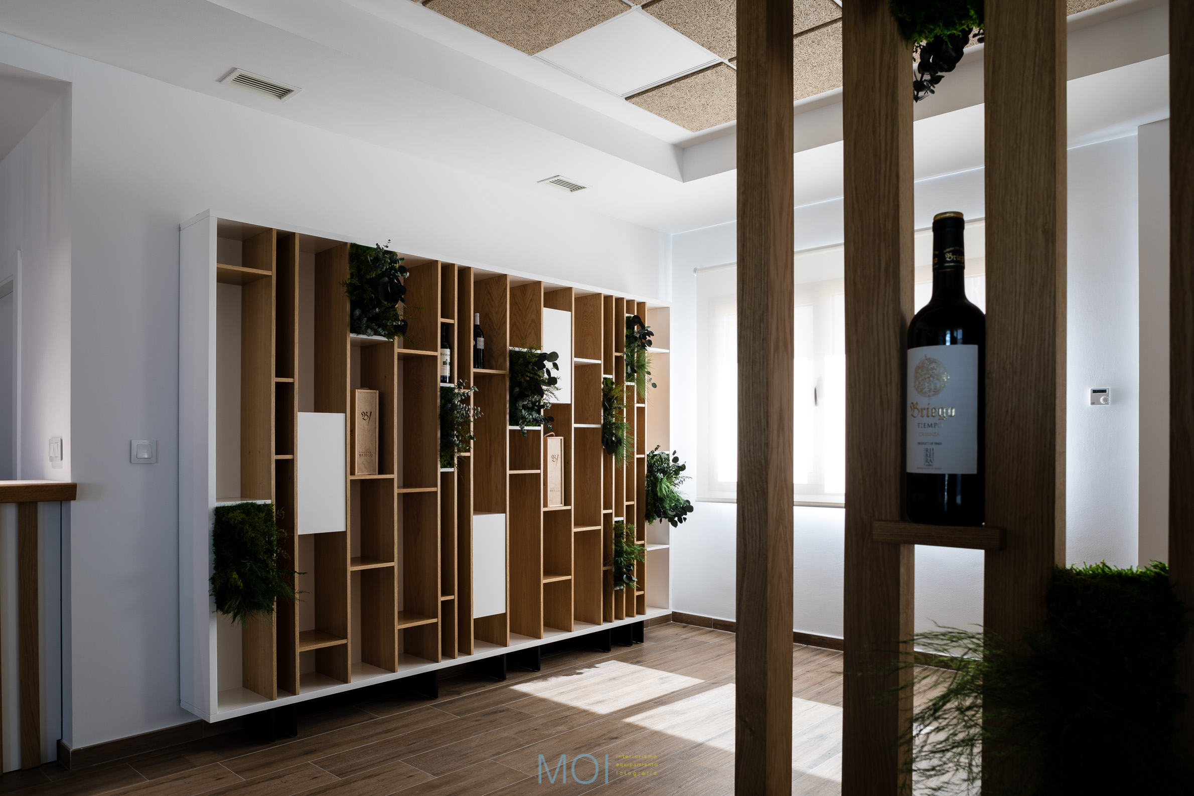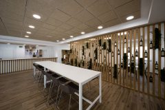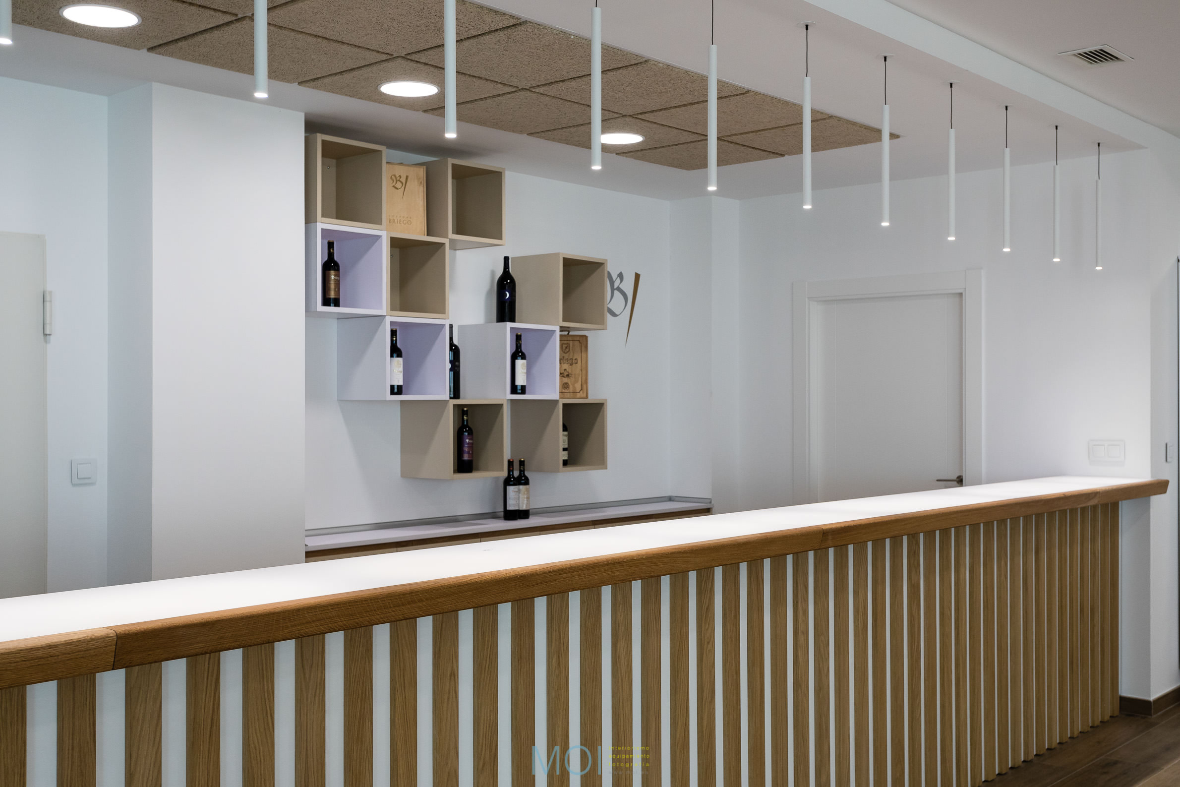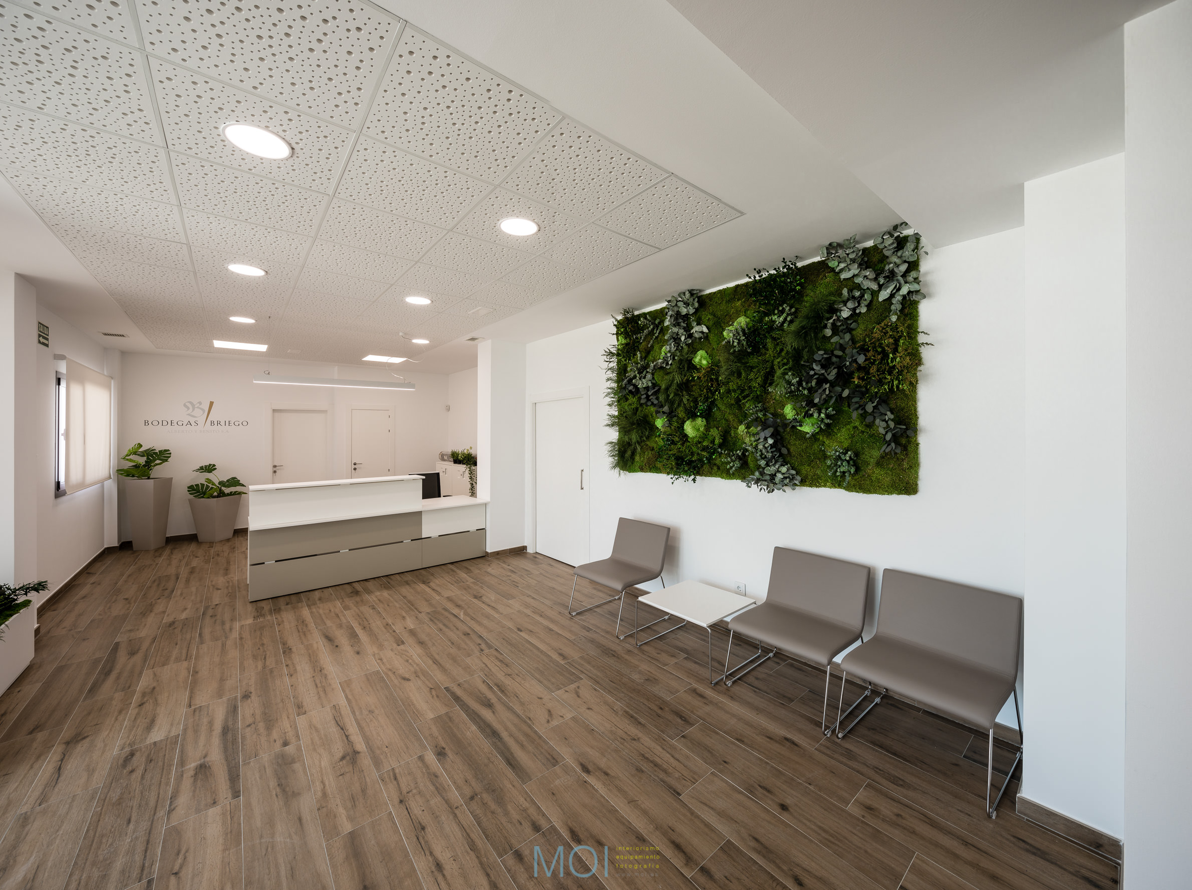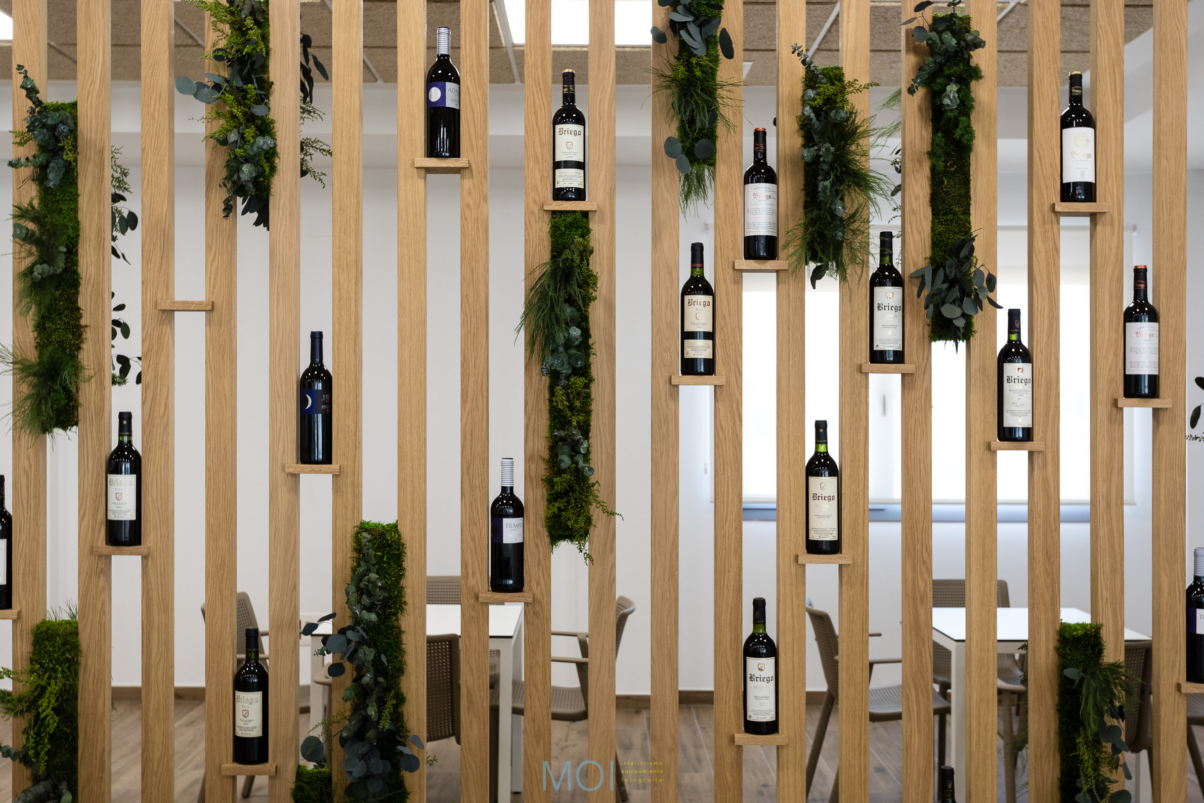 En Briego, MOI se ha ocupado del equipamiento integral del edificio: Mobiliario de oficina, mostradores, salas de catas, zonas de descanso, laboratorio, cocinas, comedores, mobiliario a medida, iluminación decorativa, complementos, jardines verticales, ebanistería, sistemas de oscurecimiento y control solar, alfombras… hasta los vinilos y el imponente logo de 20 metros de fachada.