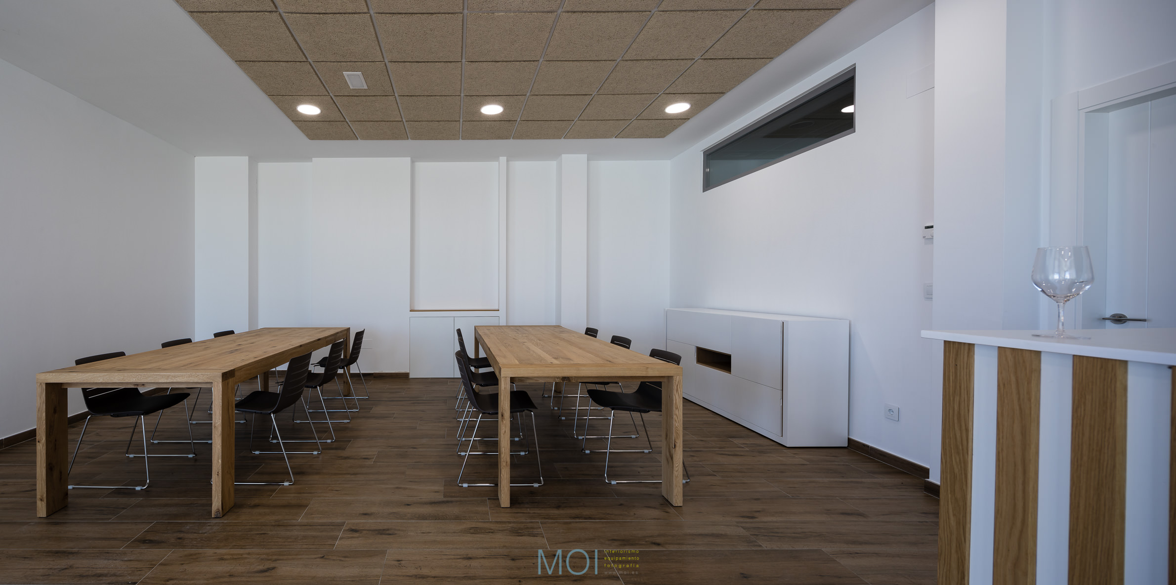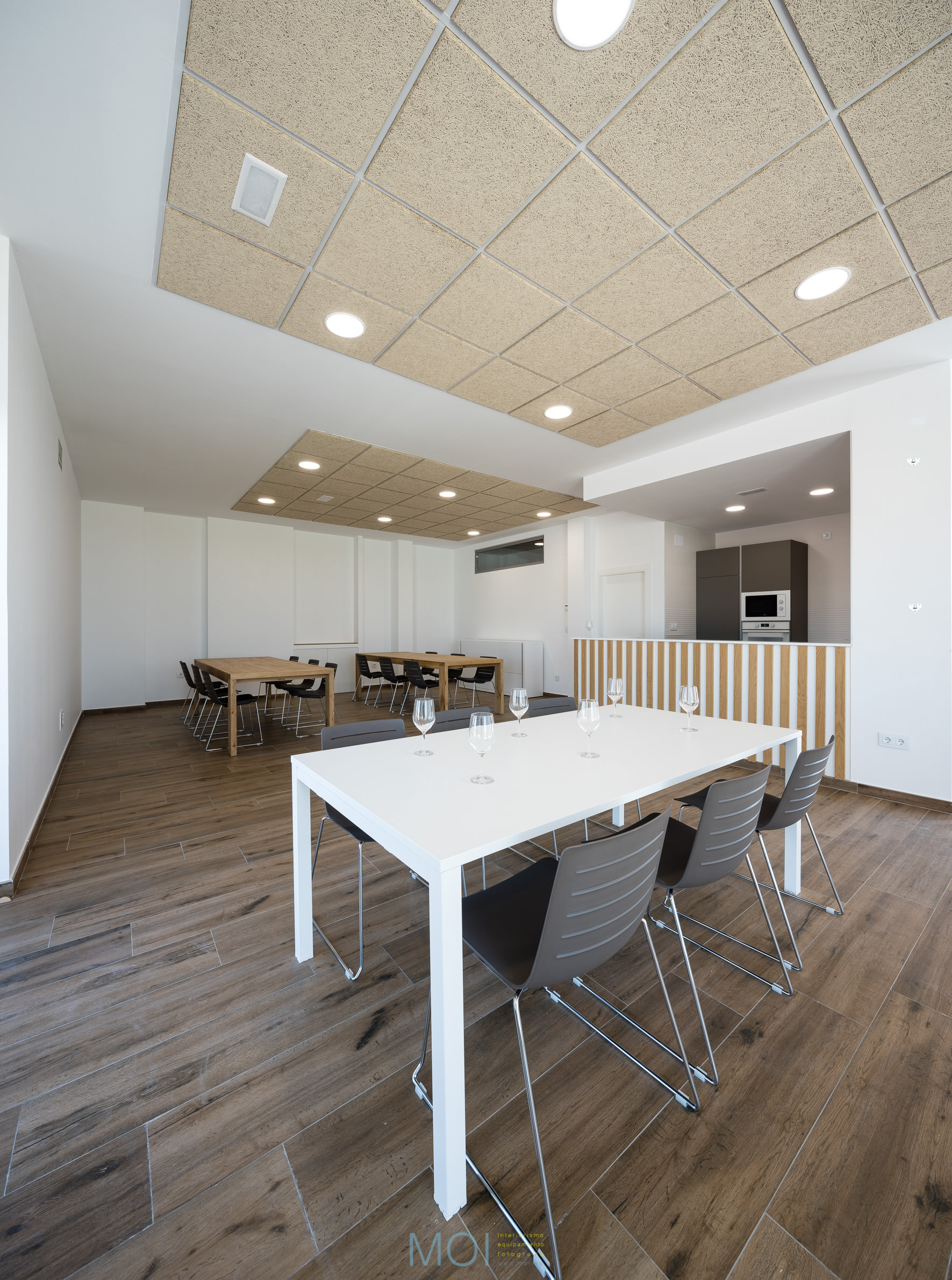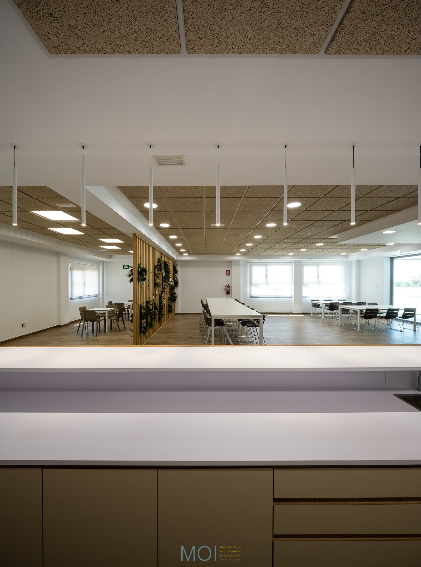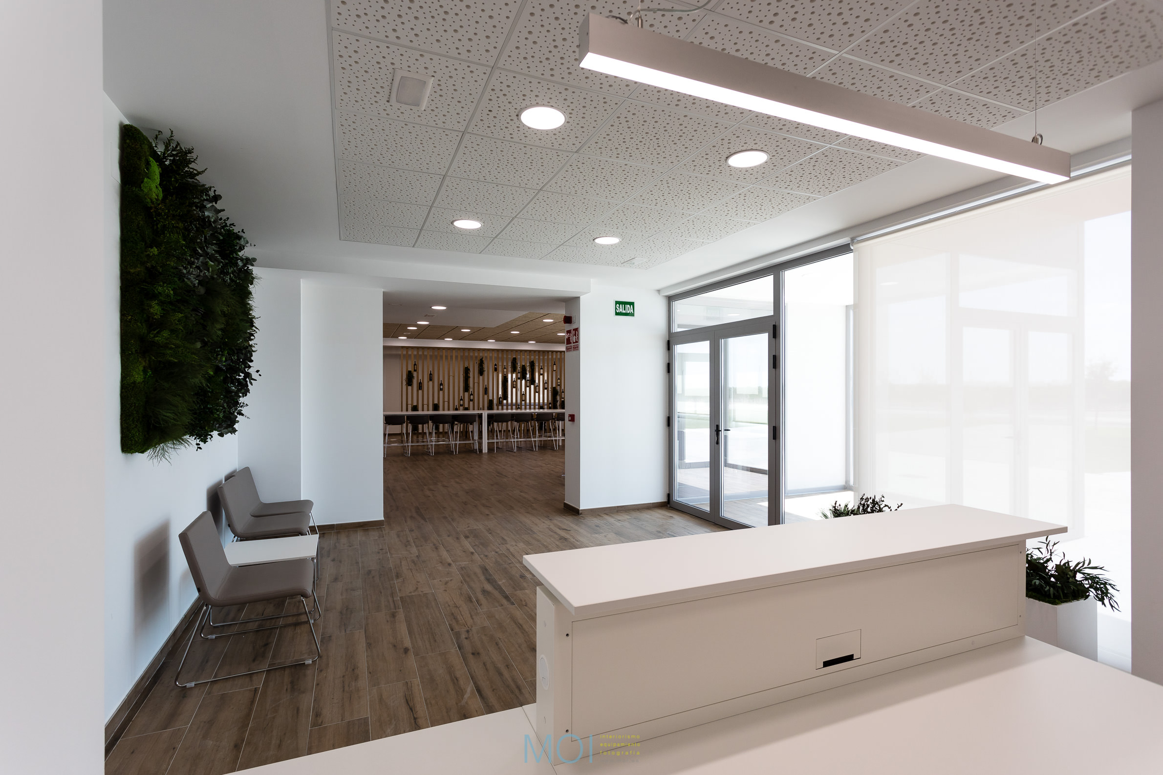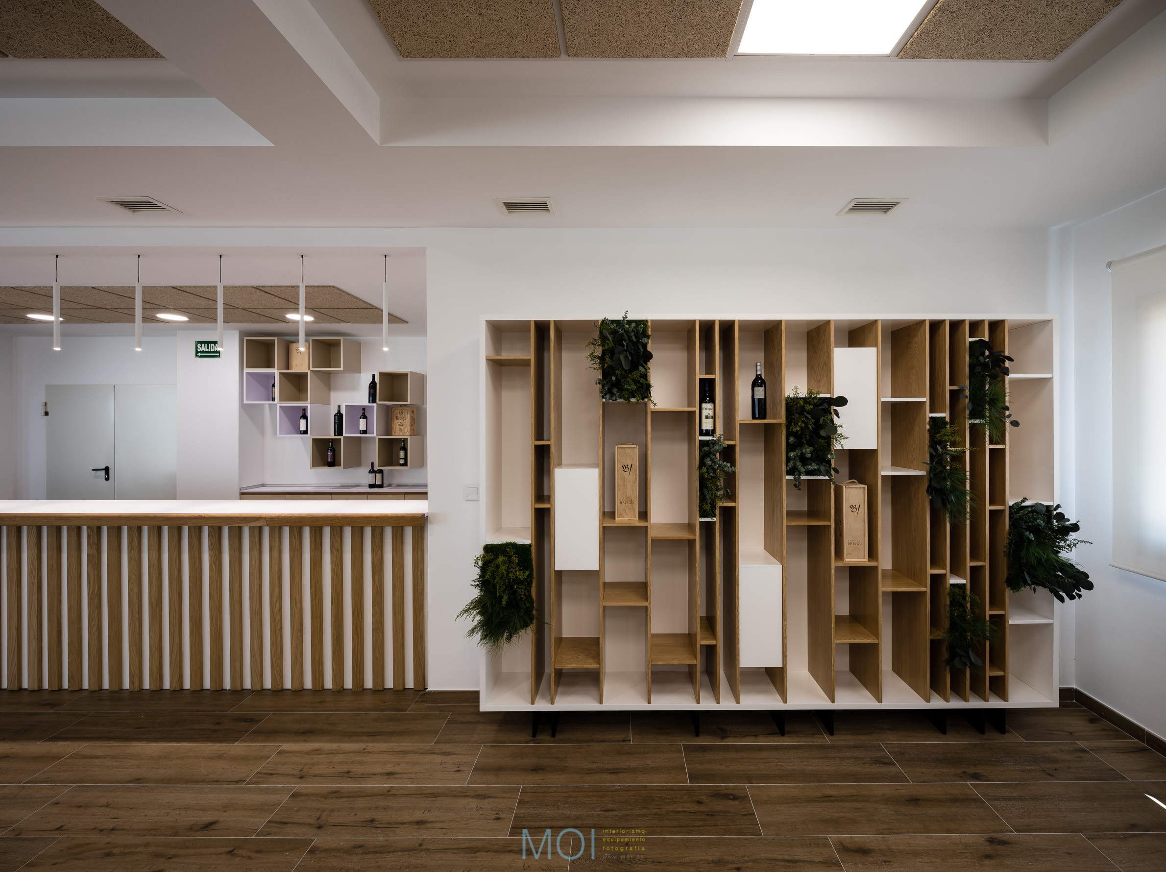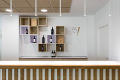 En Briego, MOI se ha ocupado del equipamiento integral del edificio: Mobiliario de oficina, mostradores, salas de catas, zonas de descanso, laboratorio, cocinas, comedores, mobiliario a medida, iluminación decorativa, complementos, jardines verticales, ebanistería, sistemas de oscurecimiento y control solar, alfombras… hasta los vinilos y el imponente logo de 20 metros de fachada.