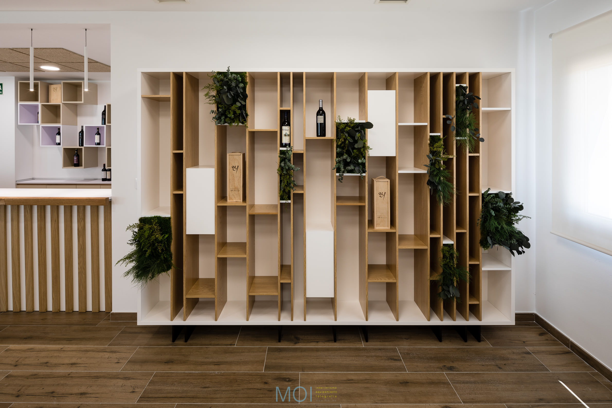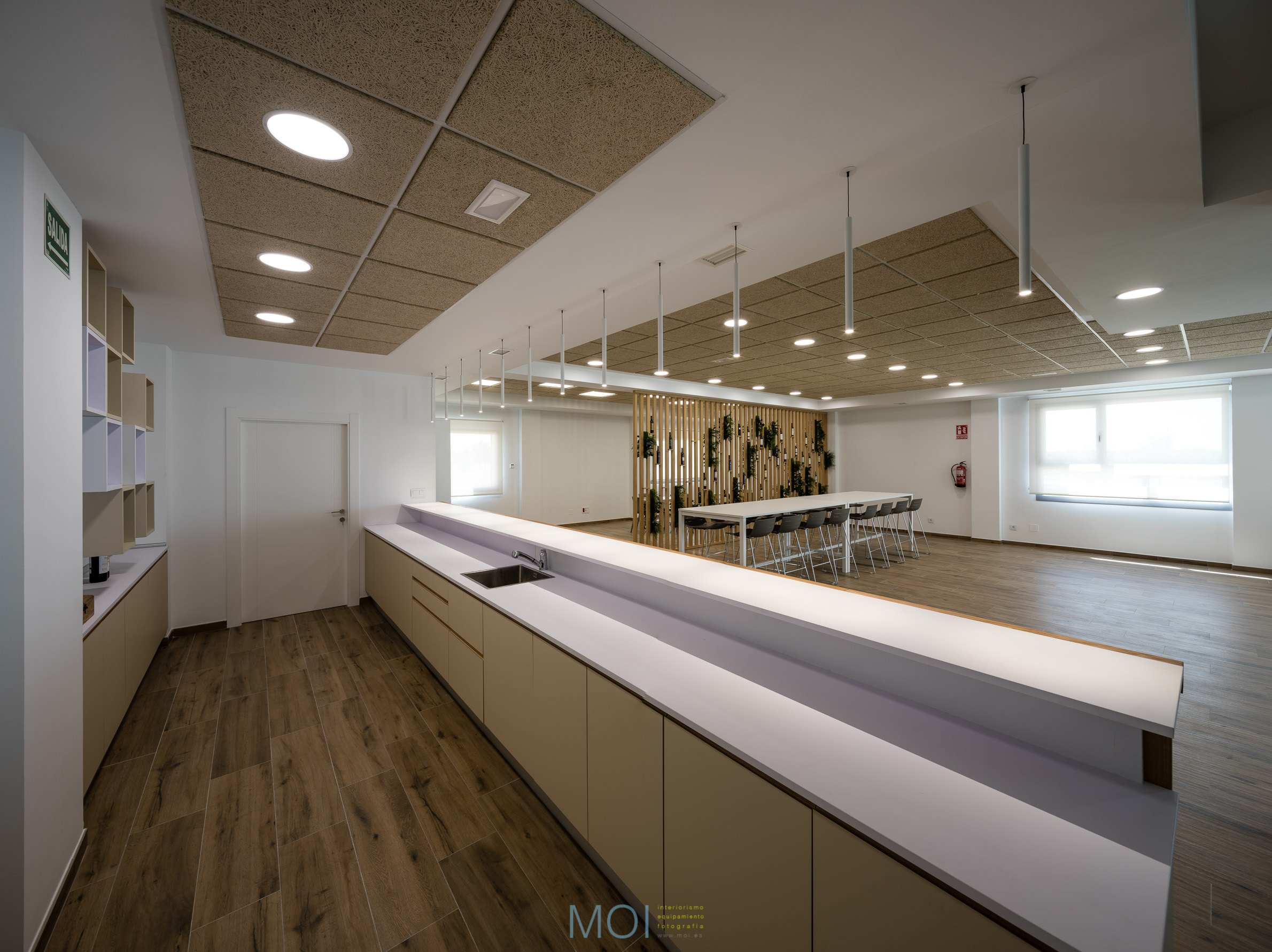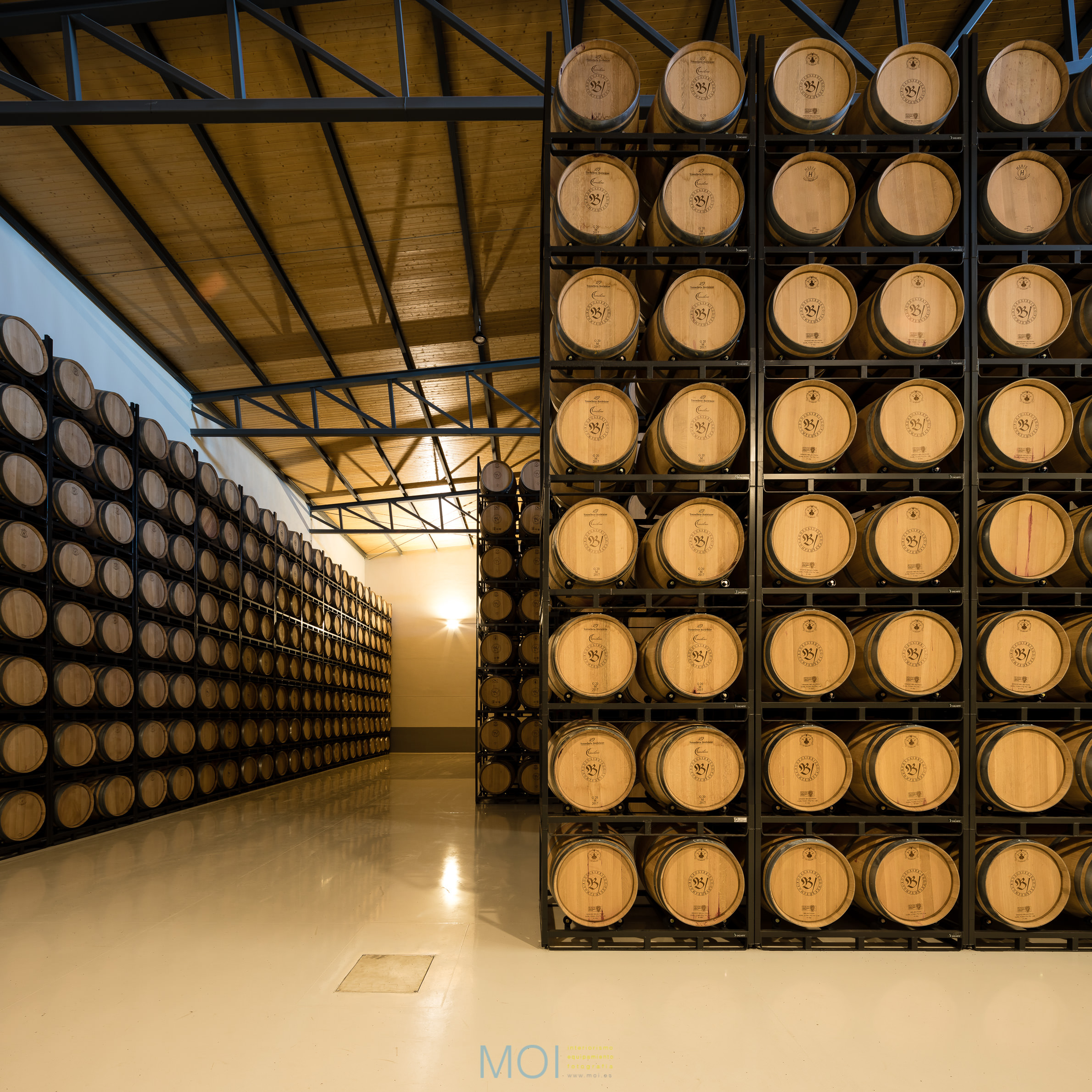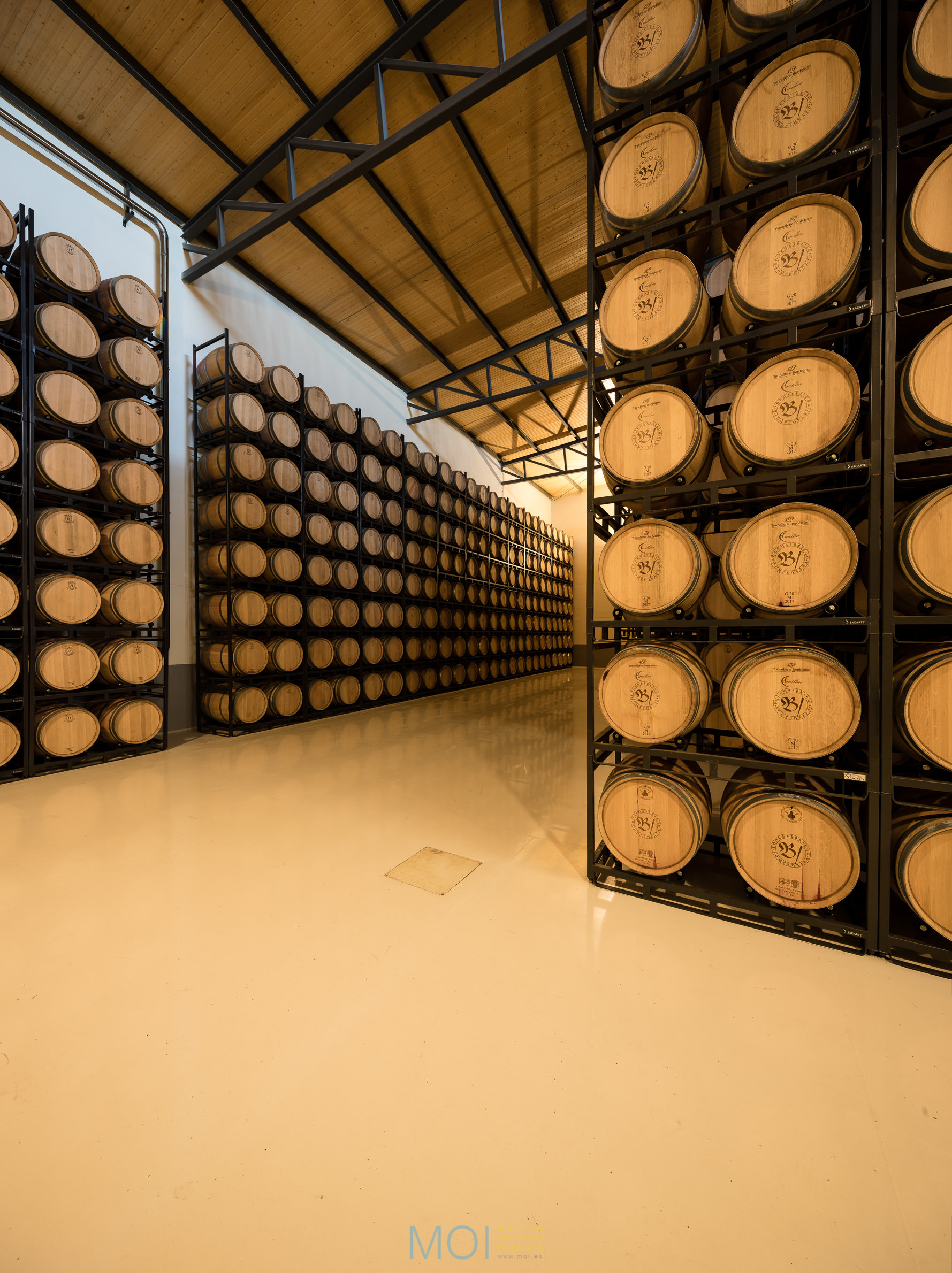 En Briego, MOI se ha ocupado del equipamiento integral del edificio: Mobiliario de oficina, mostradores, salas de catas, zonas de descanso, laboratorio, cocinas, comedores, mobiliario a medida, iluminación decorativa, complementos, jardines verticales, ebanistería, sistemas de oscurecimiento y control solar, alfombras… hasta los vinilos y el imponente logo de 20 metros de fachada.