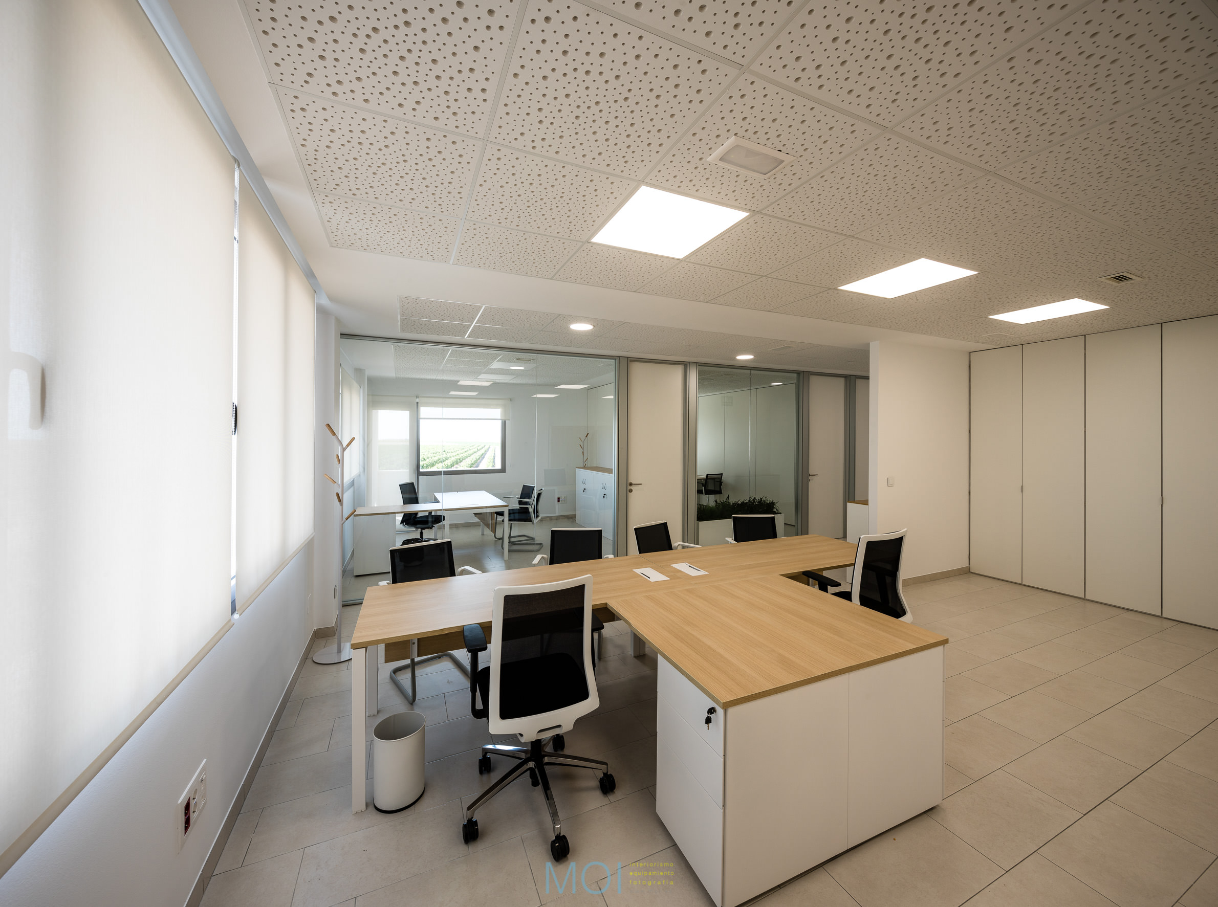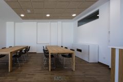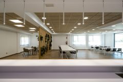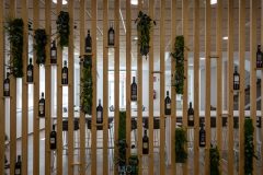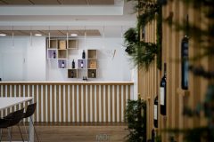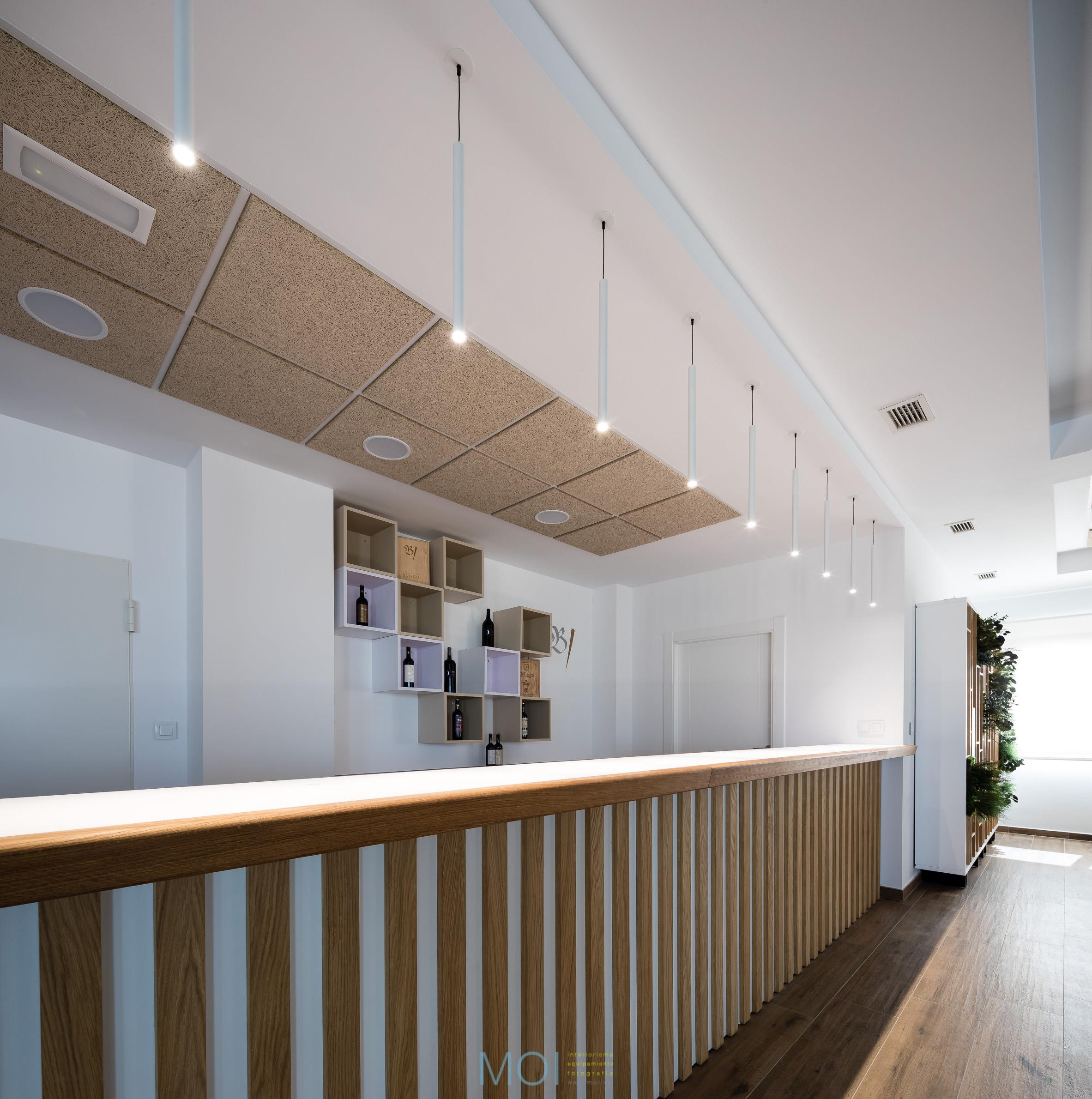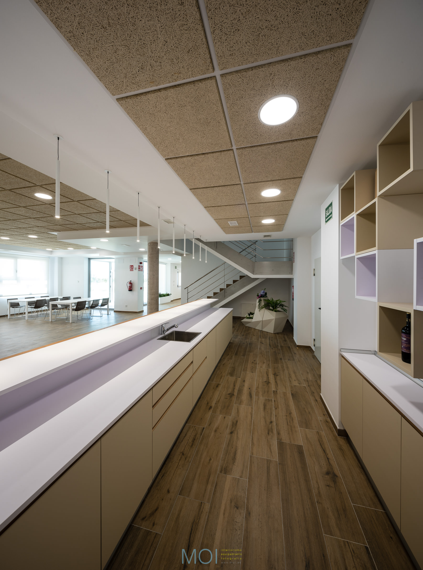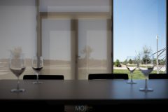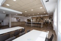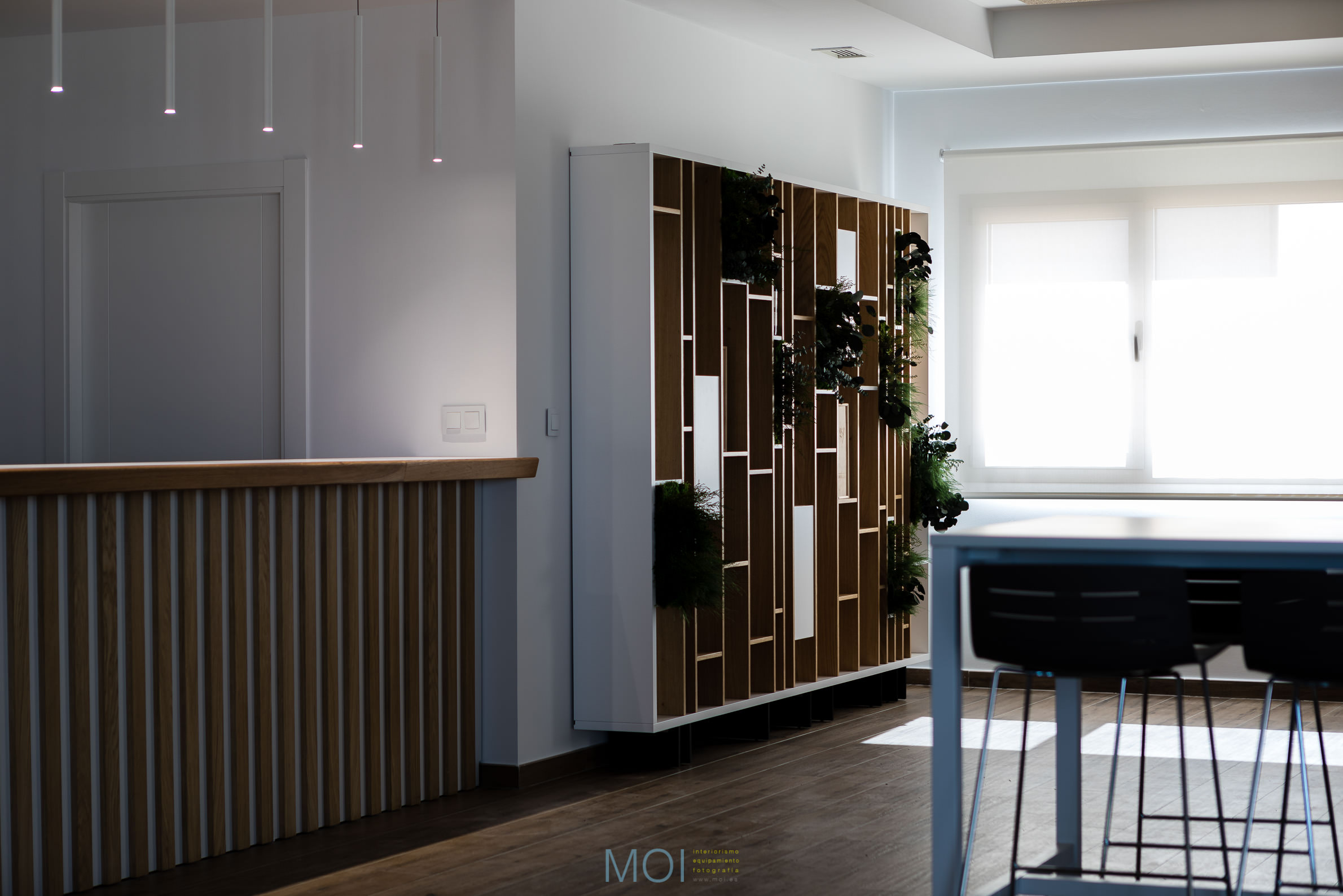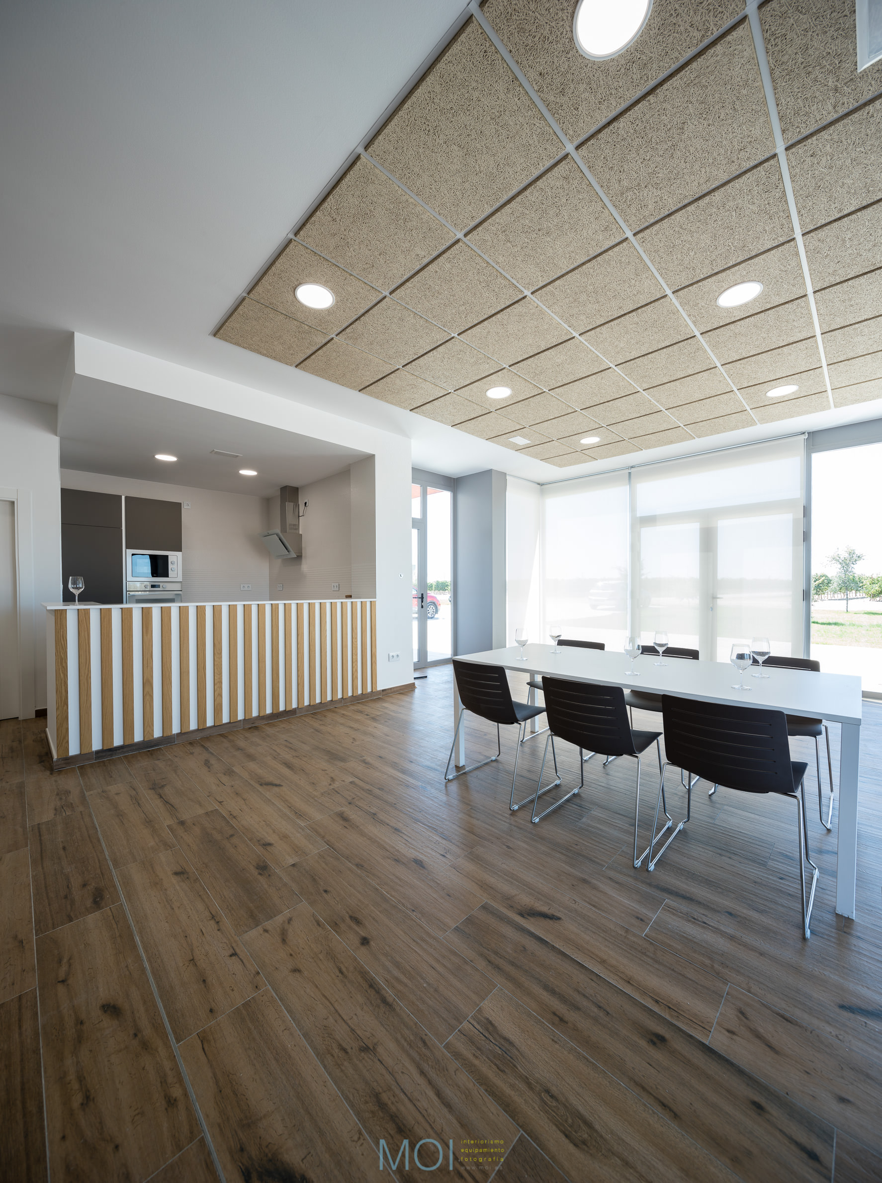 En Briego, MOI se ha ocupado del equipamiento integral del edificio: Mobiliario de oficina, mostradores, salas de catas, zonas de descanso, laboratorio, cocinas, comedores, mobiliario a medida, iluminación decorativa, complementos, jardines verticales, ebanistería, sistemas de oscurecimiento y control solar, alfombras… hasta los vinilos y el imponente logo de 20 metros de fachada.