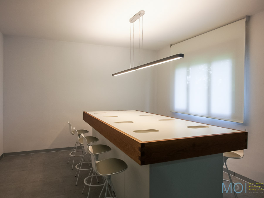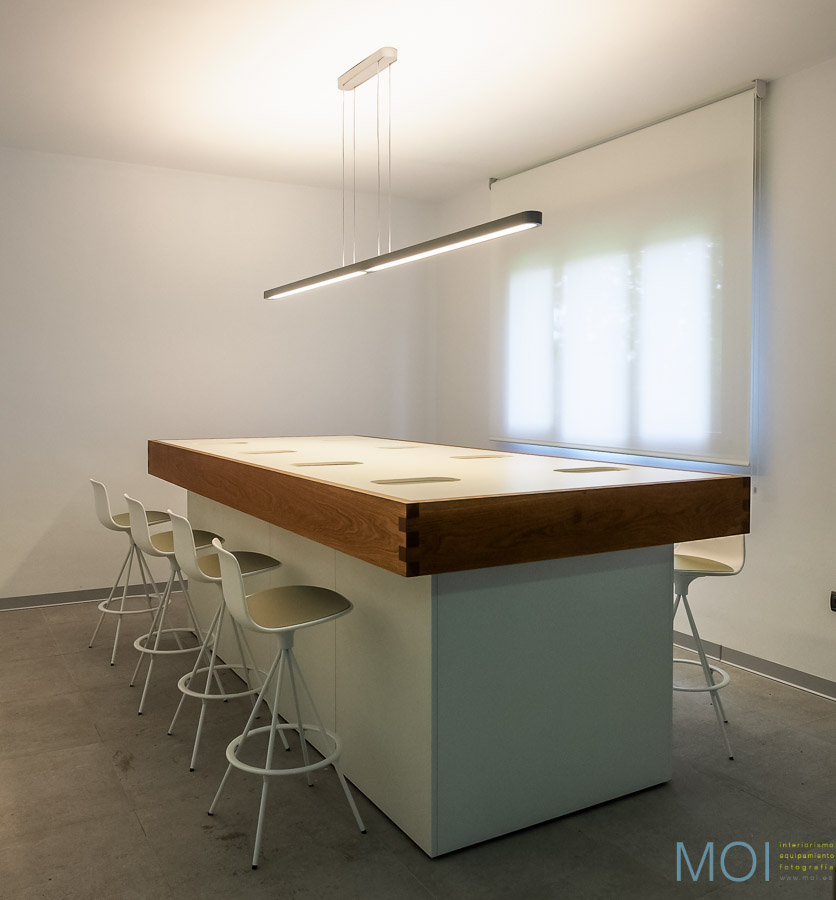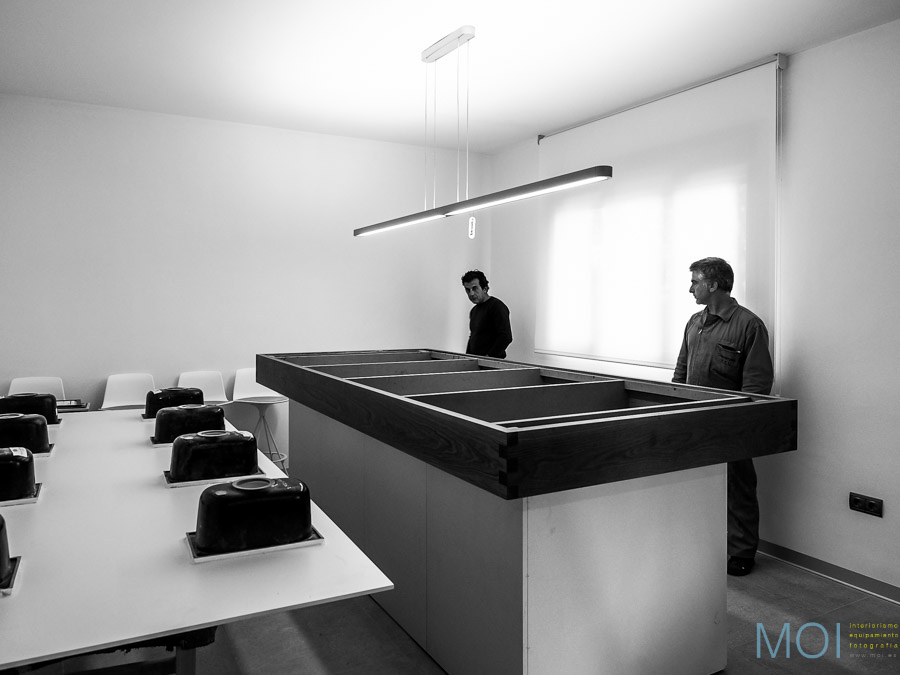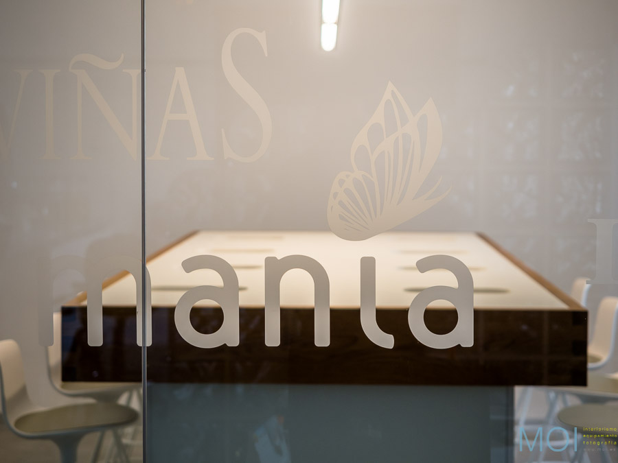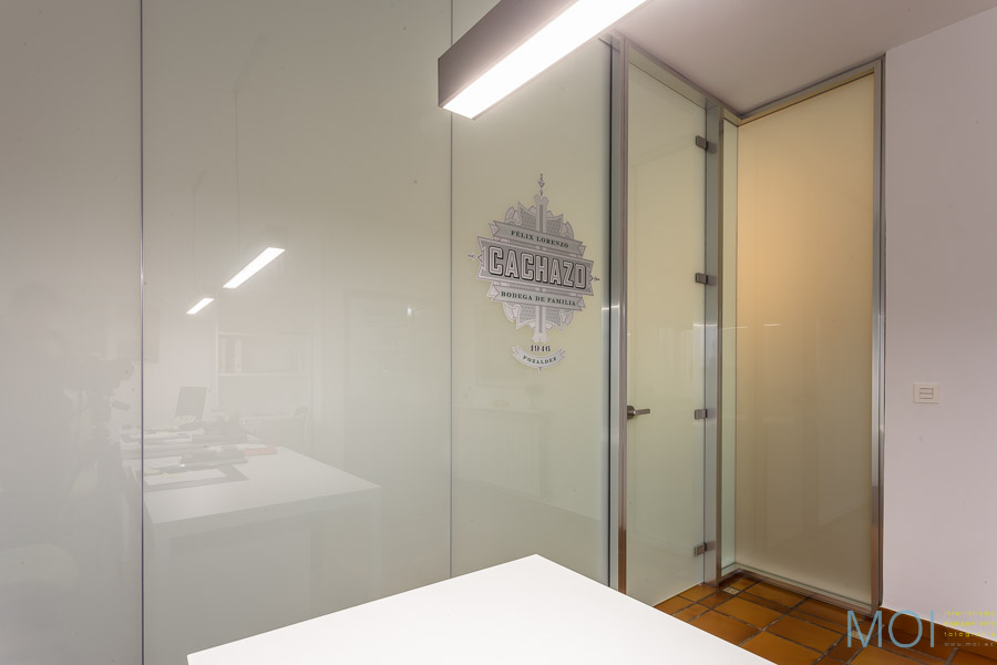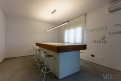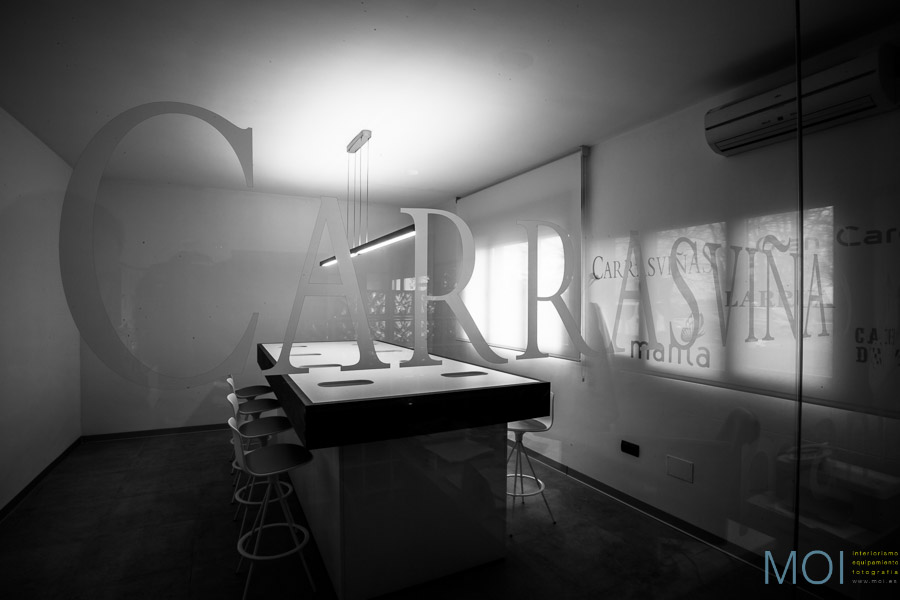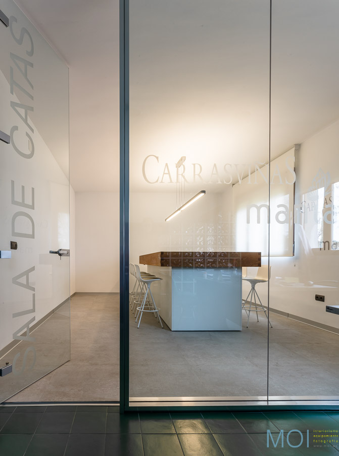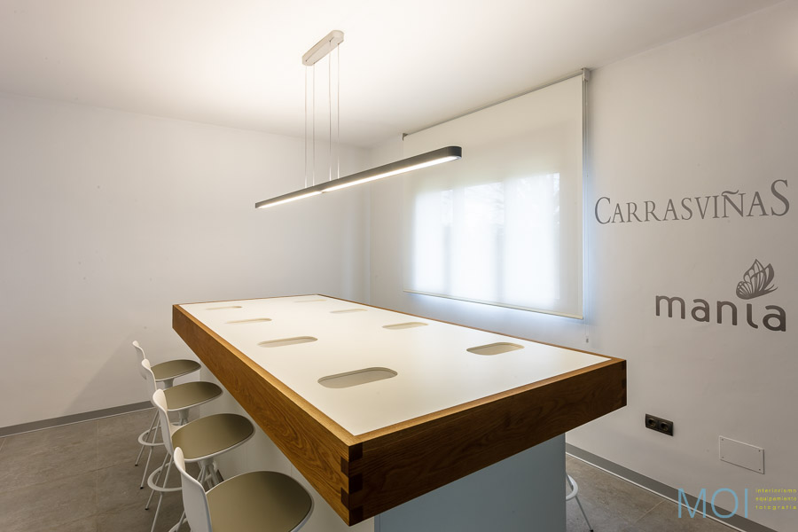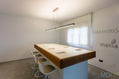MOI ha contribuído con mamparas, iluminación, vinilos, cortinas y mobiliario, entre el que destaca la mesa de catas diseñada y fabricada en exclusiva para esta bodega.