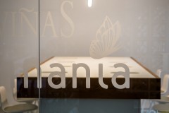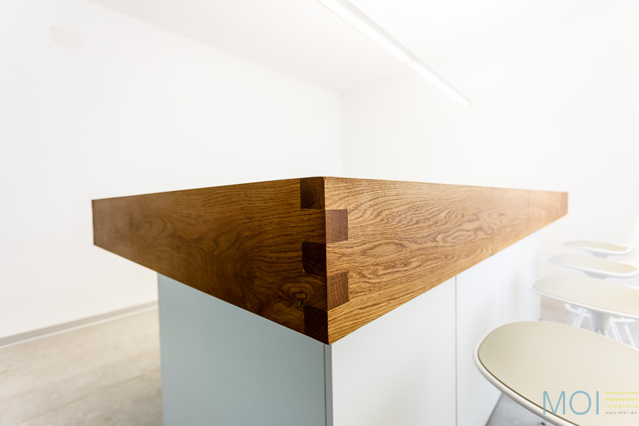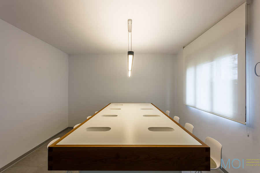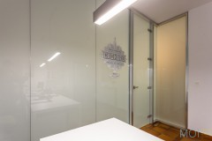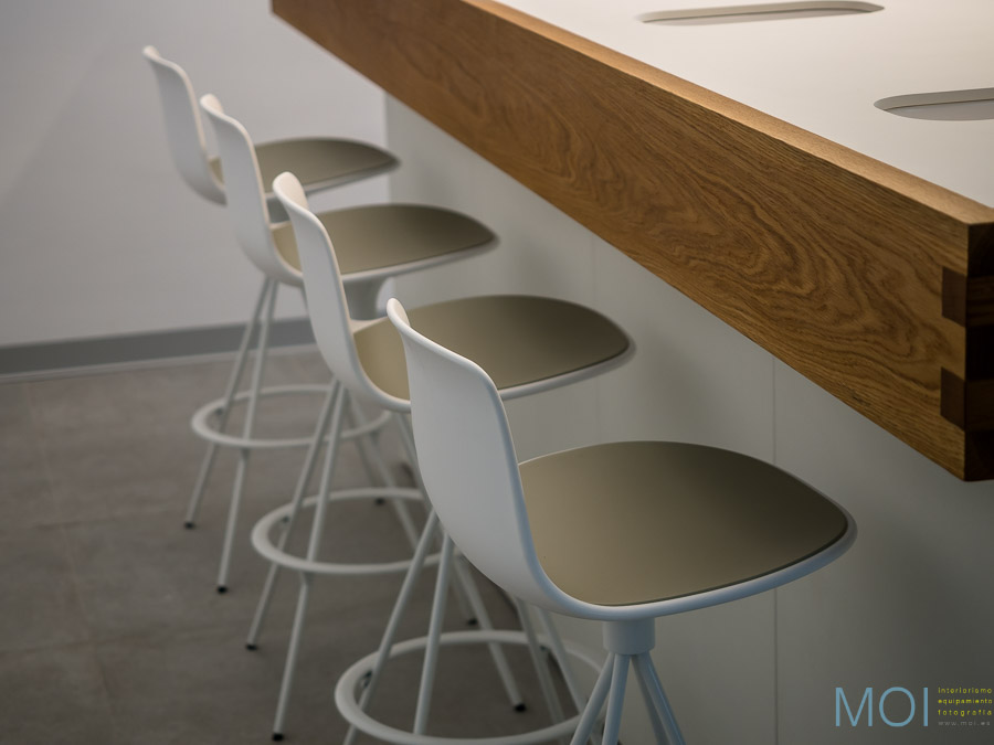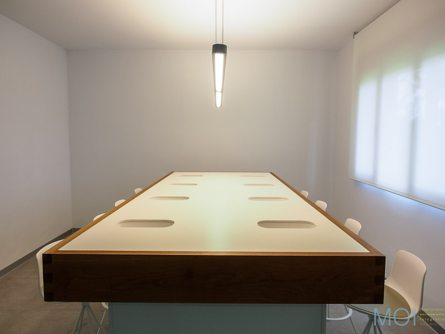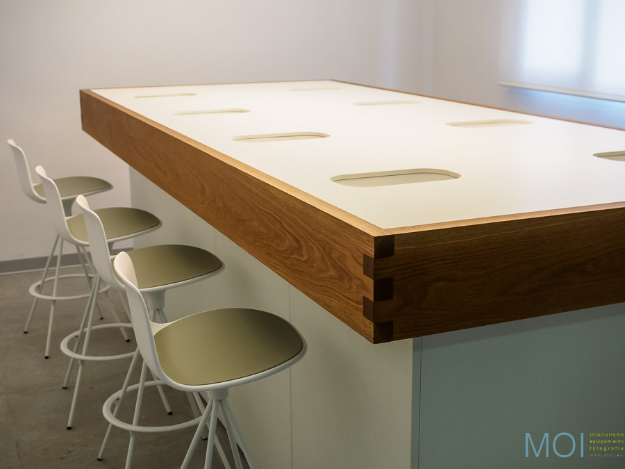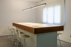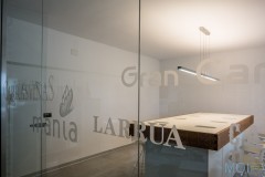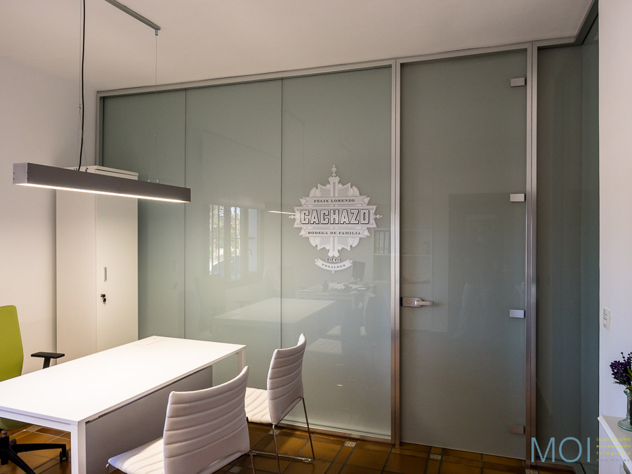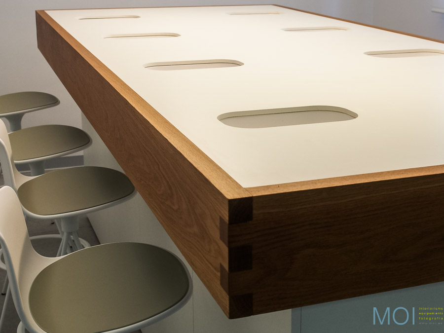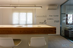 MOI ha contribuído con mamparas, iluminación, vinilos, cortinas y mobiliario, entre el que destaca la mesa de catas diseñada y fabricada en exclusiva para esta bodega.