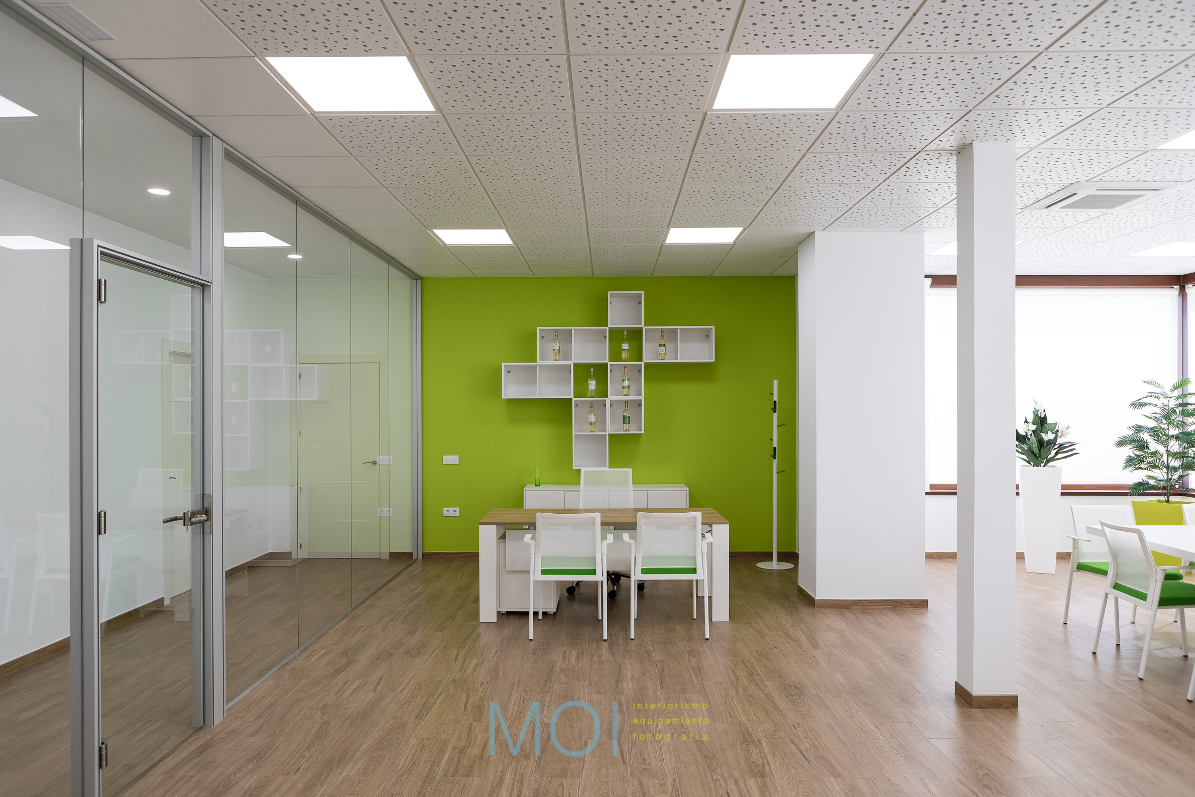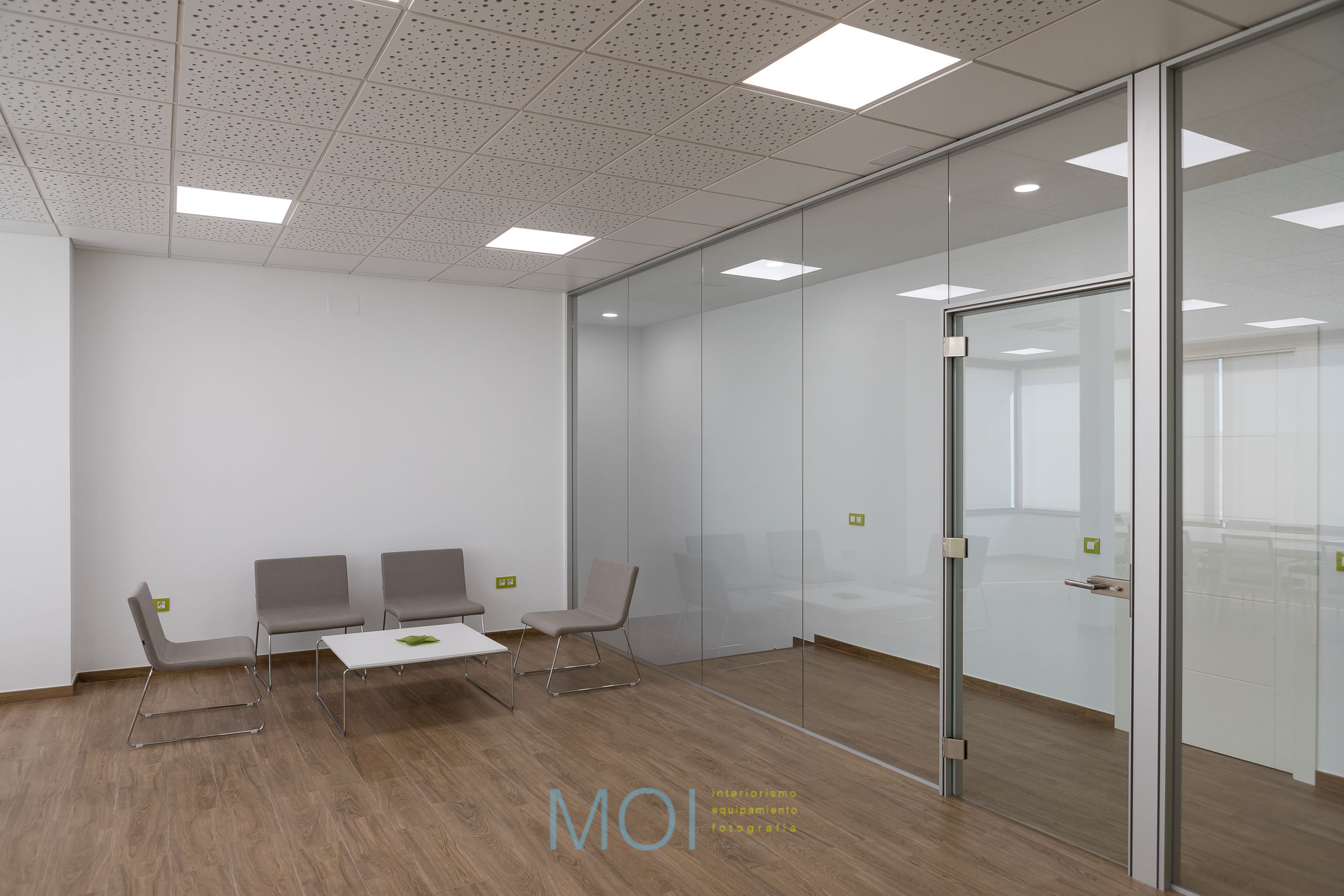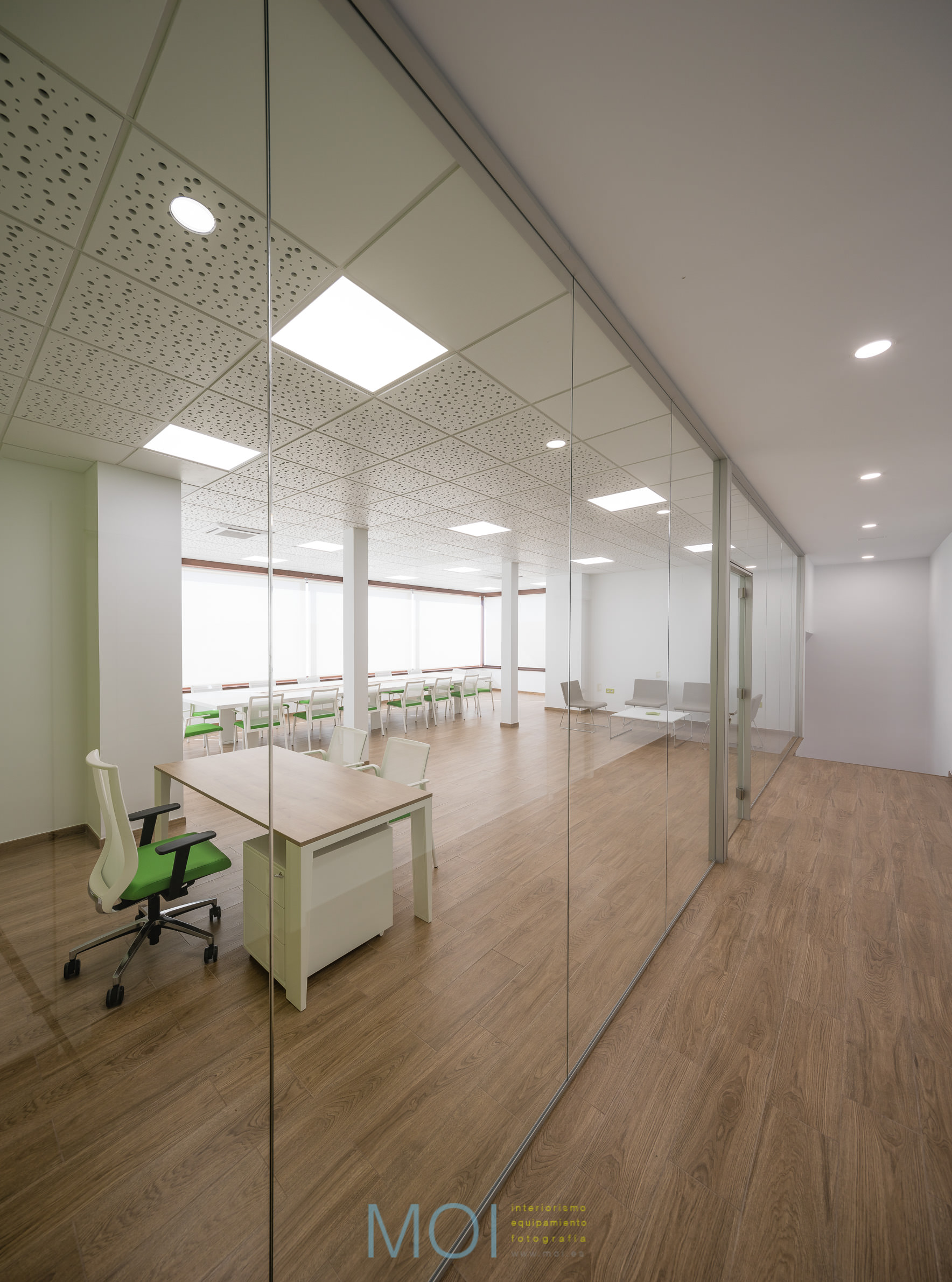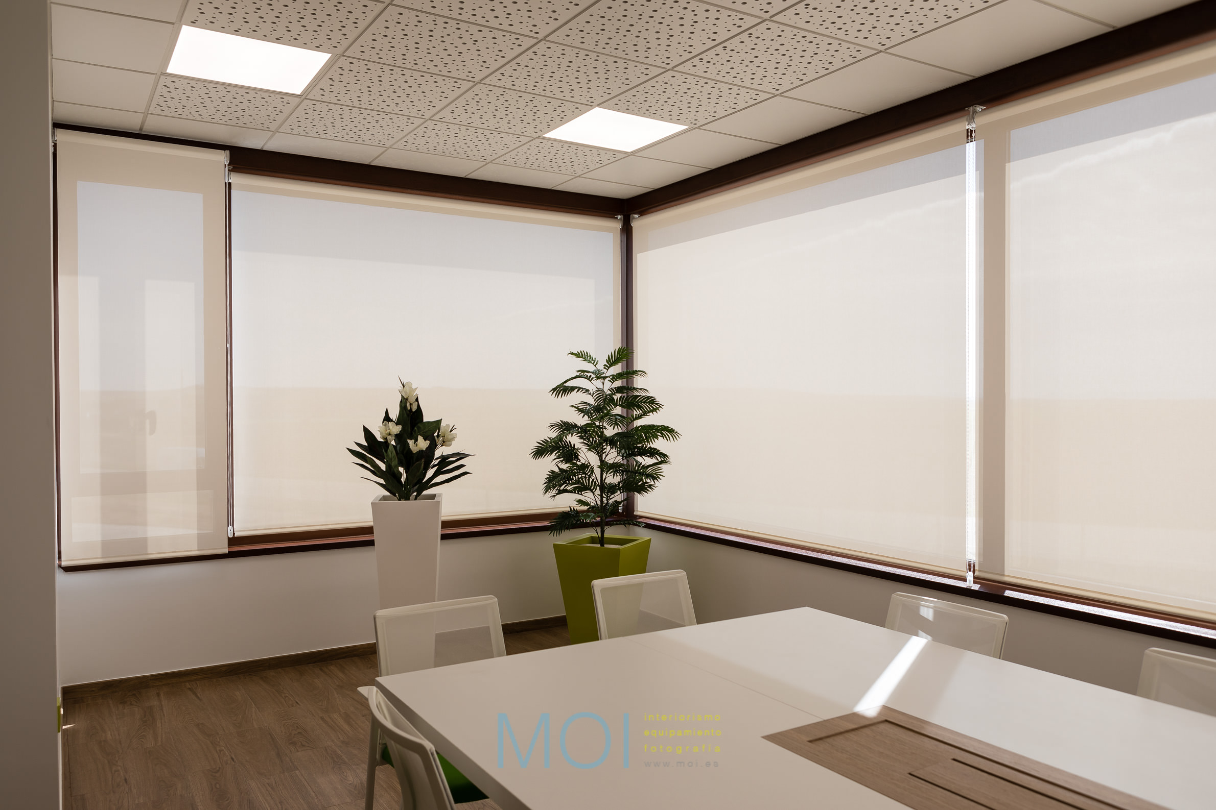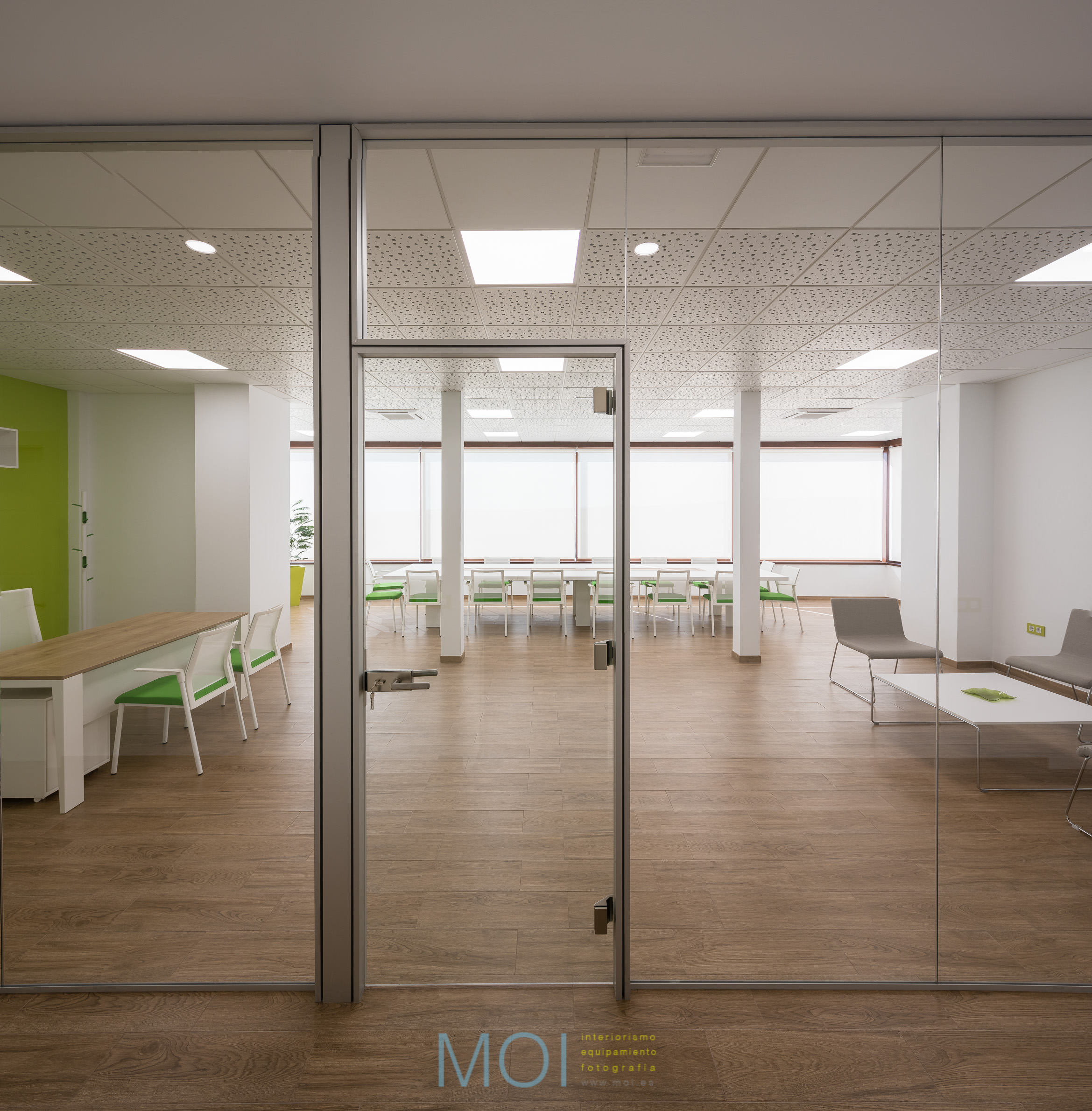 El uso de la mampara de vidrio, el techo acústico, las cortinas enrollables y la elección del propio mobiliario da una imagen moderna y ayuda a ampliar visualmente el espacio.