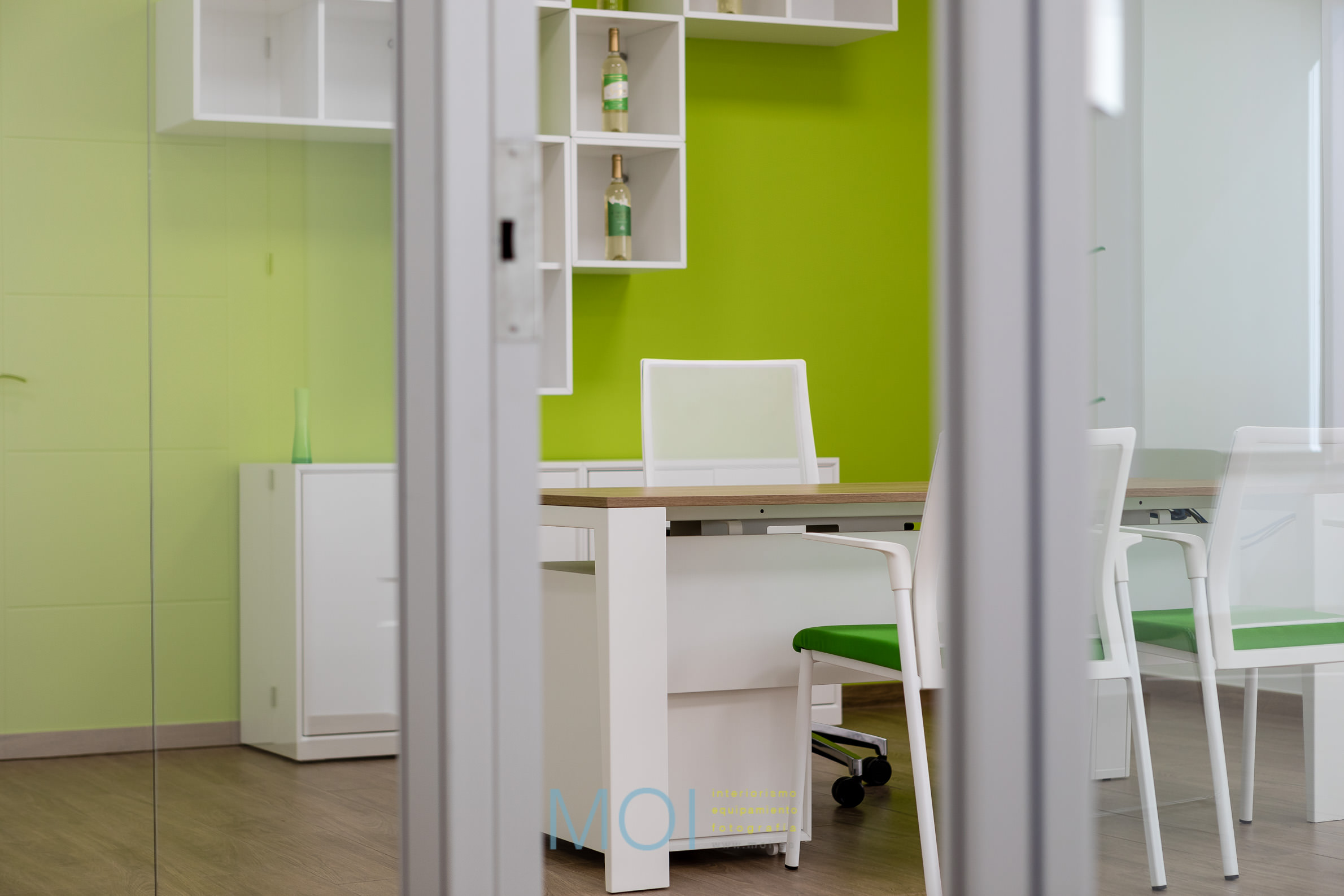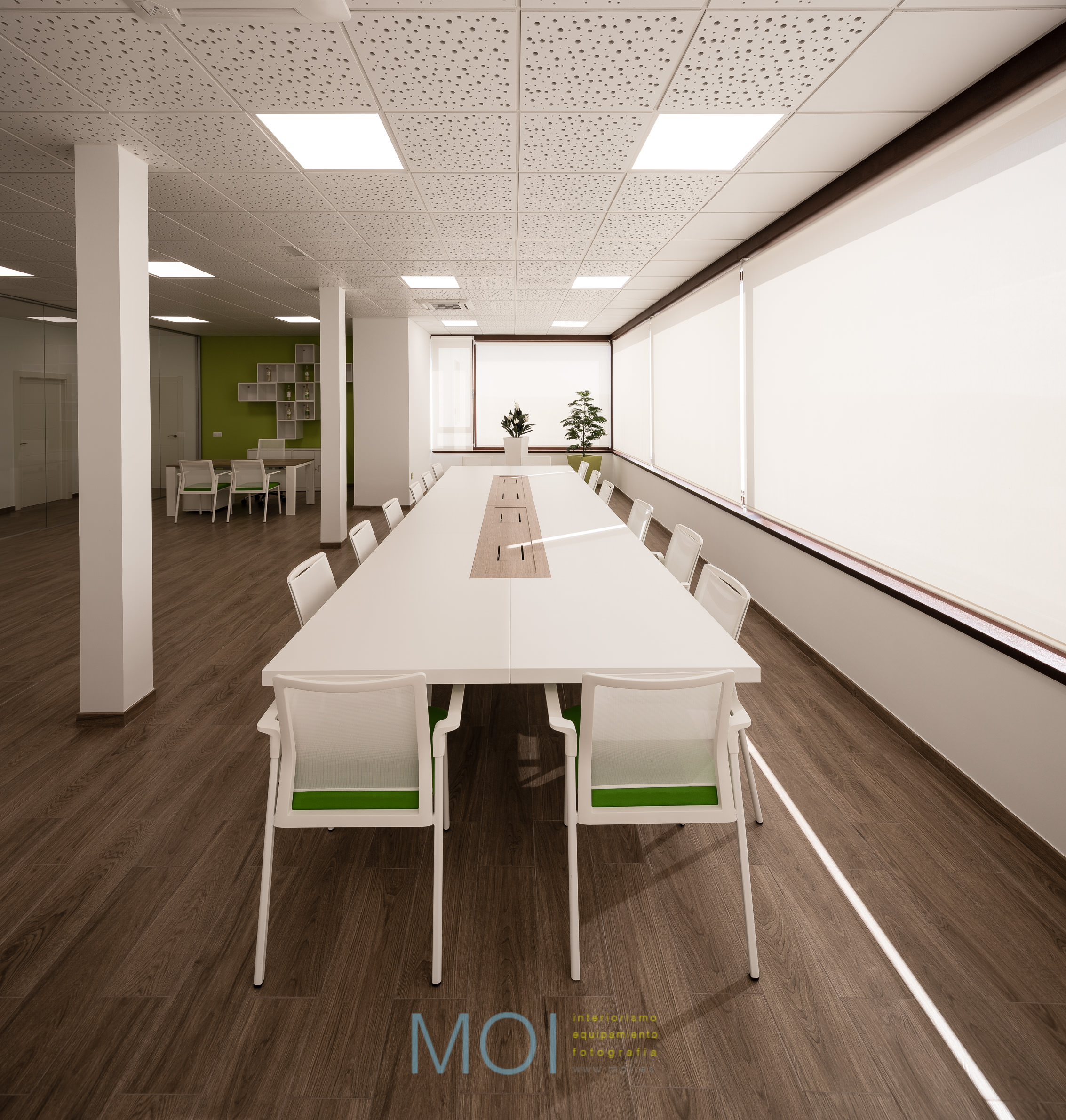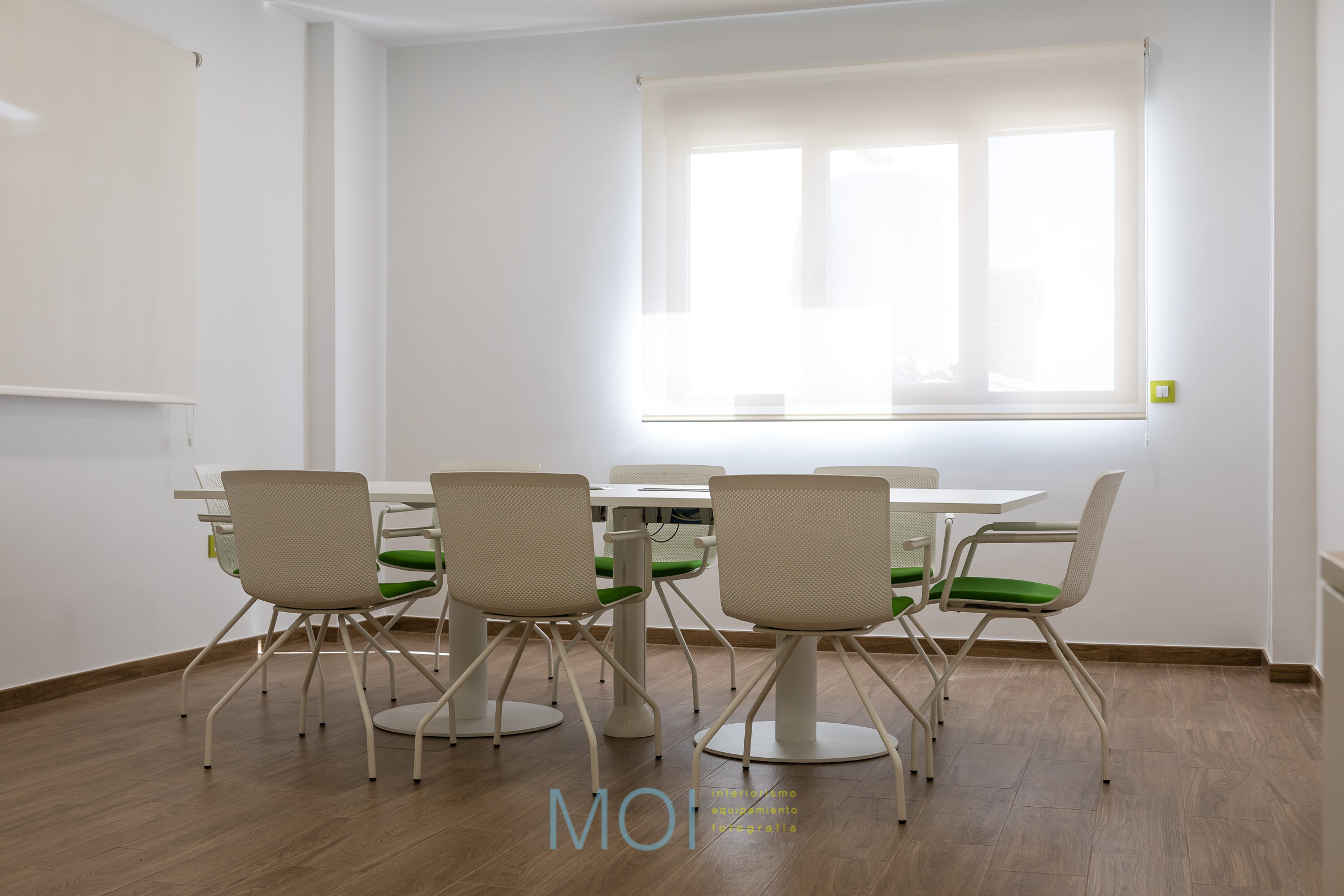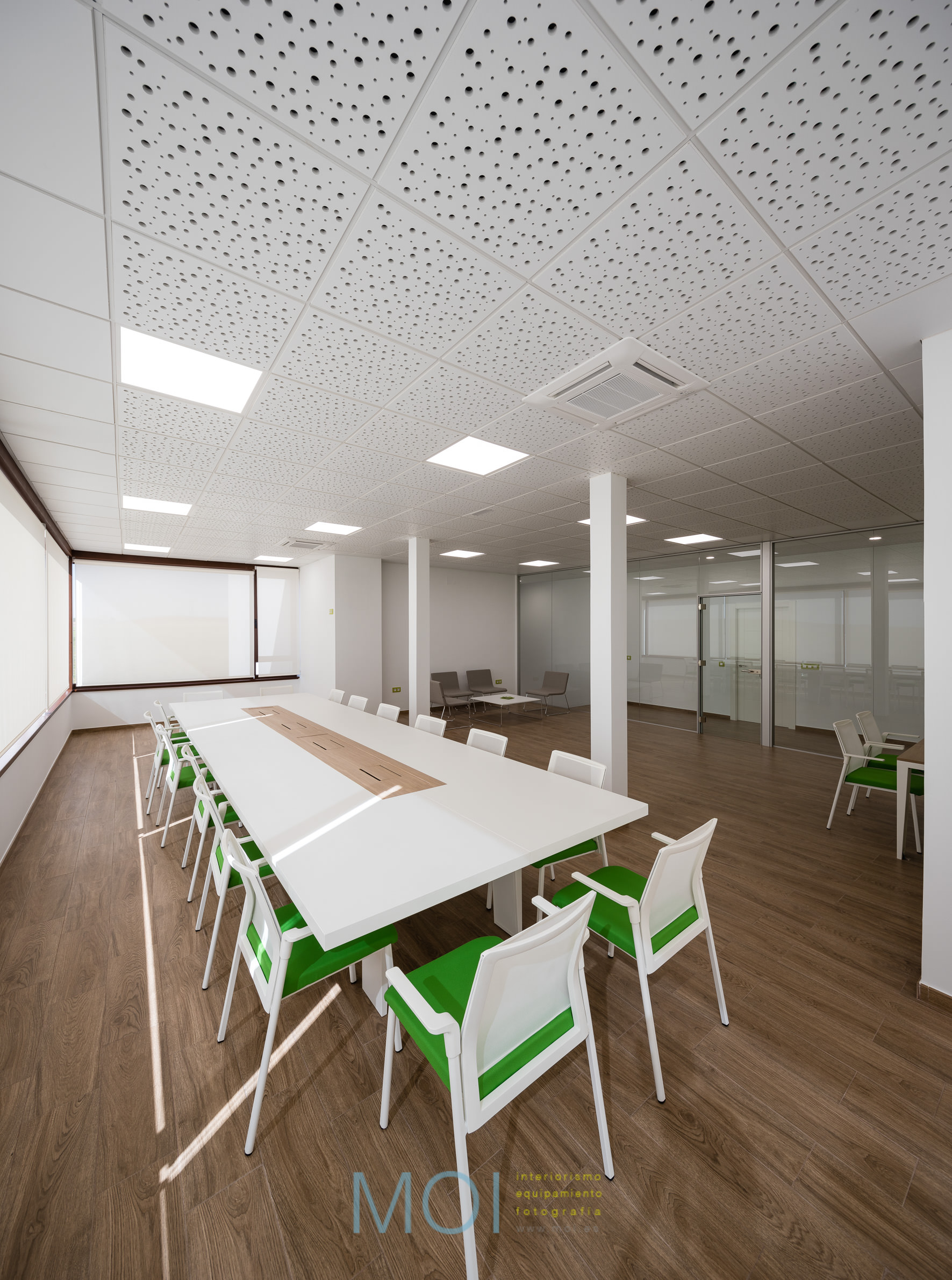 El uso de la mampara de vidrio, el techo acústico, las cortinas enrollables y la elección del propio mobiliario da una imagen moderna y ayuda a ampliar visualmente el espacio.