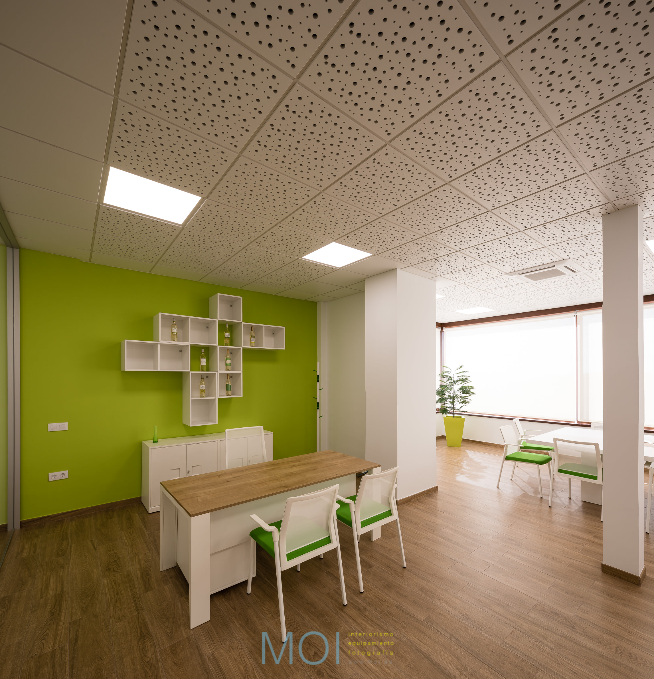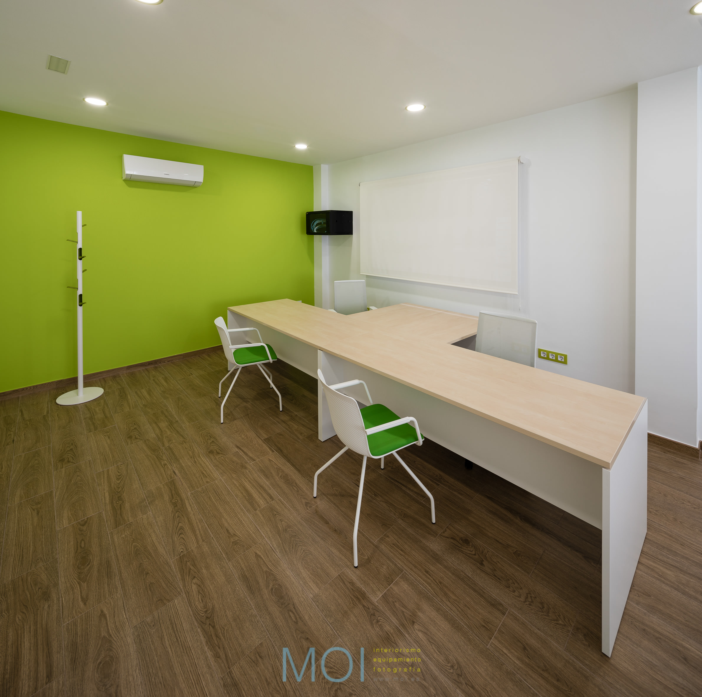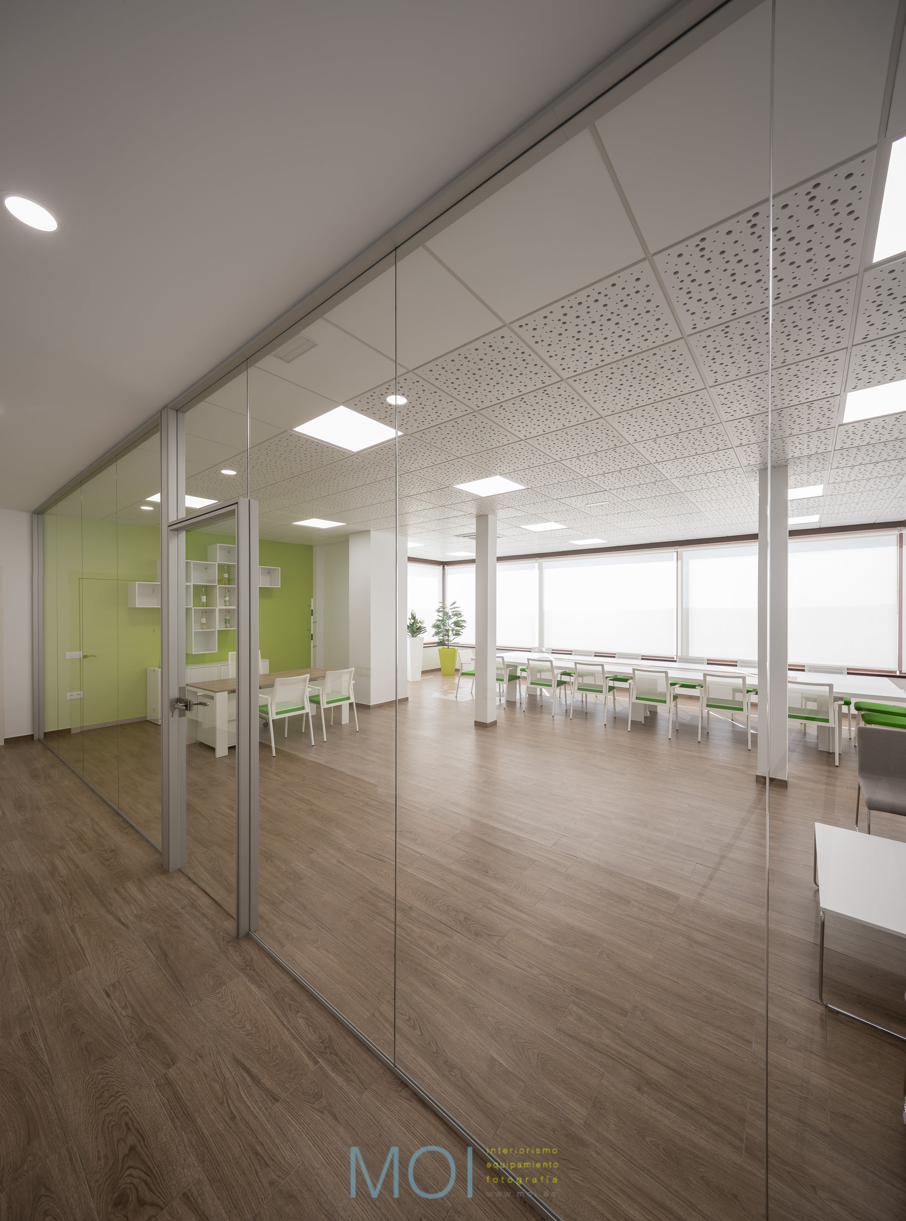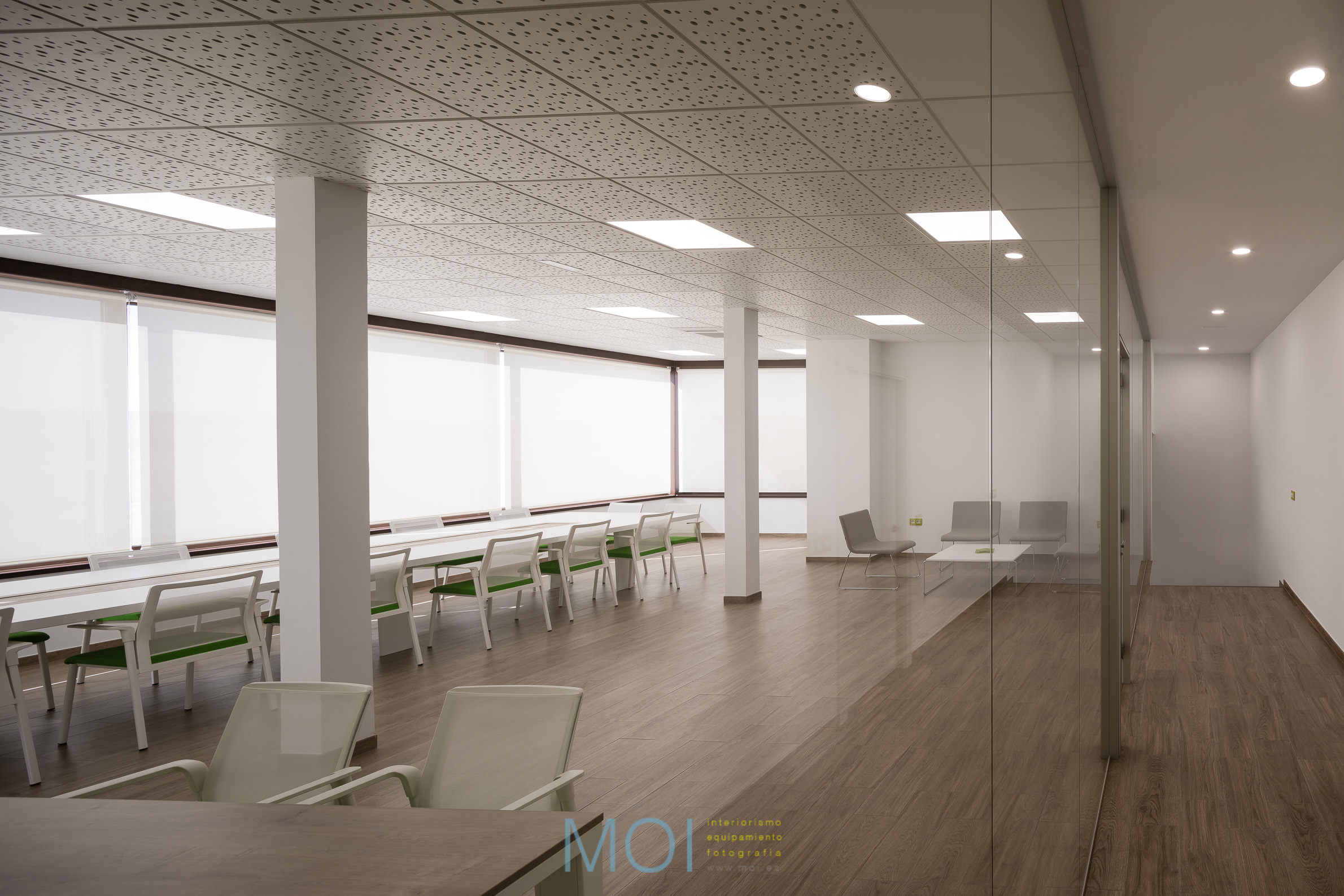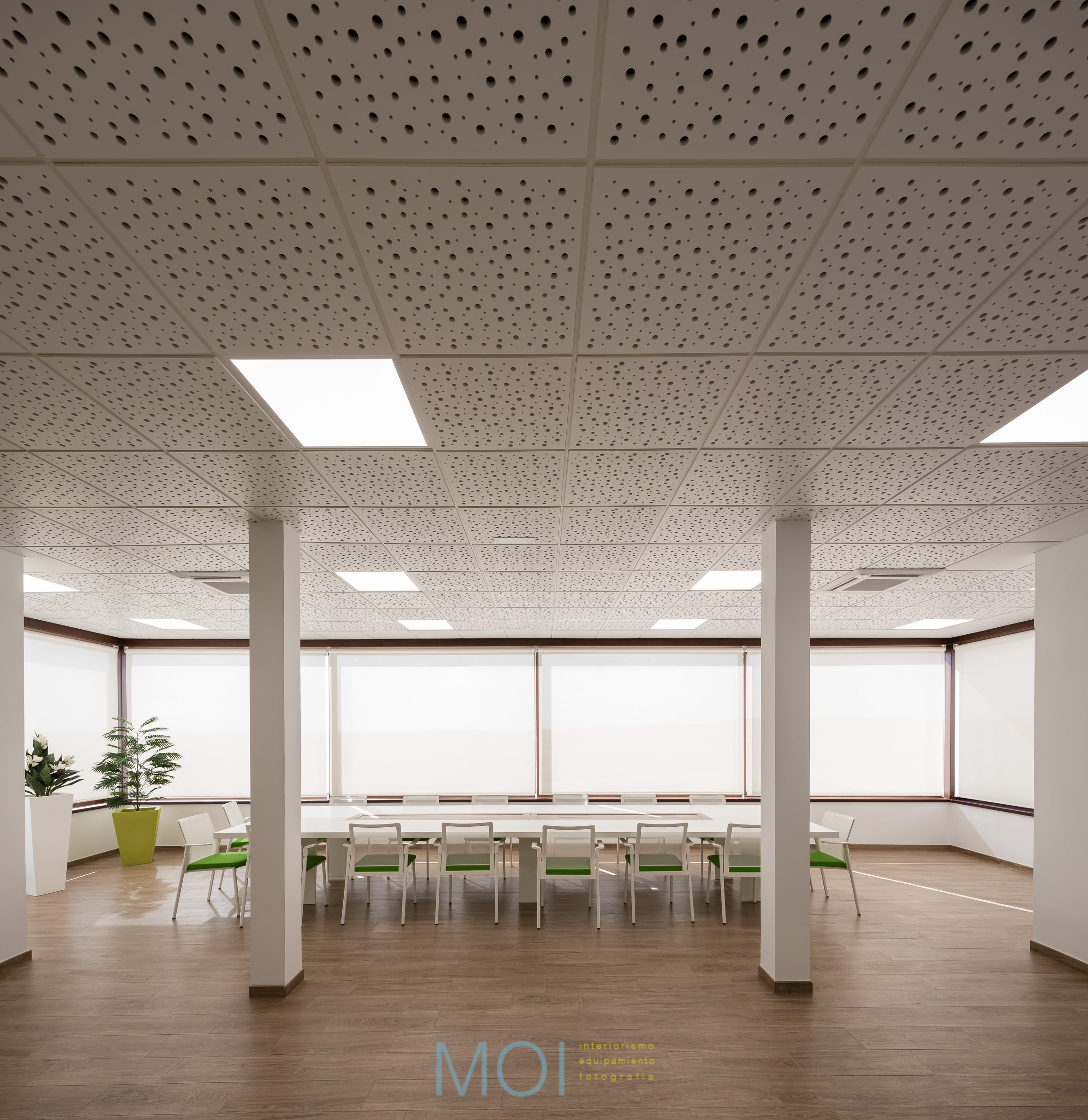 El uso de la mampara de vidrio, el techo acústico, las cortinas enrollables y la elección del propio mobiliario da una imagen moderna y ayuda a ampliar visualmente el espacio.