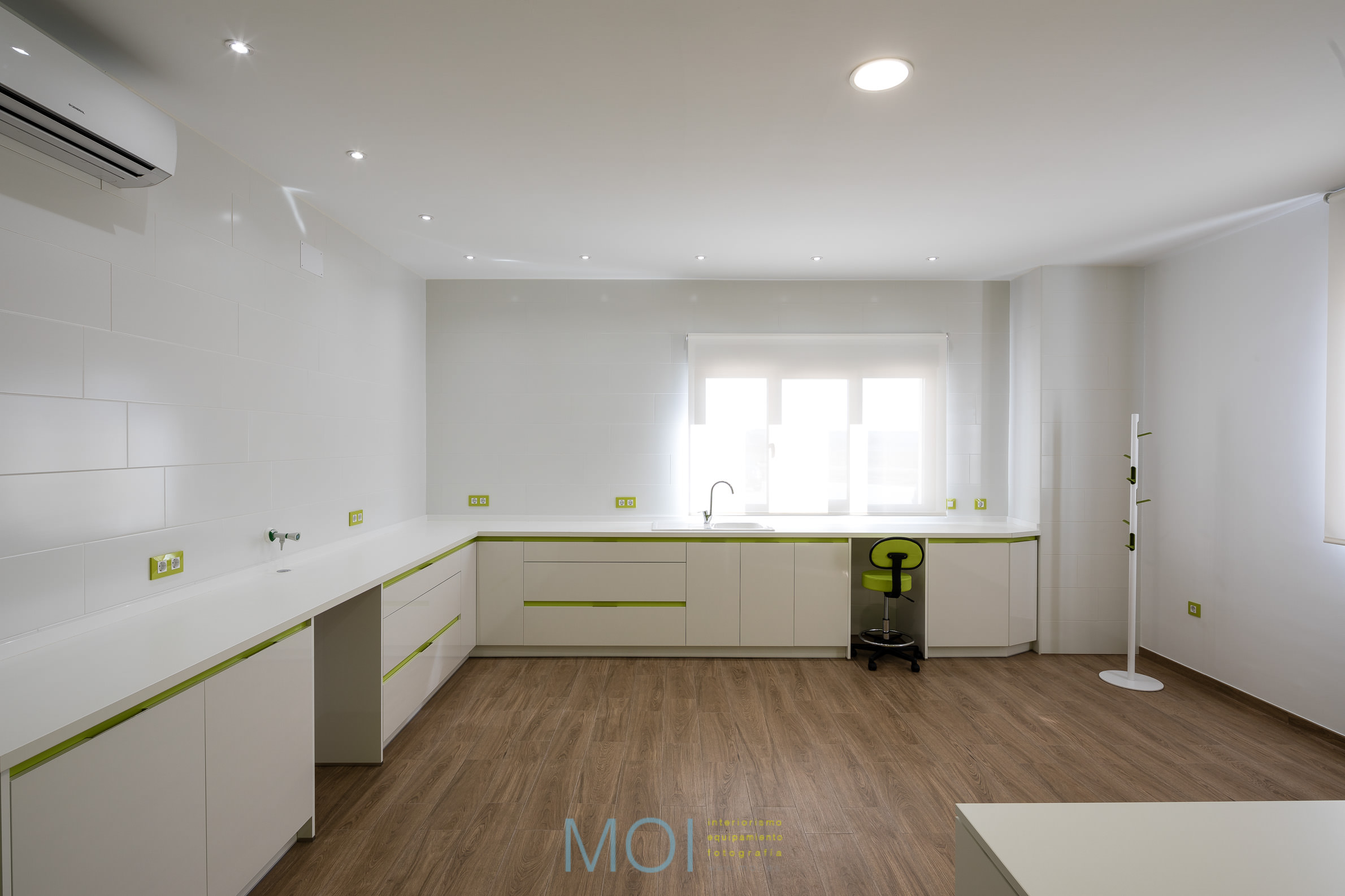 La gama cromática se reduce al blanco en combinación con elementos de madera y tonos verdes.
