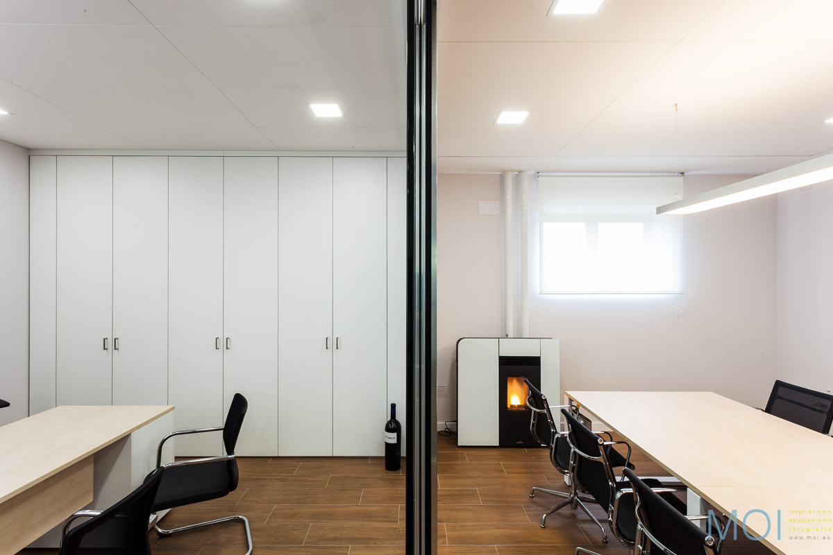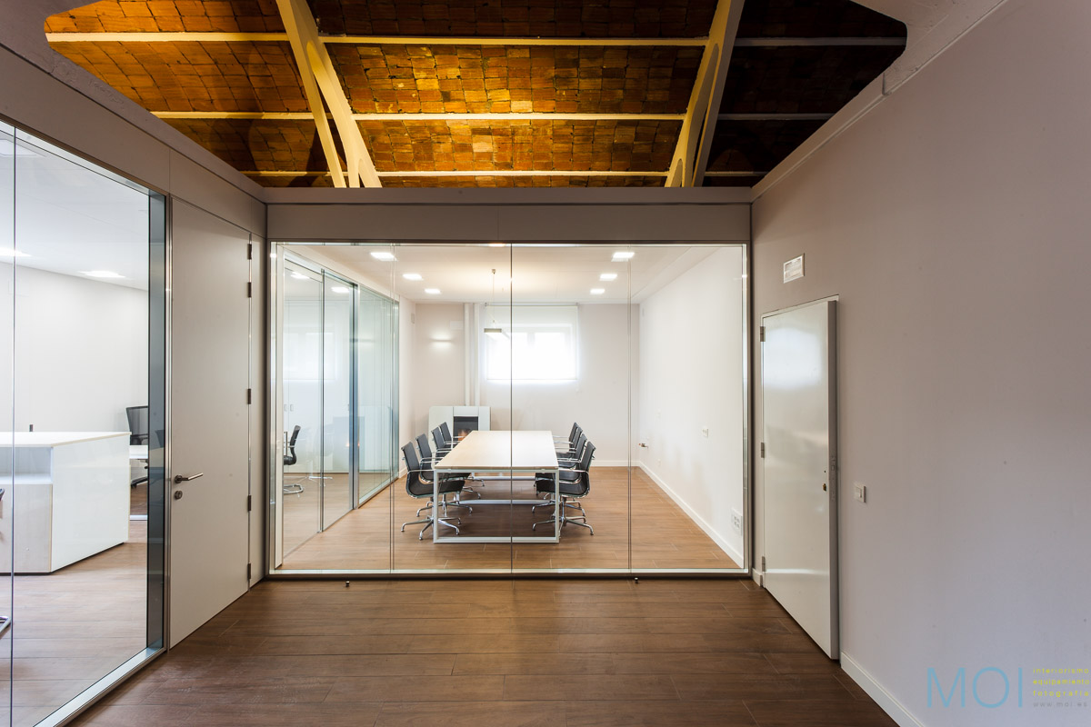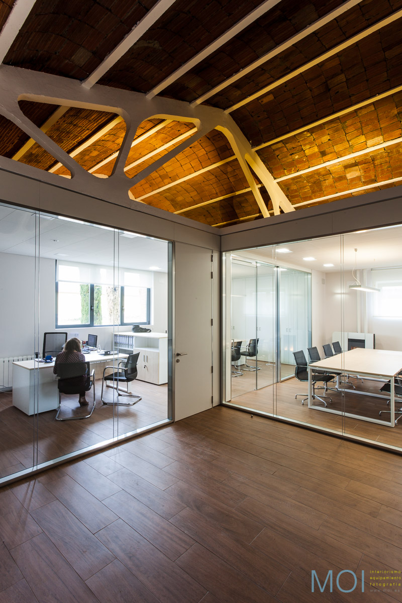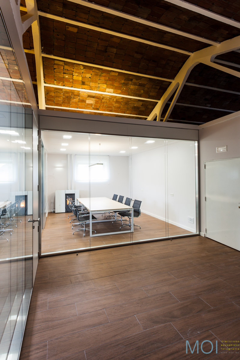 El proyecto consistió en crear un ámbito de trabajo acondicionado térmica y acústicamente en una antigua nave de la bodega. Mediante la iluminación se potenció la estructura preexistente que contrastaba con las líneas puras y sencillas del mobiliario elegido.