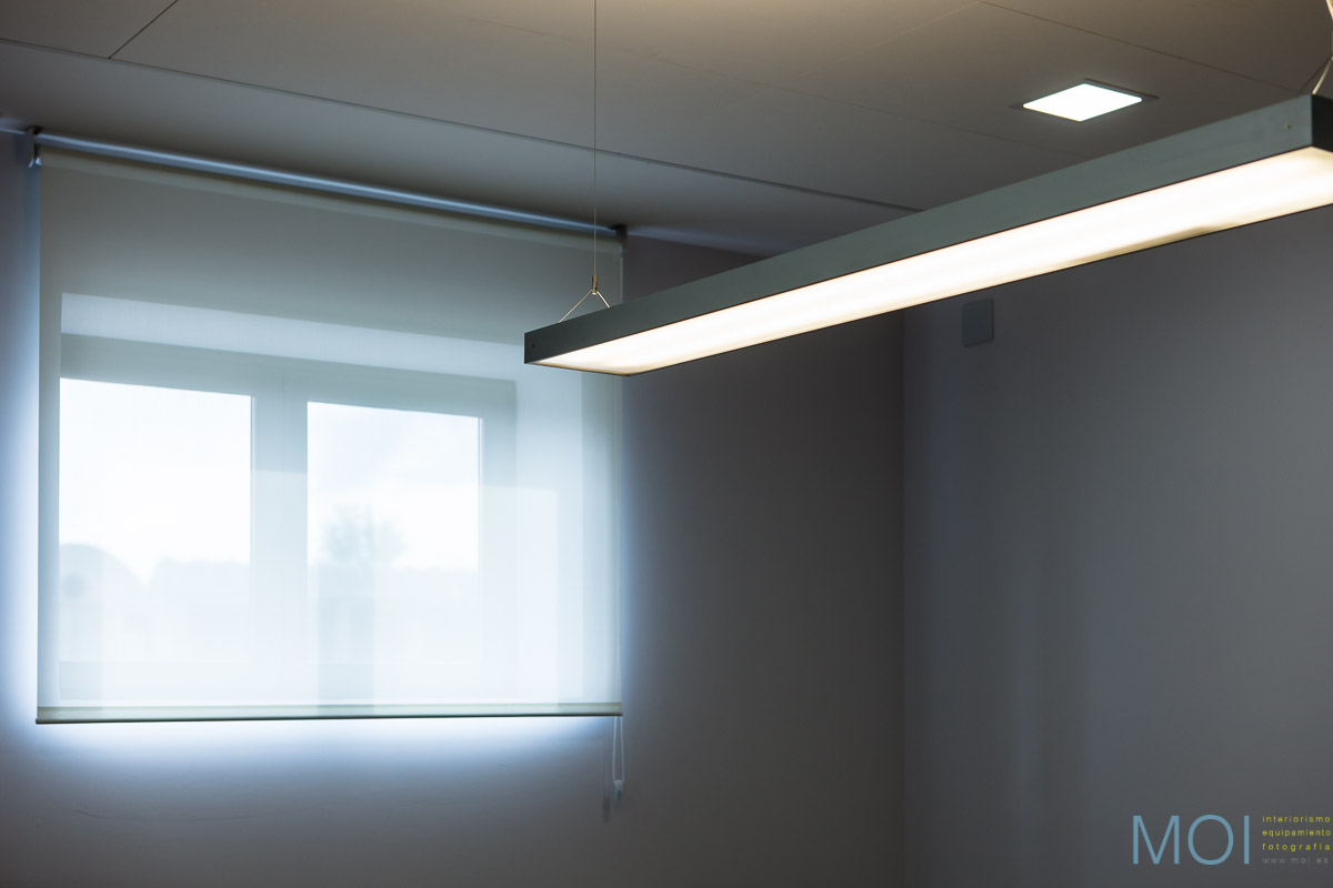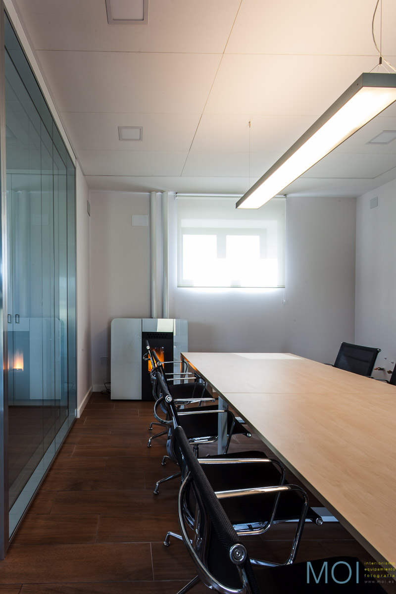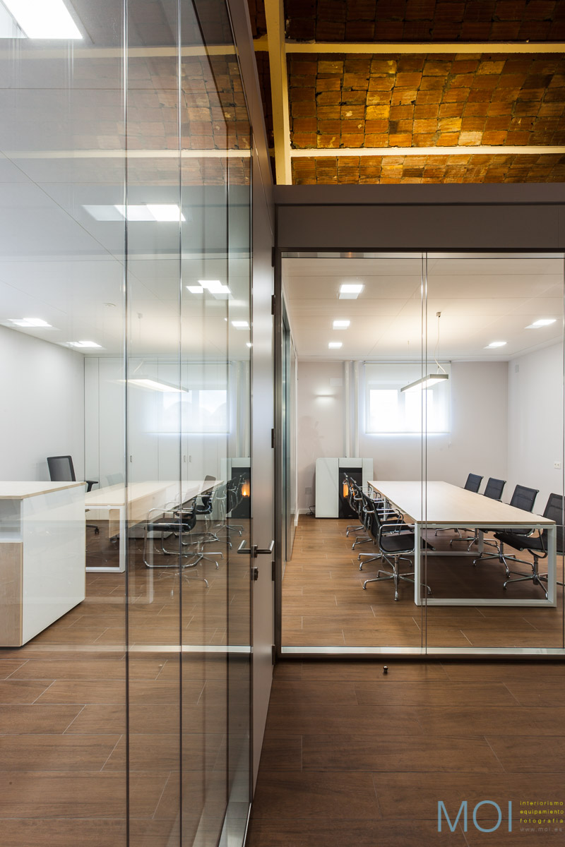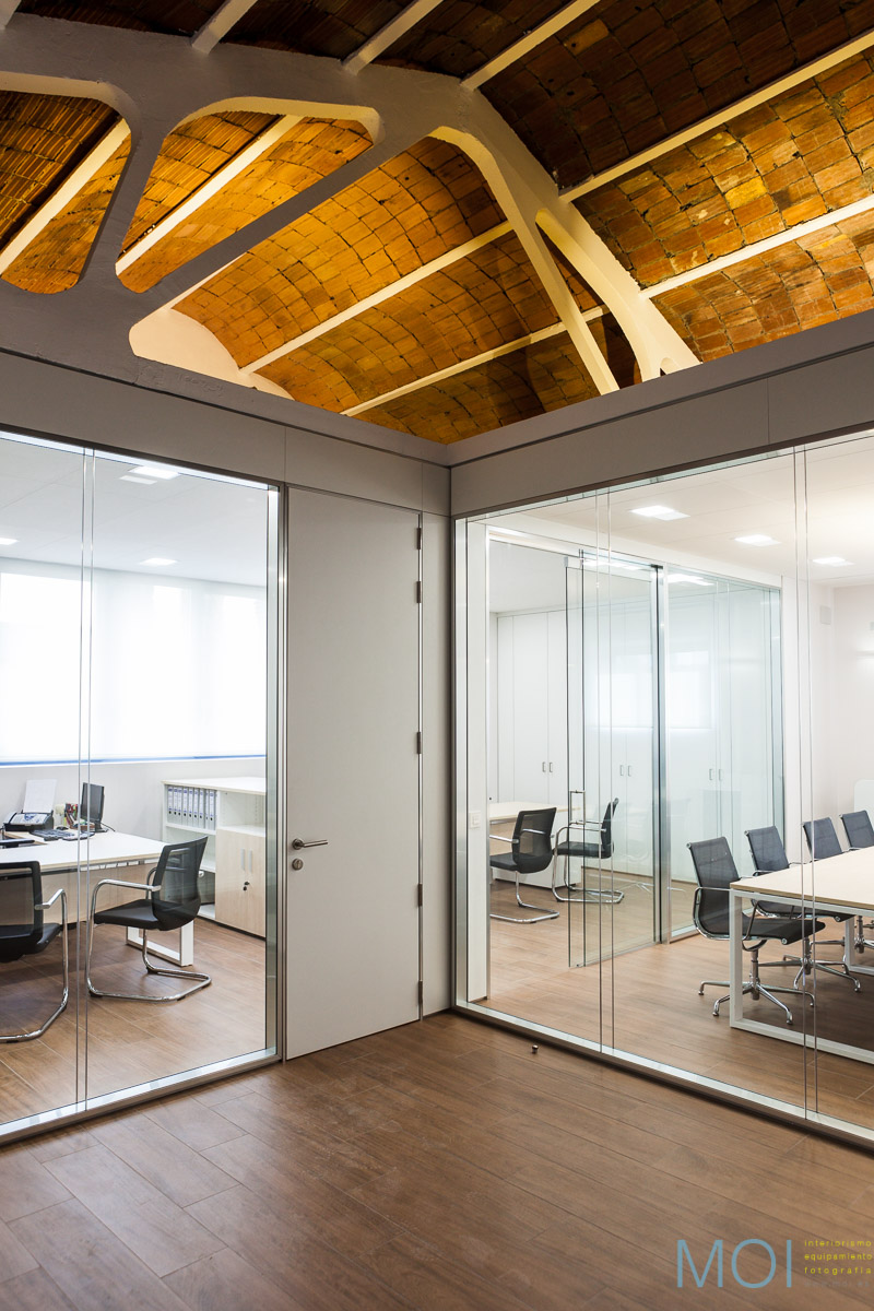El proyecto consistió en crear un ámbito de trabajo acondicionado térmica y acústicamente en una antigua nave de la bodega. Mediante la iluminación se potenció la estructura preexistente que contrastaba con las líneas puras y sencillas del mobiliario elegido.