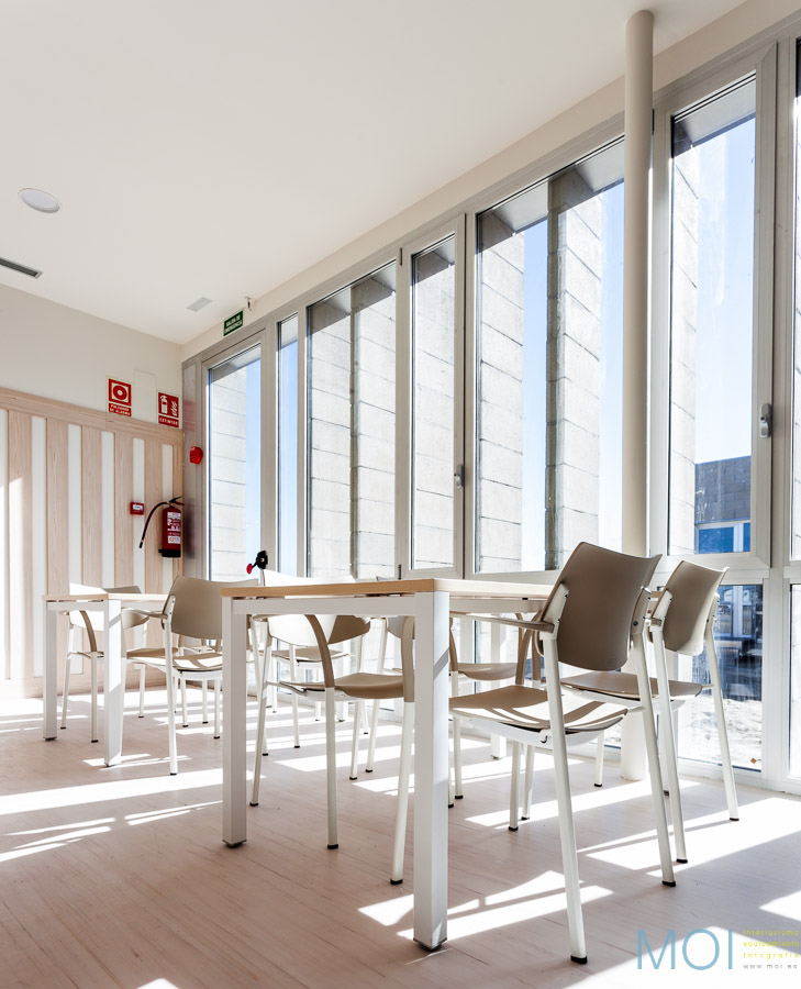 Se trata de un singular edificio alejado del estereotipo habitual de esta tipología. Se busca generar un ambiente agradable, cálido y acogedor donde la imagen de centro hospitalario se sustituye por una novedosa solución de espacios de uso común y de relación en la que los bloques de las habitaciones configuran lugares como si de las casas de un pequeño pueblo se tratase.