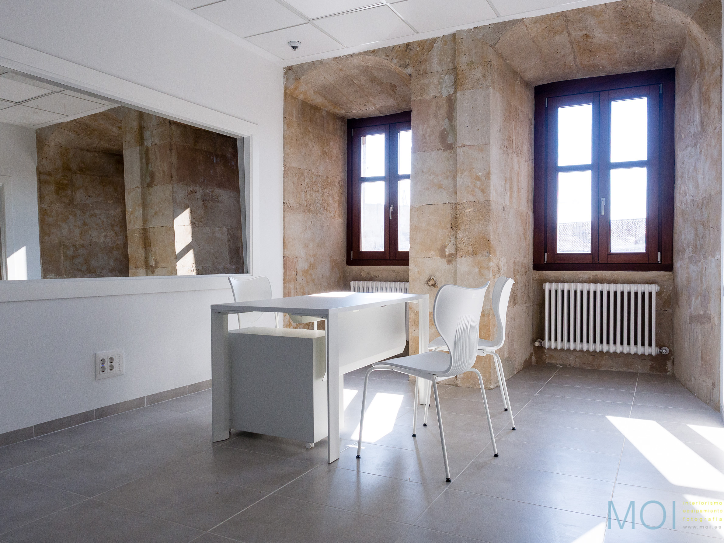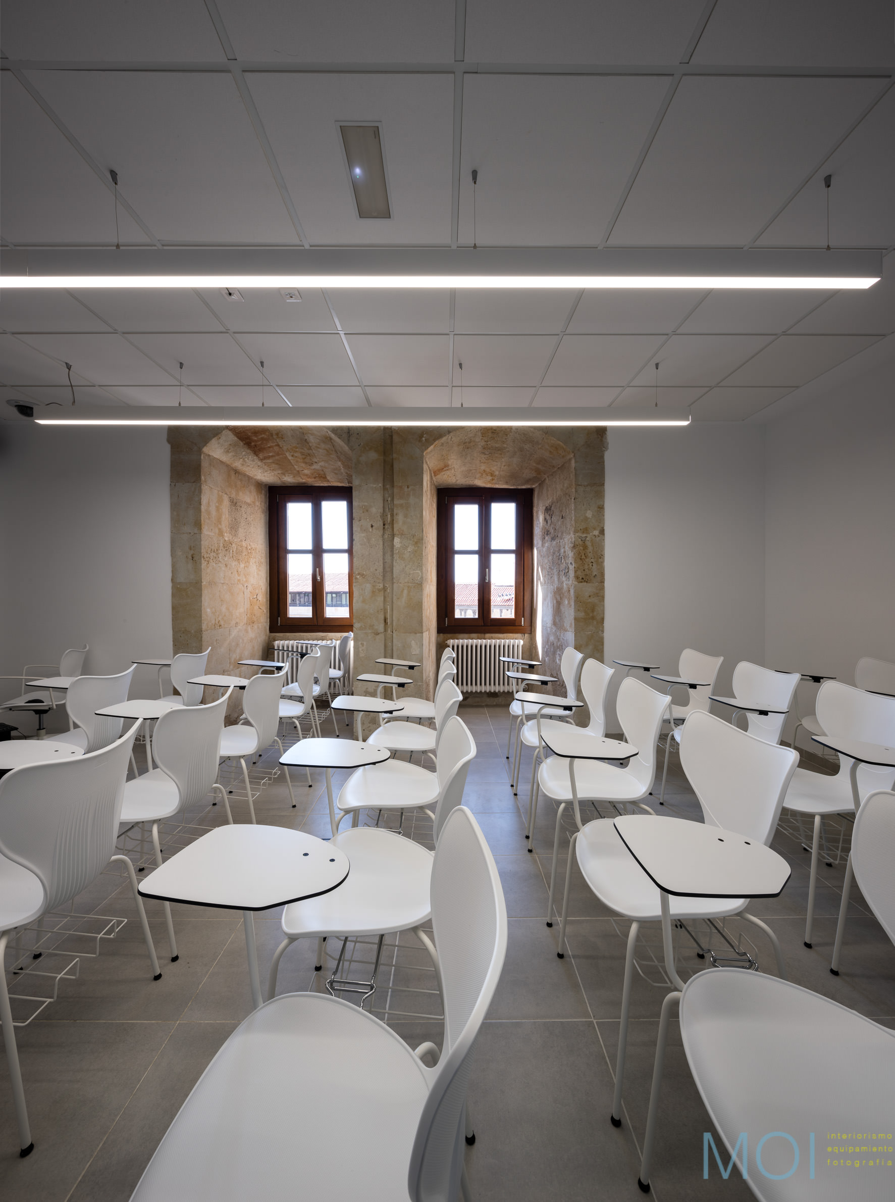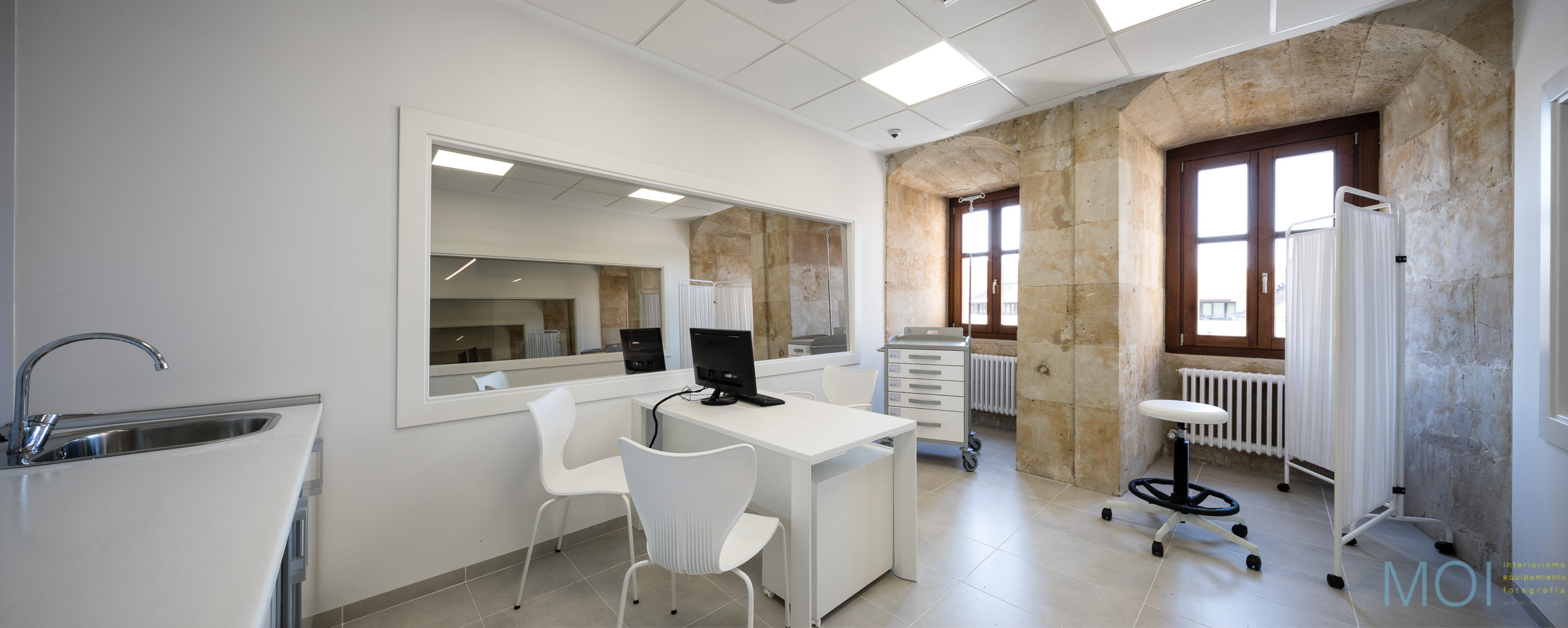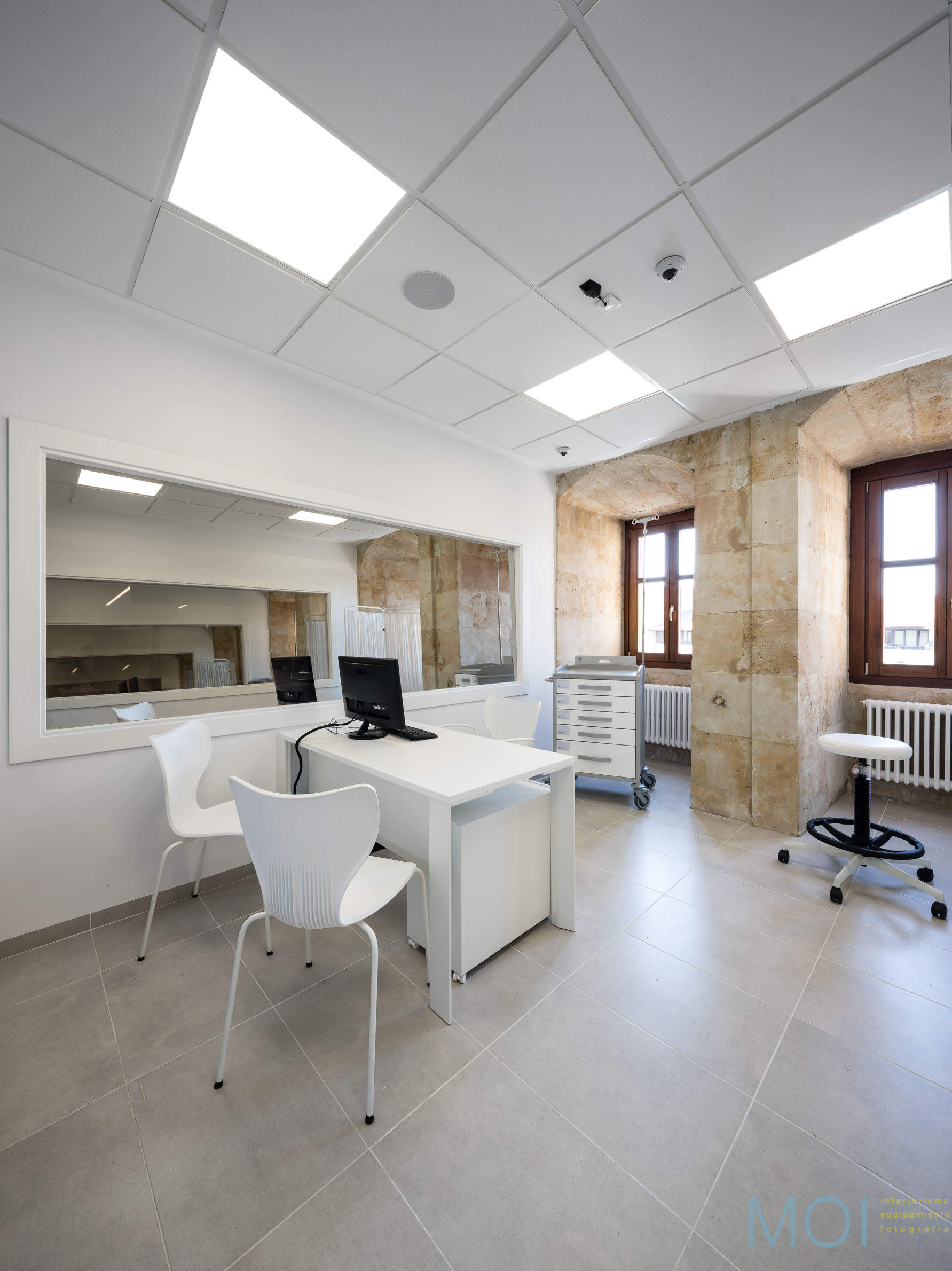 MOI ha equipado el Centro de Simulación Médica de la Universidad Pontificia de Salamanca. Se trata de una intervención del arquitecto Pablo Guillén Llanos en el histórico edificio de la UPSA. Un gran aprovechamiento espacial permite condensar todo el programa: recepción, despacho, aula debriefing, consulta, simulación de quirófano, sala de control, aseos y vestuarios. El mobiliario elegido destaca por su calidad y por una ligereza que permite que el espacio respire a pesar del intenso aprovechamiento.