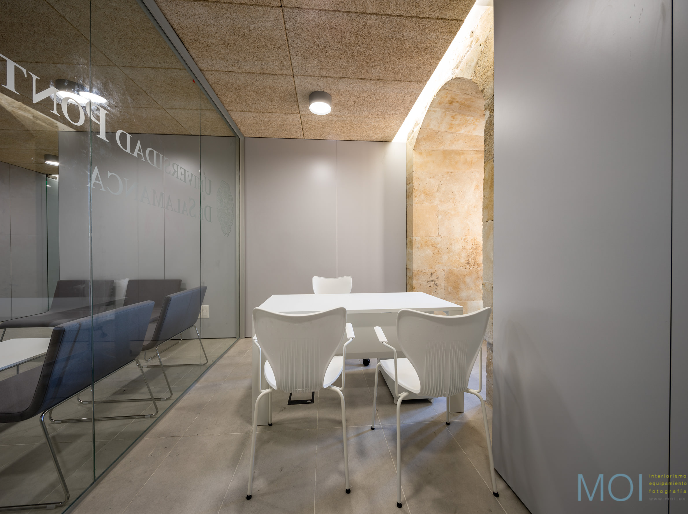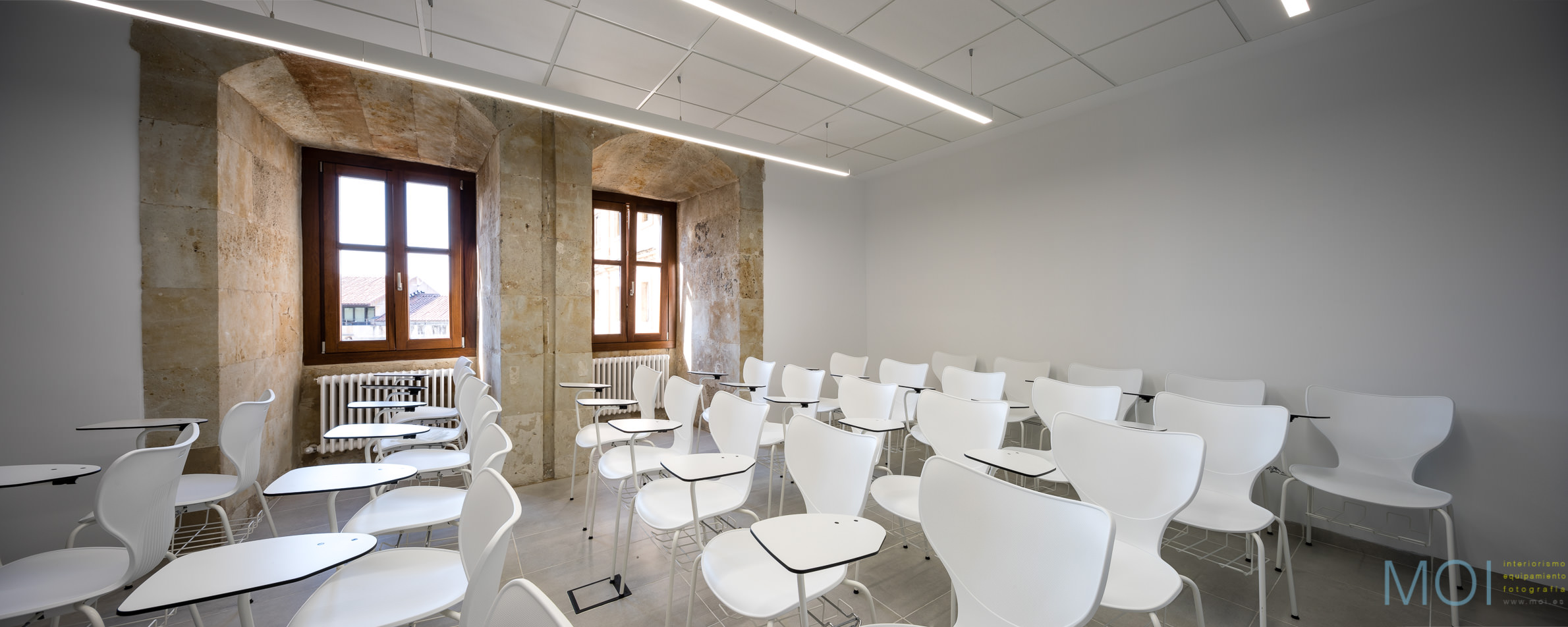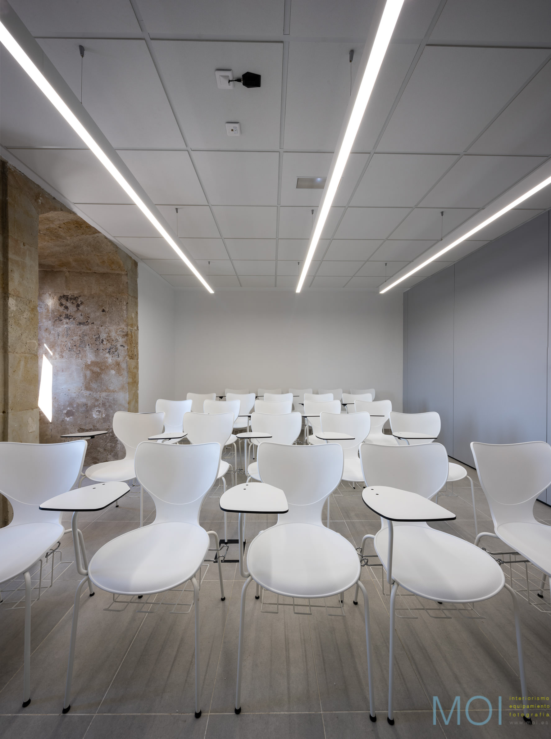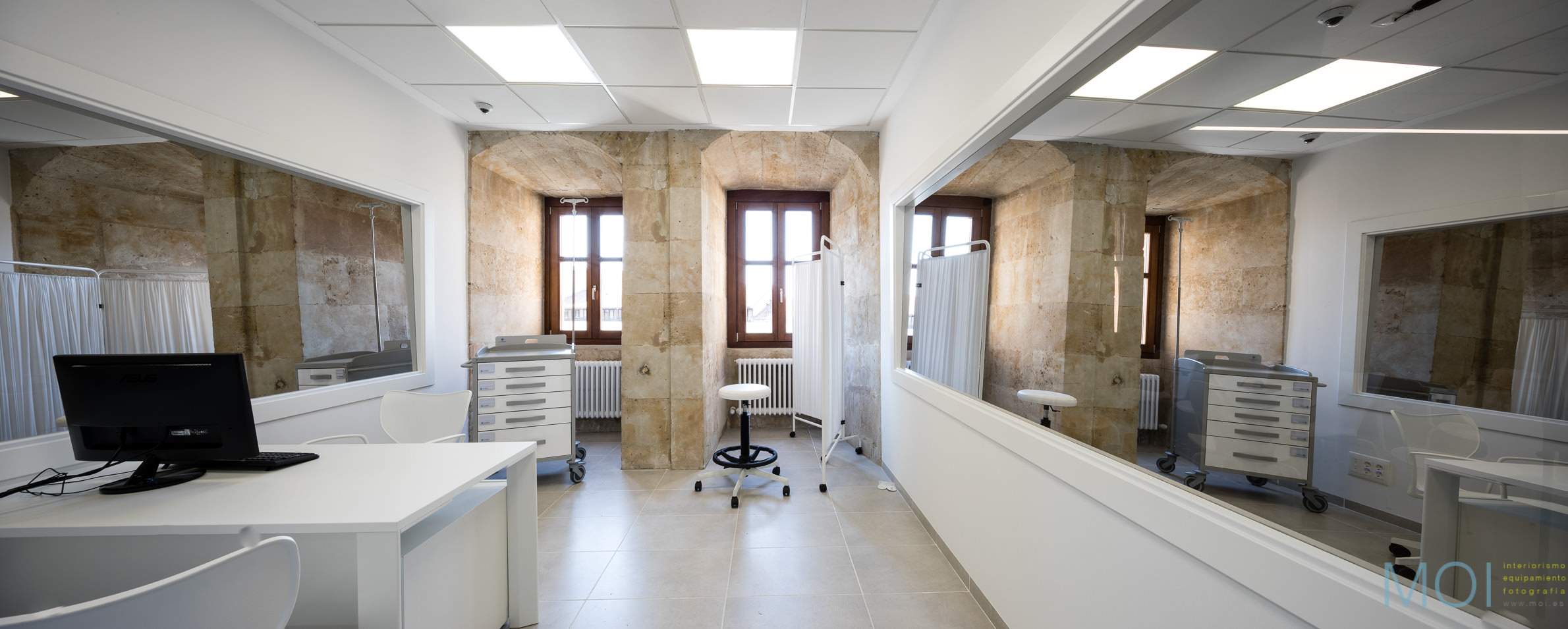 MOI ha equipado el Centro de Simulación Médica de la Universidad Pontificia de Salamanca. Se trata de una intervención del arquitecto Pablo Guillén Llanos en el histórico edificio de la UPSA. Un gran aprovechamiento espacial permite condensar todo el programa: recepción, despacho, aula debriefing, consulta, simulación de quirófano, sala de control, aseos y vestuarios. El mobiliario elegido destaca por su calidad y por una ligereza que permite que el espacio respire a pesar del intenso aprovechamiento.