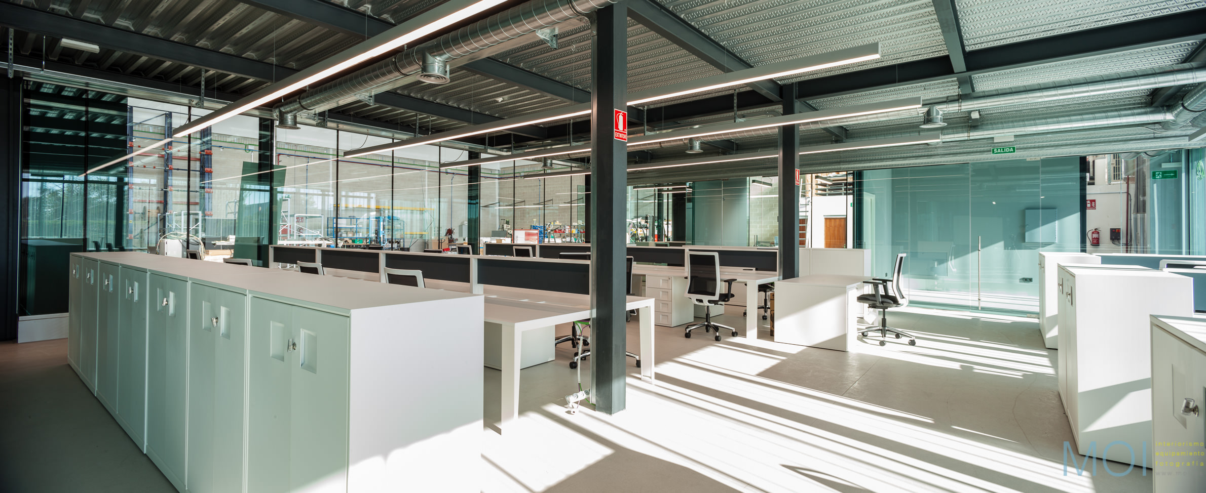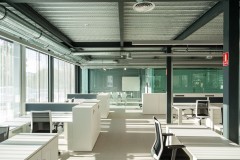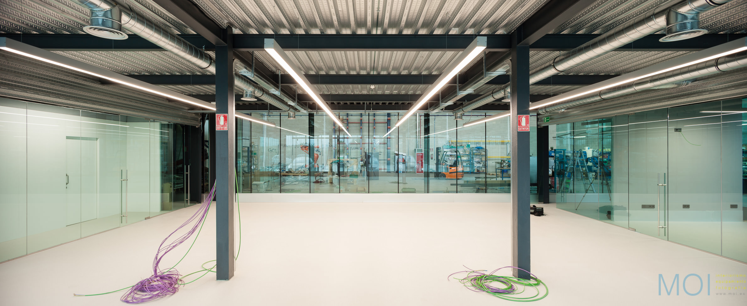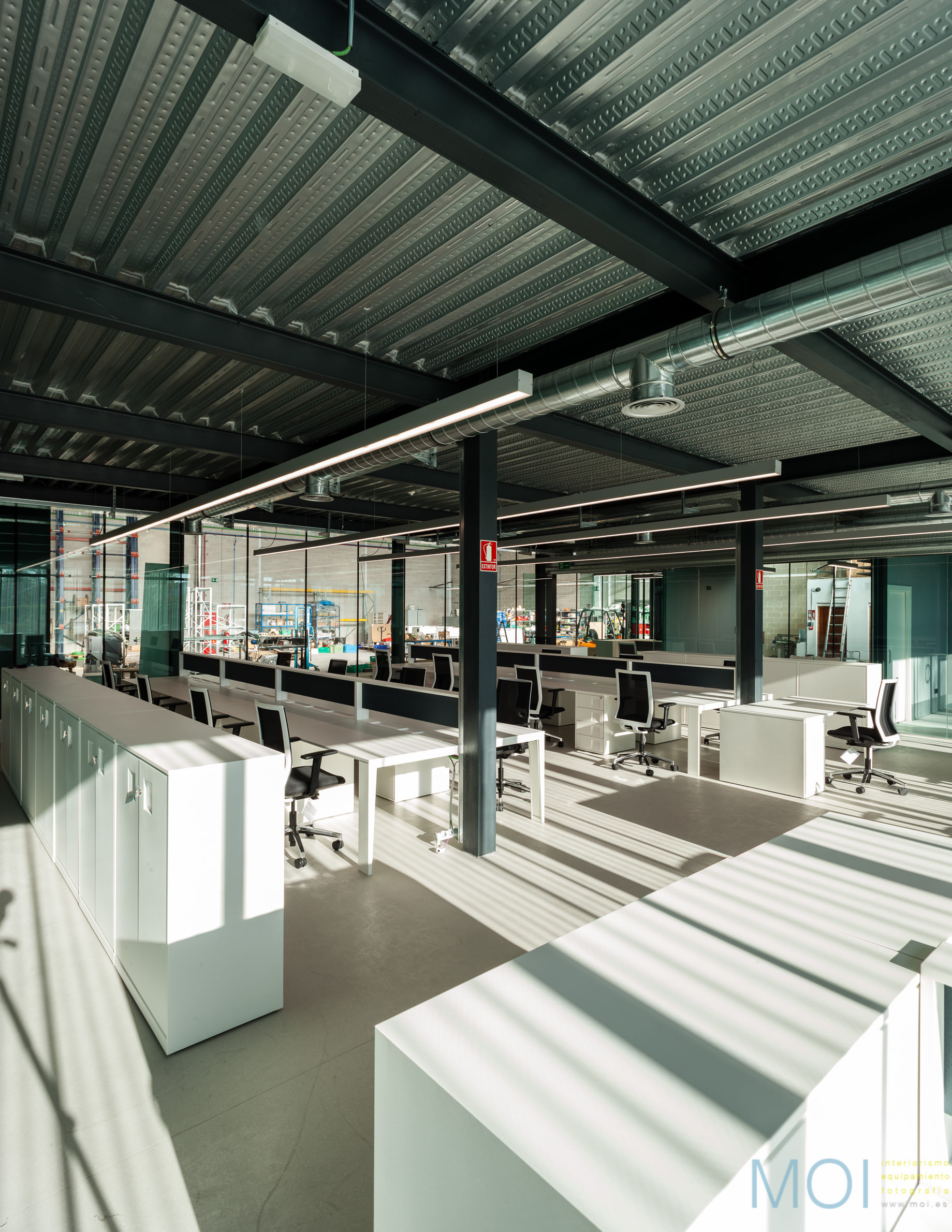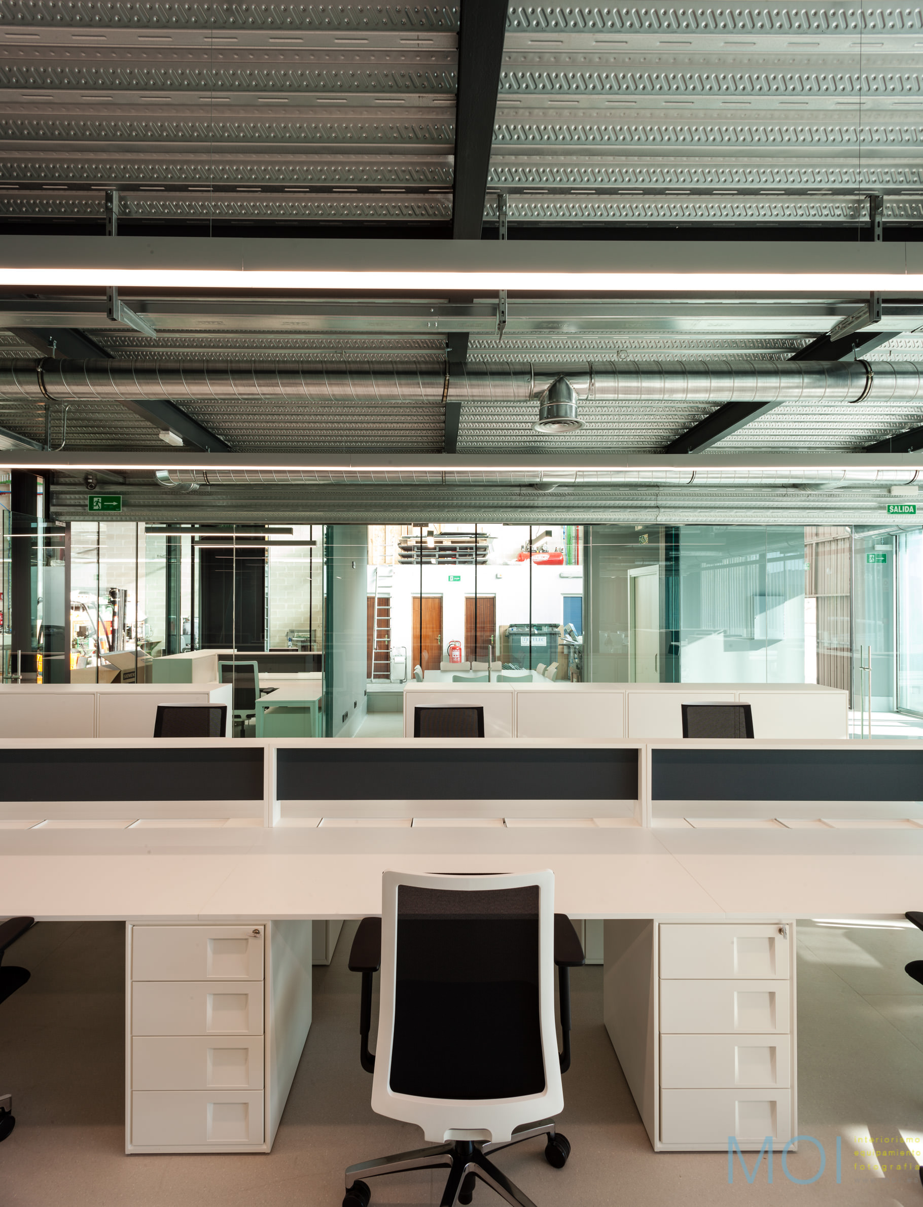 El carácter industrial y de contenedor se refuerza mediante el uso de instalaciones vistas, o dejando el forjado de chapa colaborante también visto.