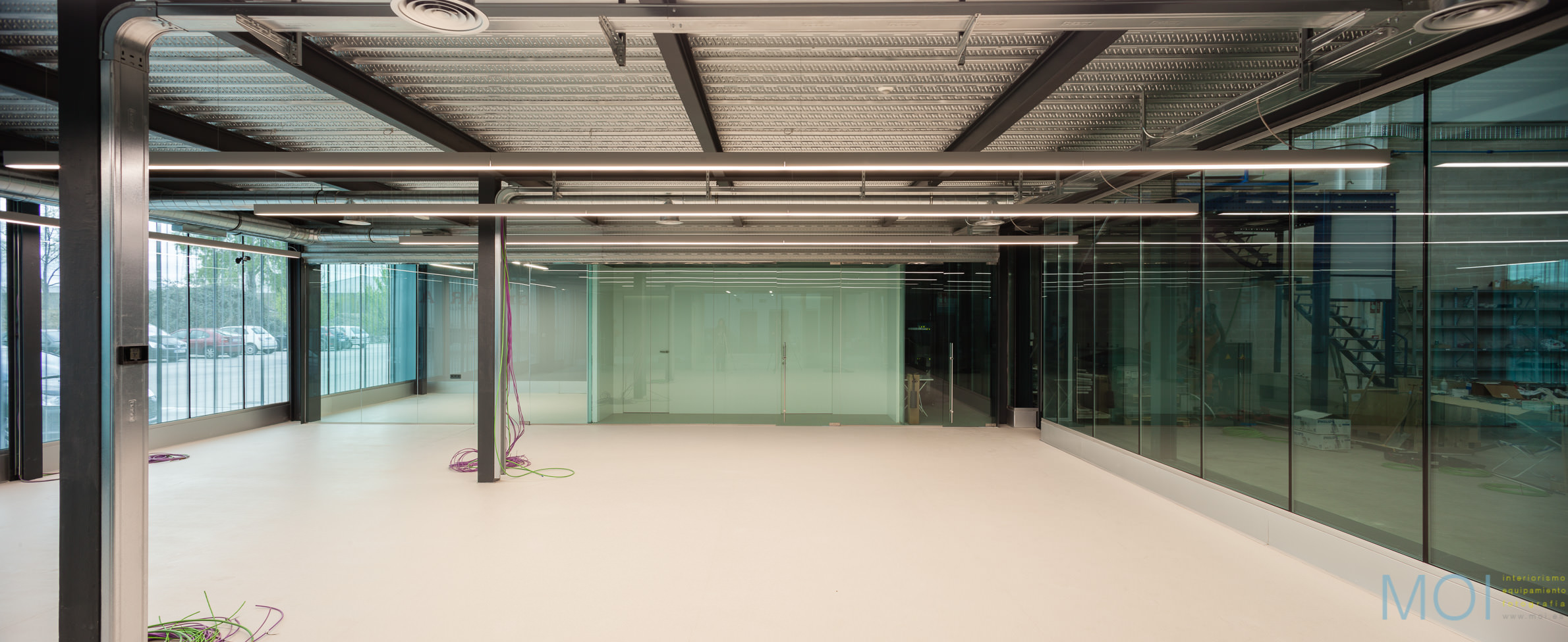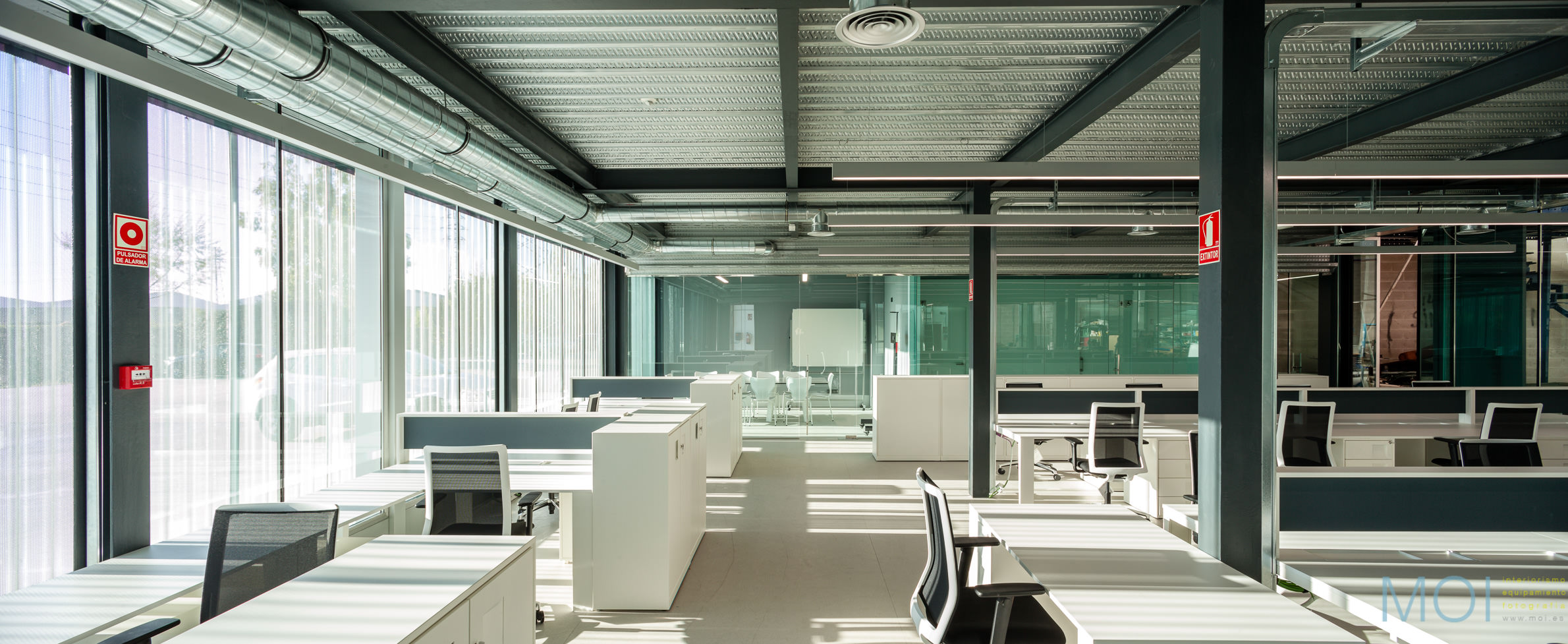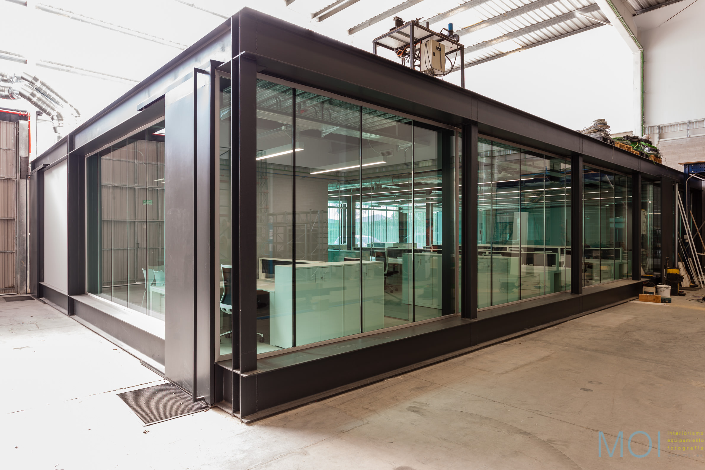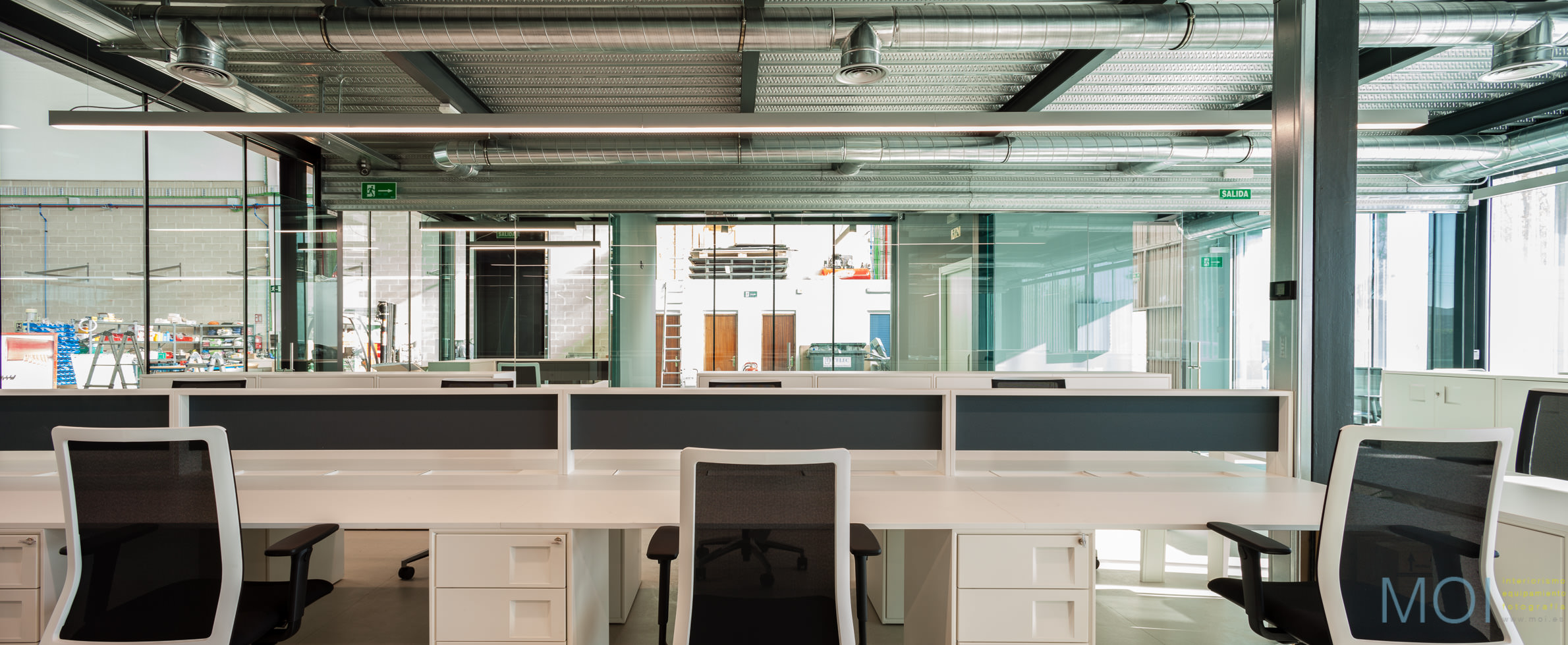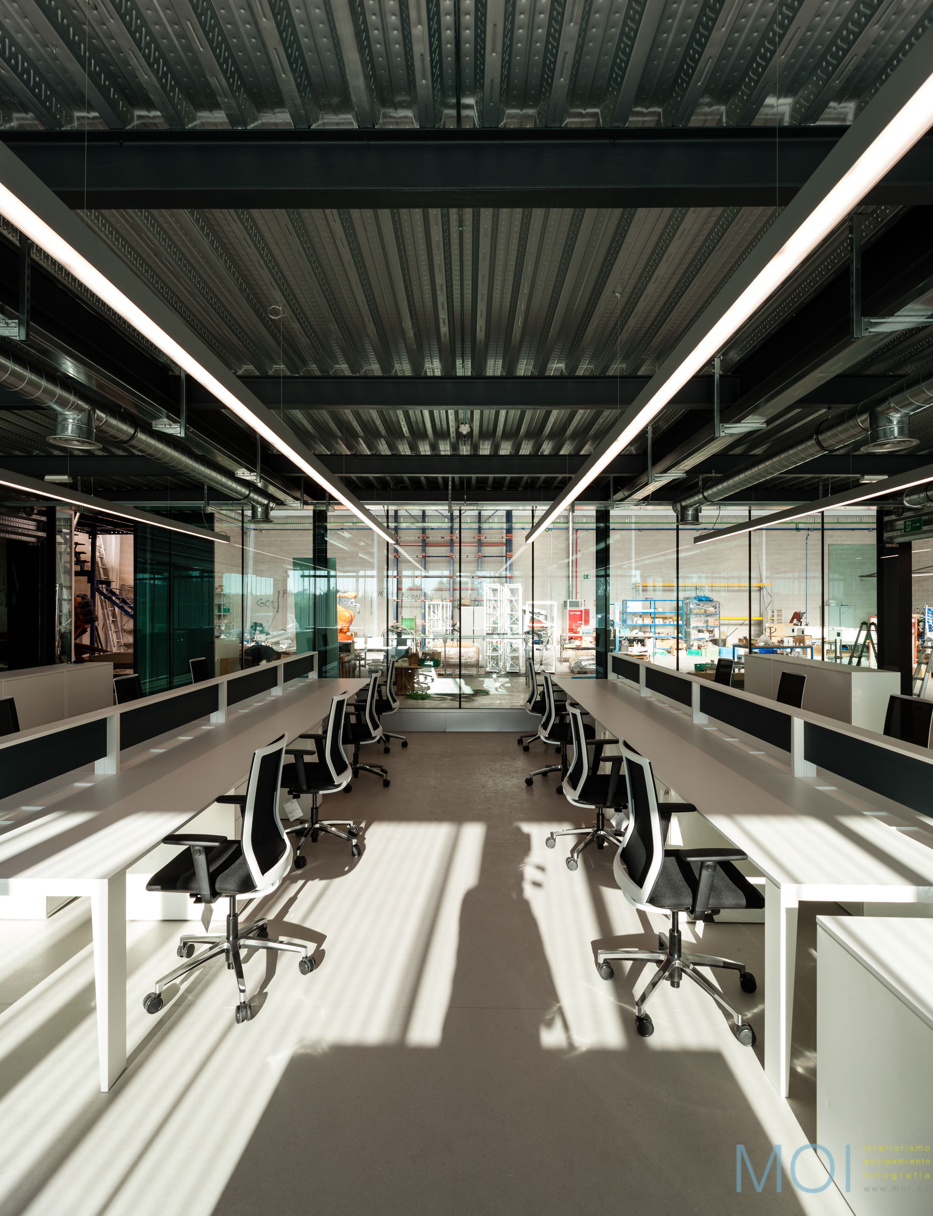 El carácter industrial y de contenedor se refuerza mediante el uso de instalaciones vistas, o dejando el forjado de chapa colaborante también visto.