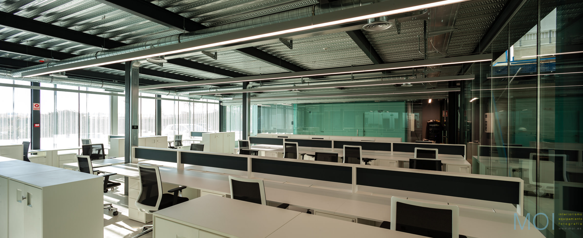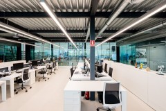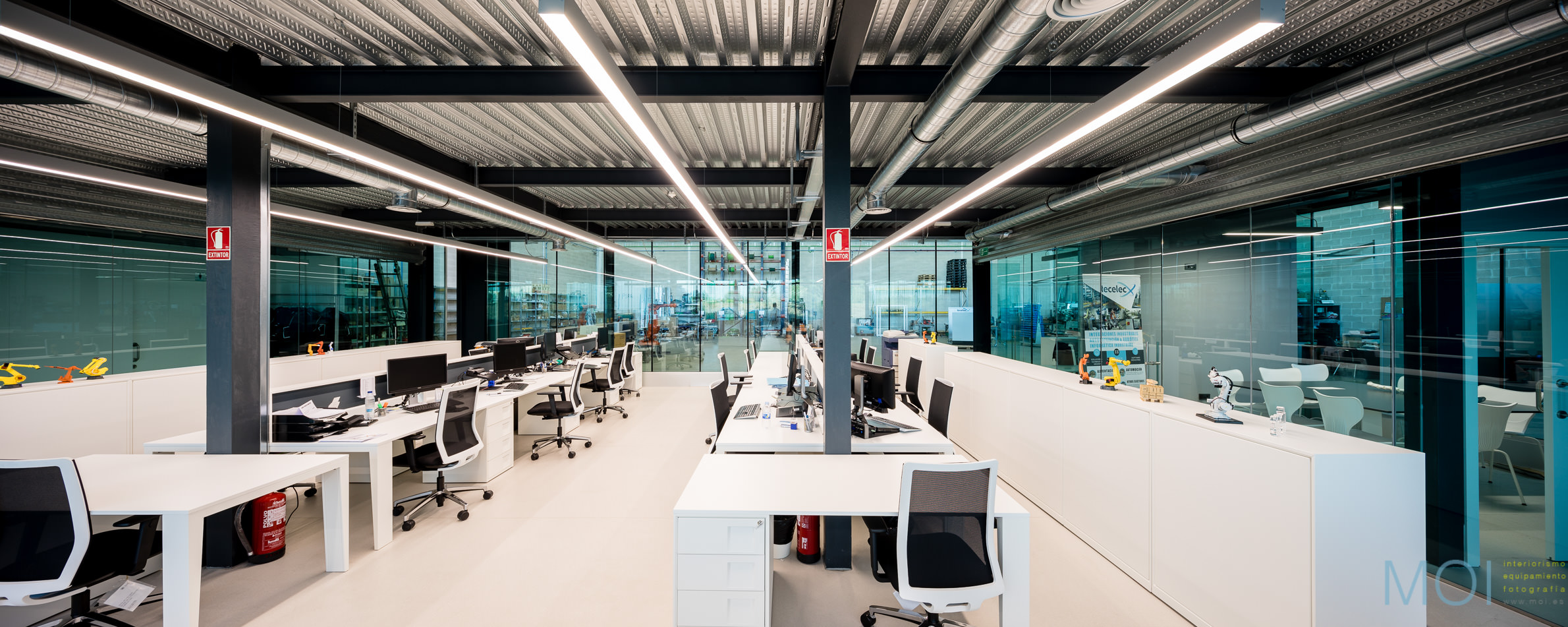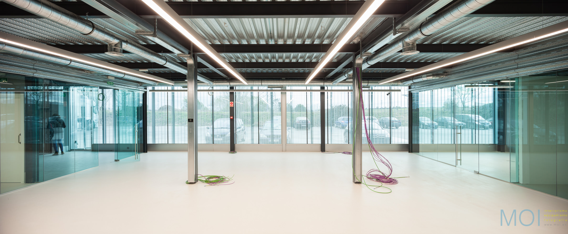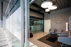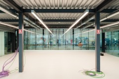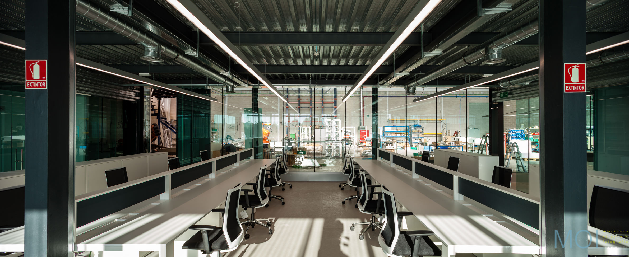 El carácter industrial y de contenedor se refuerza mediante el uso de instalaciones vistas, o dejando el forjado de chapa colaborante también visto.