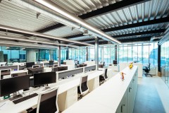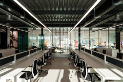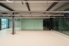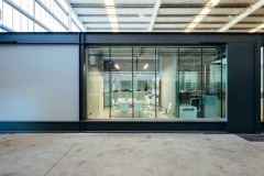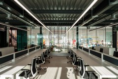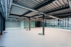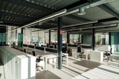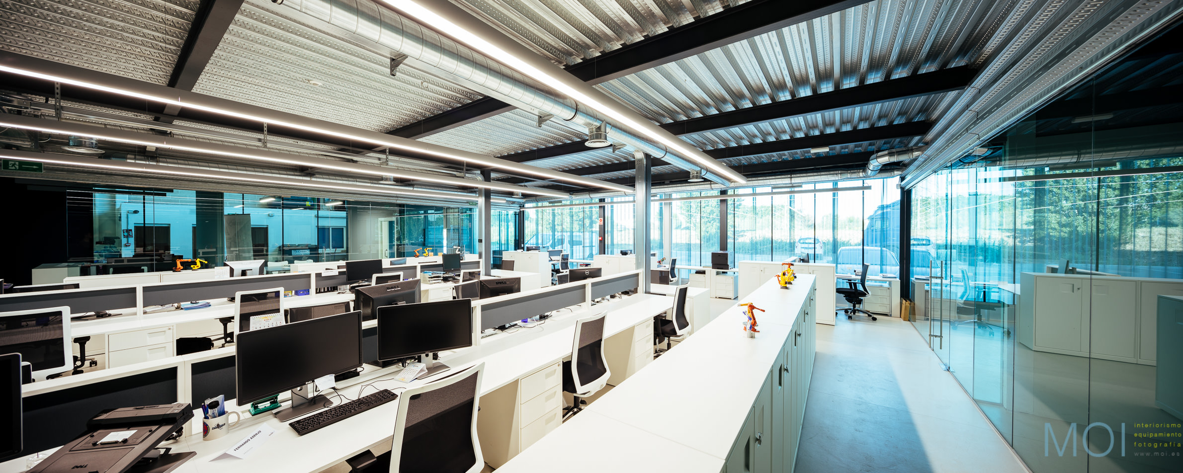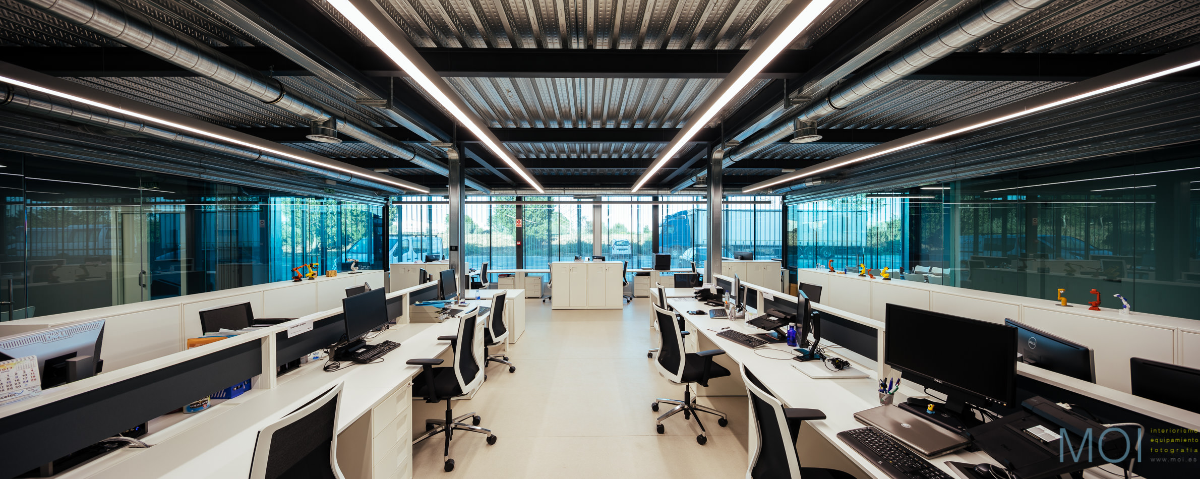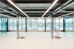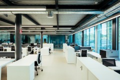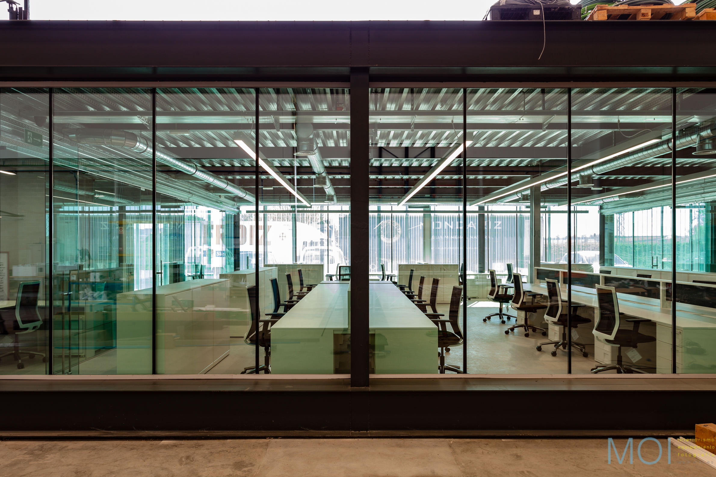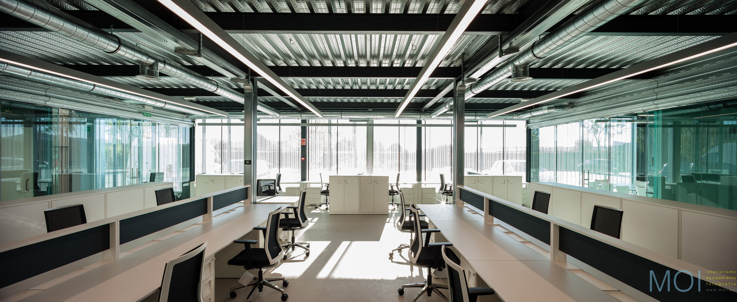 El carácter industrial y de contenedor se refuerza mediante el uso de instalaciones vistas, o dejando el forjado de chapa colaborante también visto.