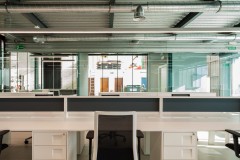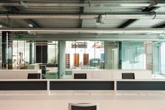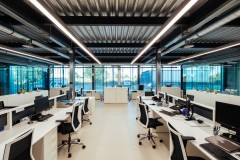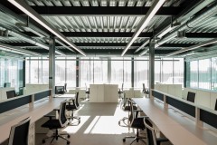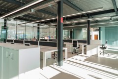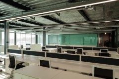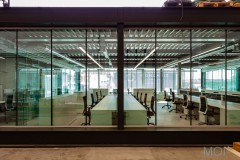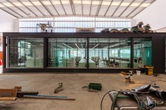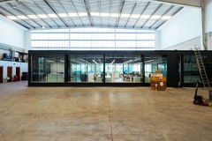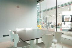 A este gran espacio están adosadas las piezas que requieren mayor privacidad: salas de reuniones, aseos y oficina de control del taller, pero se separan por ligeras divisiones de vidrio que permiten la expansión visual de la gran sala a las adyacentes.
