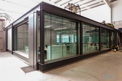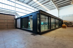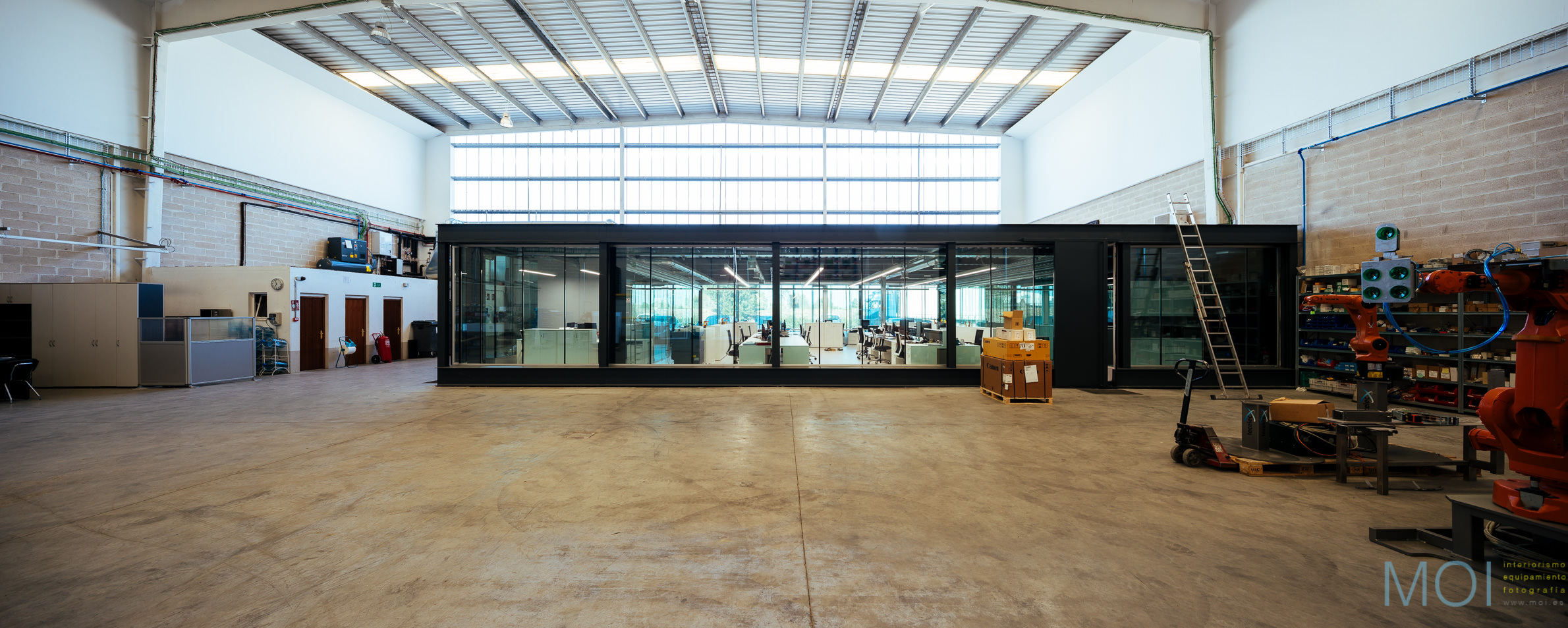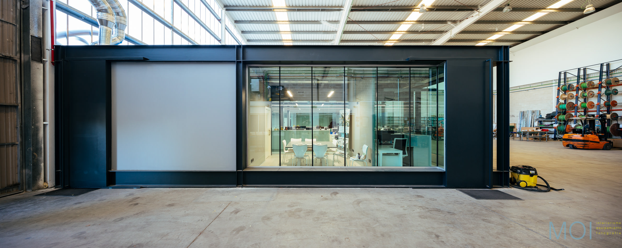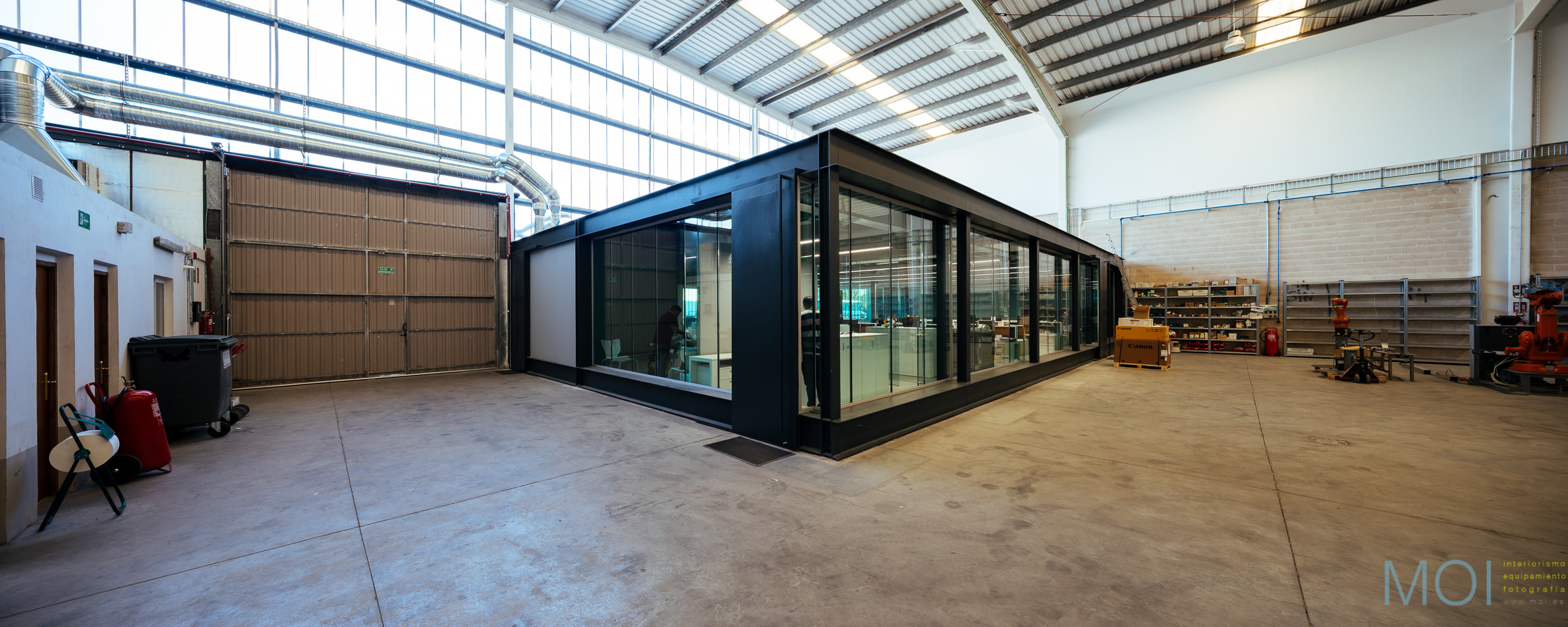 En él, una pieza-contenedor colocada en una gran nave, como si de un objeto se tratase, genera un espacio de trabajo diáfano organizado por el propio mobiliario.