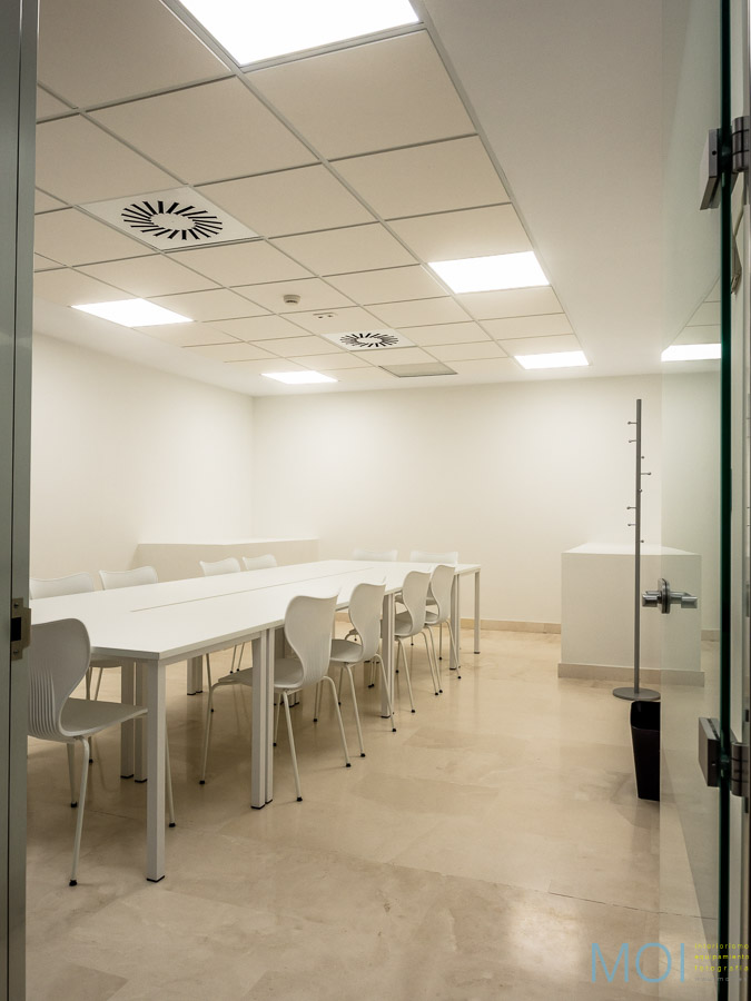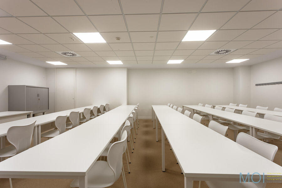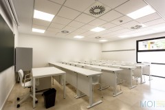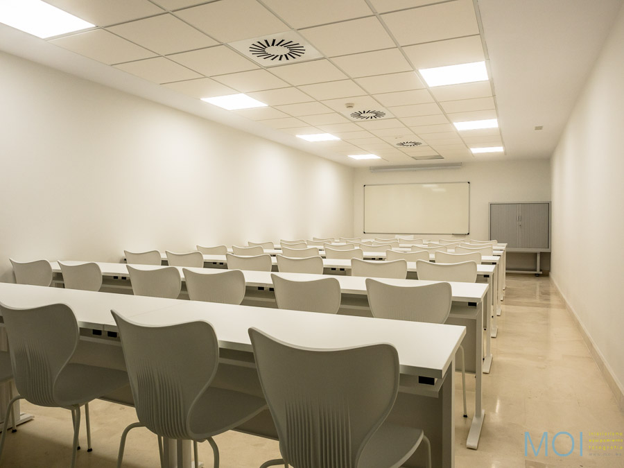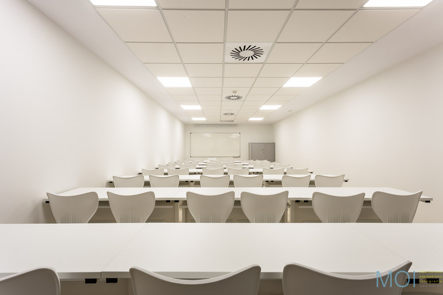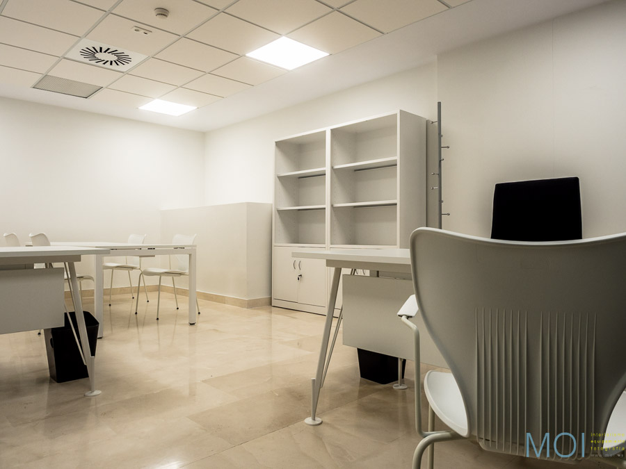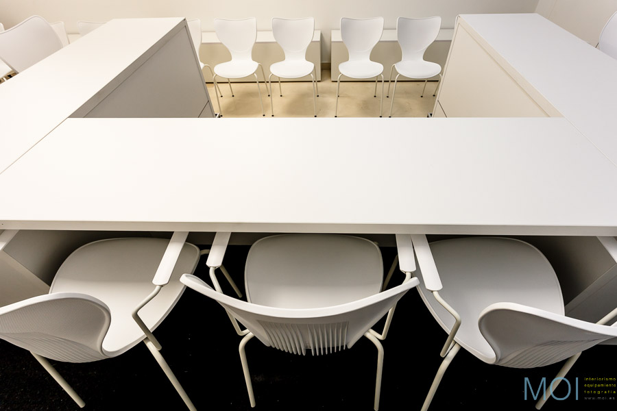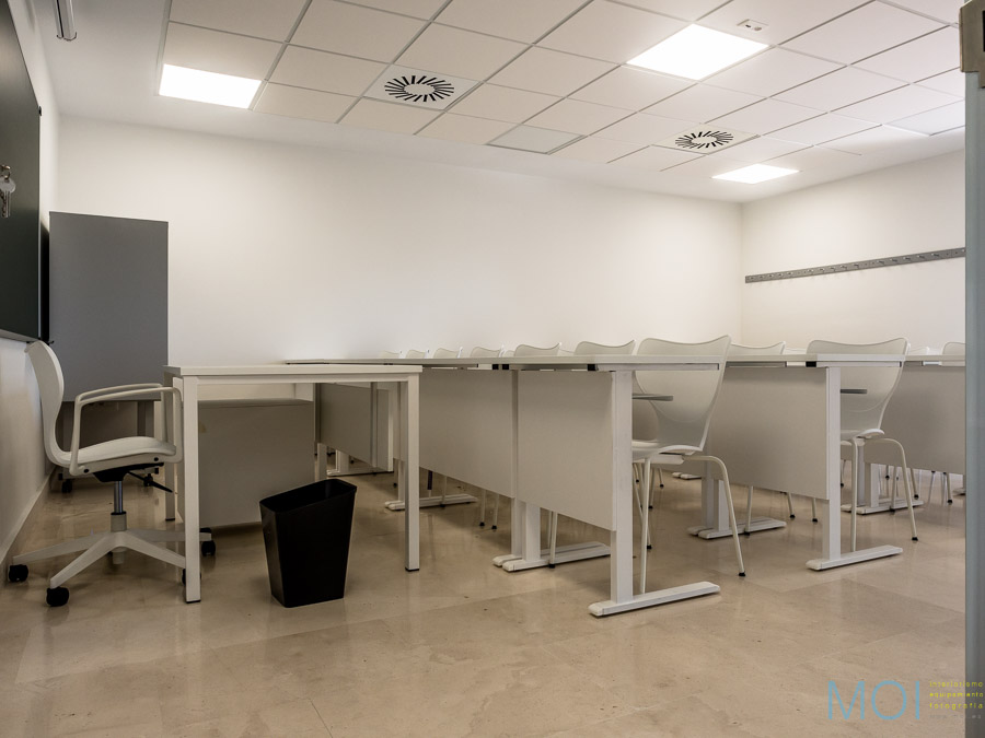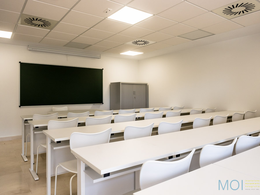 Amueblamiento de la nueva zona de Seminarios en la Facultad de Derecho de la Universidad de Salamanca. MOI fue la empresa encargada de suministrar e instalar las mamparas divisorias y las cabinas fenólicas en la fase de obra. Posteriormente también se adjudicó el amueblamiento de estos espacios. Se ha optado por un mobiliario altamente resistente al uso, funcional y que transmita una sensación de ligereza y luminosidad muy necesaria dadas las condicionantes de su ubicación. Un ejemplo de recuperación de unos espacios en principio residuales que gracias a una inteligente redistribución, acondicionamiento y aprovechamiento por parte de la Dirección Facultativa ofrece a la Facultad de Derecho una zona de expansión con nuevos usos sin necesidad de ampliar el edificio existente.