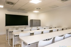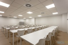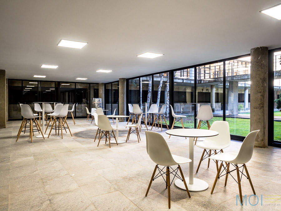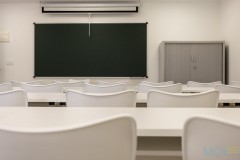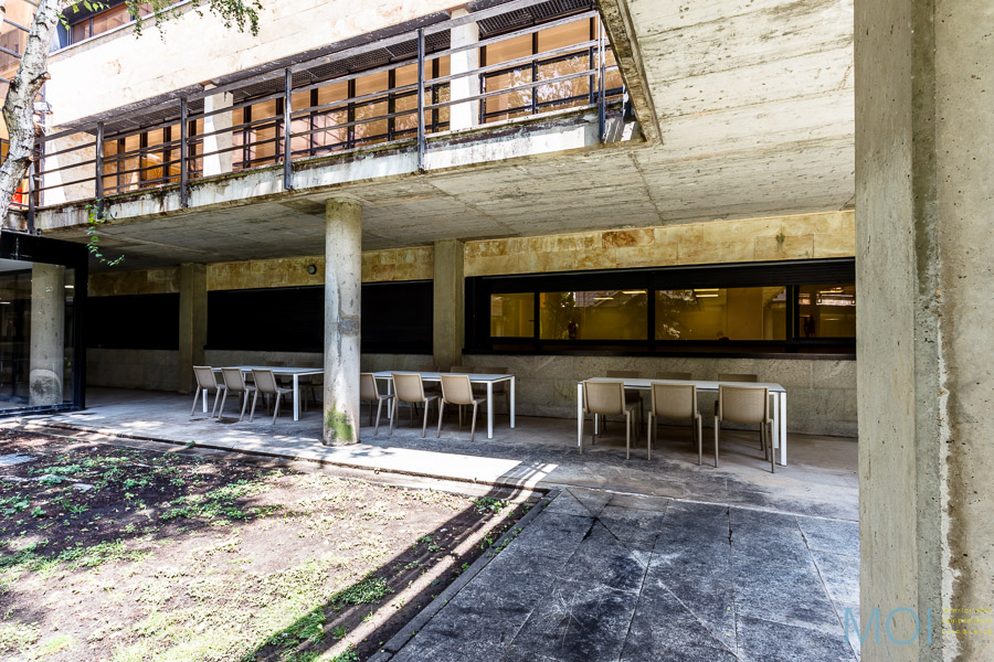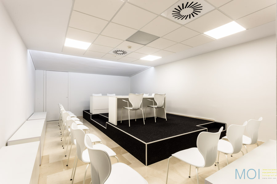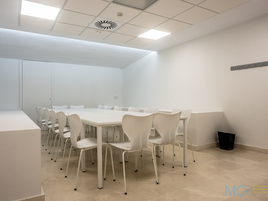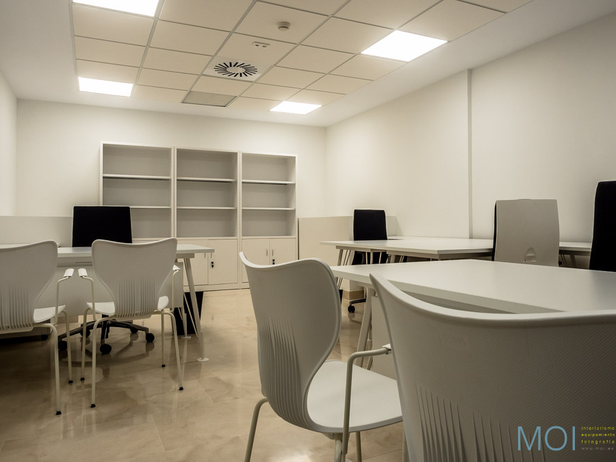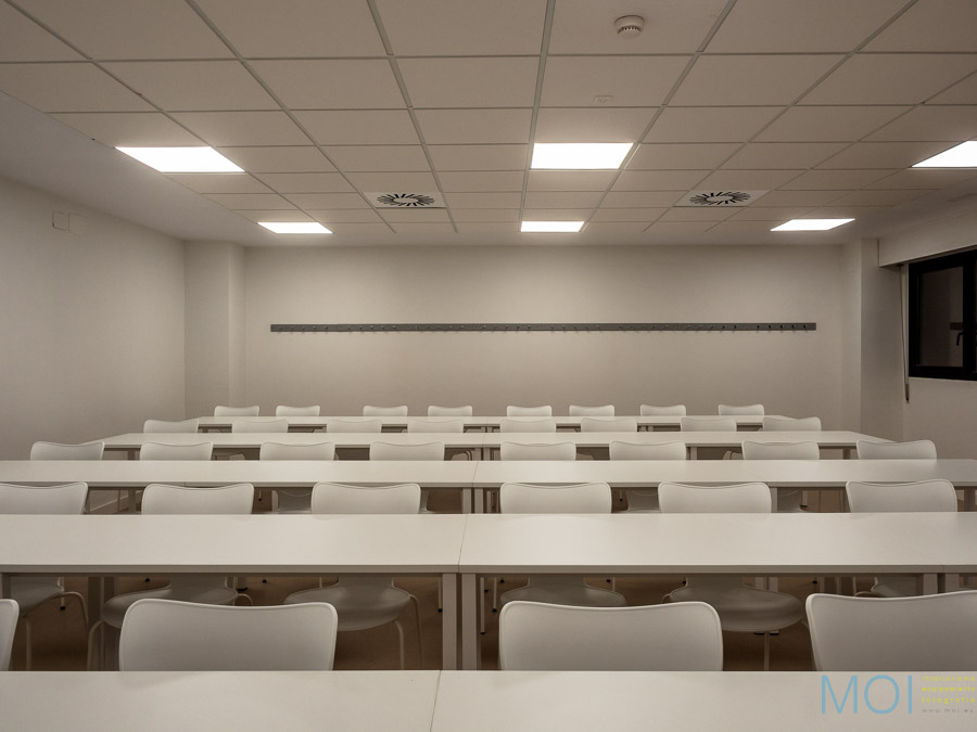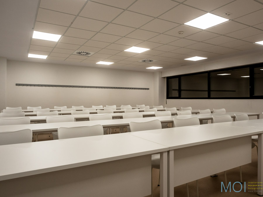 Amueblamiento de la nueva zona de Seminarios en la Facultad de Derecho de la Universidad de Salamanca. MOI fue la empresa encargada de suministrar e instalar las mamparas divisorias y las cabinas fenólicas en la fase de obra. Posteriormente también se adjudicó el amueblamiento de estos espacios. Se ha optado por un mobiliario altamente resistente al uso, funcional y que transmita una sensación de ligereza y luminosidad muy necesaria dadas las condicionantes de su ubicación. Un ejemplo de recuperación de unos espacios en principio residuales que gracias a una inteligente redistribución, acondicionamiento y aprovechamiento por parte de la Dirección Facultativa ofrece a la Facultad de Derecho una zona de expansión con nuevos usos sin necesidad de ampliar el edificio existente.