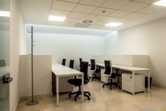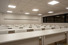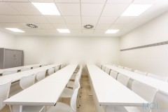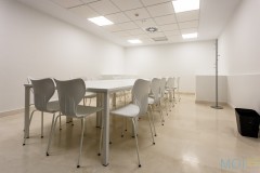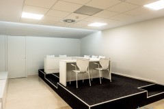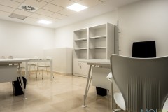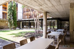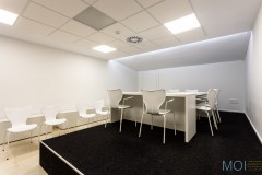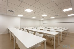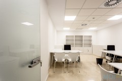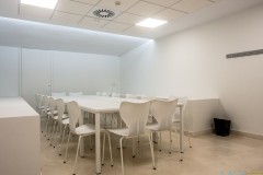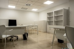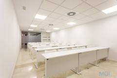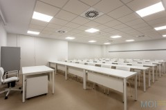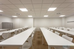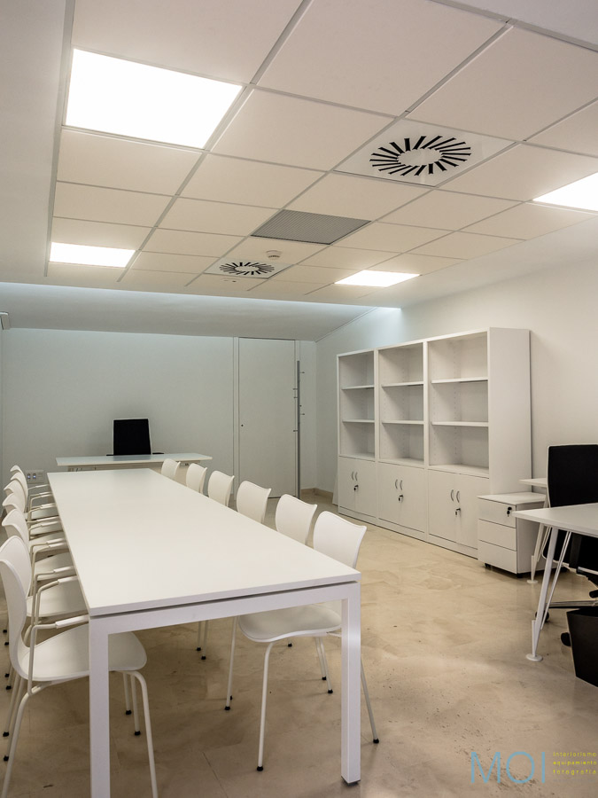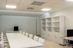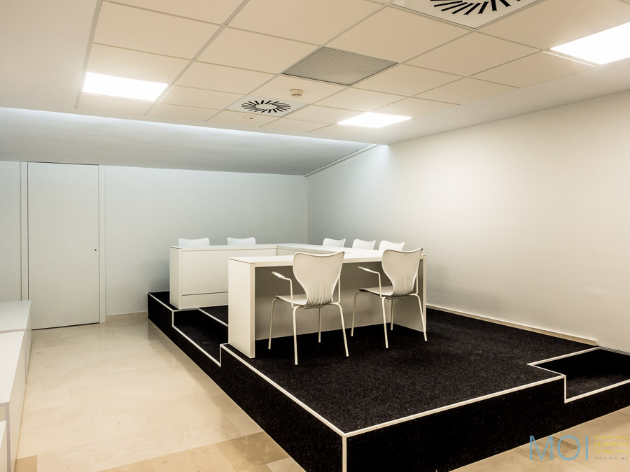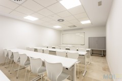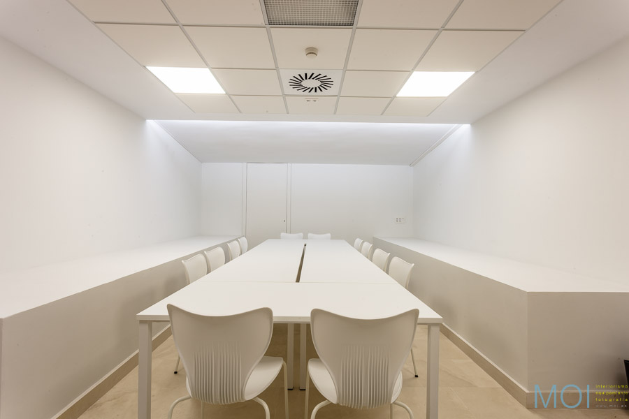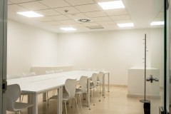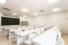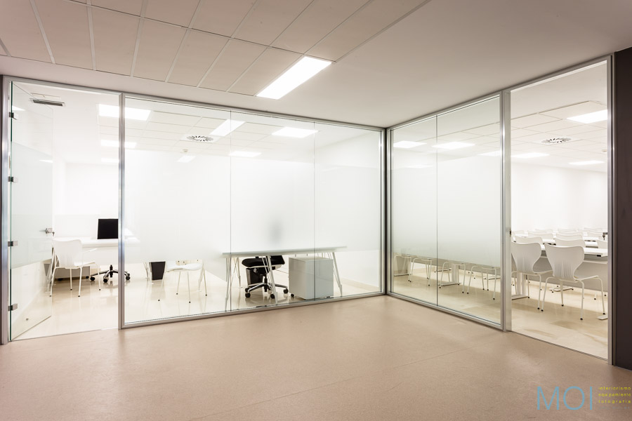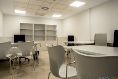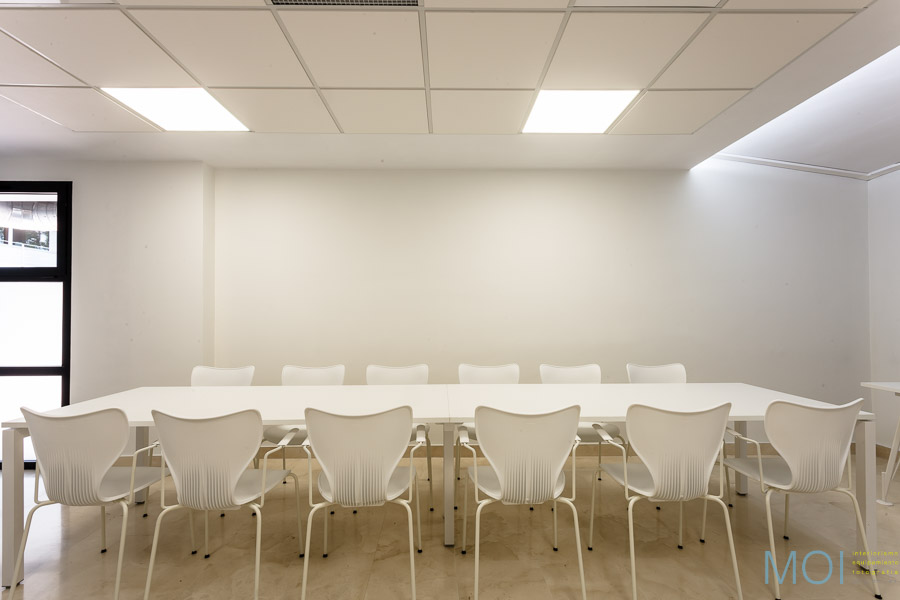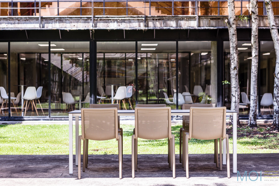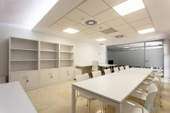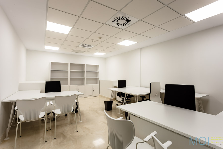 Amueblamiento de la nueva zona de Seminarios en la Facultad de Derecho de la Universidad de Salamanca. MOI fue la empresa encargada de suministrar e instalar las mamparas divisorias y las cabinas fenólicas en la fase de obra. Posteriormente también se adjudicó el amueblamiento de estos espacios. Se ha optado por un mobiliario altamente resistente al uso, funcional y que transmita una sensación de ligereza y luminosidad muy necesaria dadas las condicionantes de su ubicación. Un ejemplo de recuperación de unos espacios en principio residuales que gracias a una inteligente redistribución, acondicionamiento y aprovechamiento por parte de la Dirección Facultativa ofrece a la Facultad de Derecho una zona de expansión con nuevos usos sin necesidad de ampliar el edificio existente.